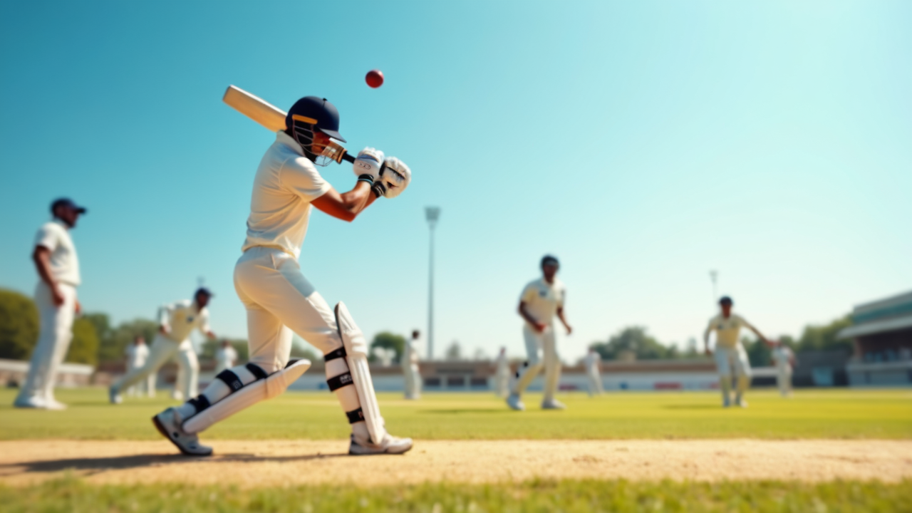 action shot athleticism Cricket pitch professional match Cricket batsman fast ball mid-swing powerful hit sports energy ball in the air