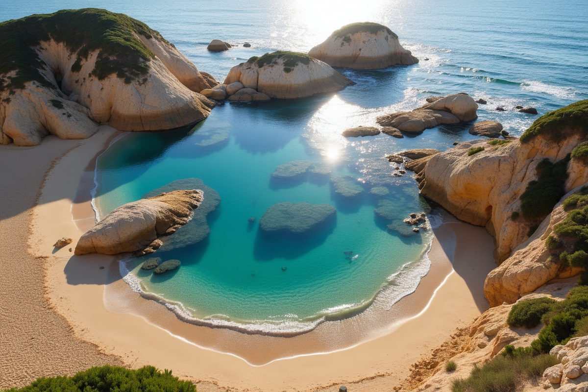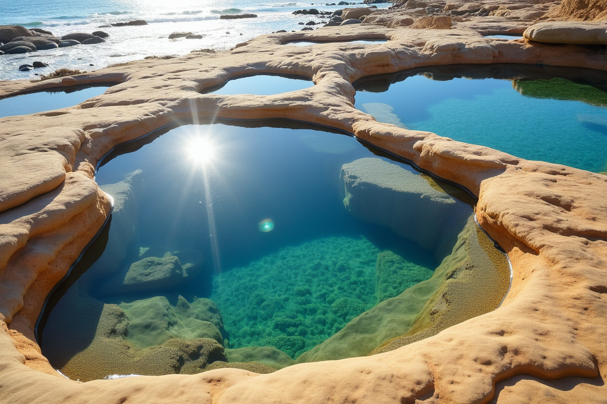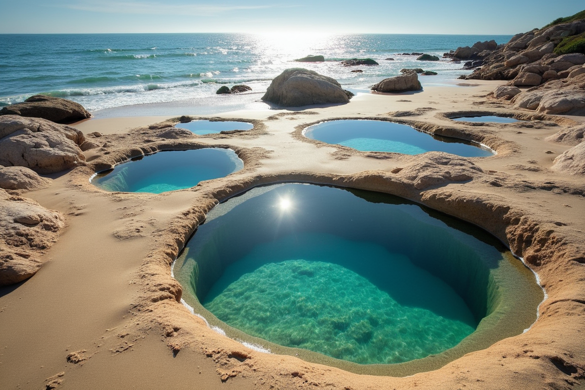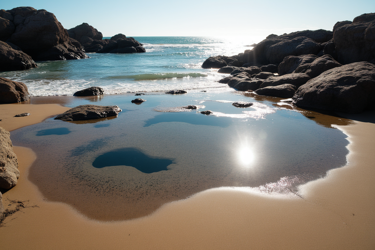 beach ocean tranquil setting sandy shore beach scene sunlight reflections rock pools