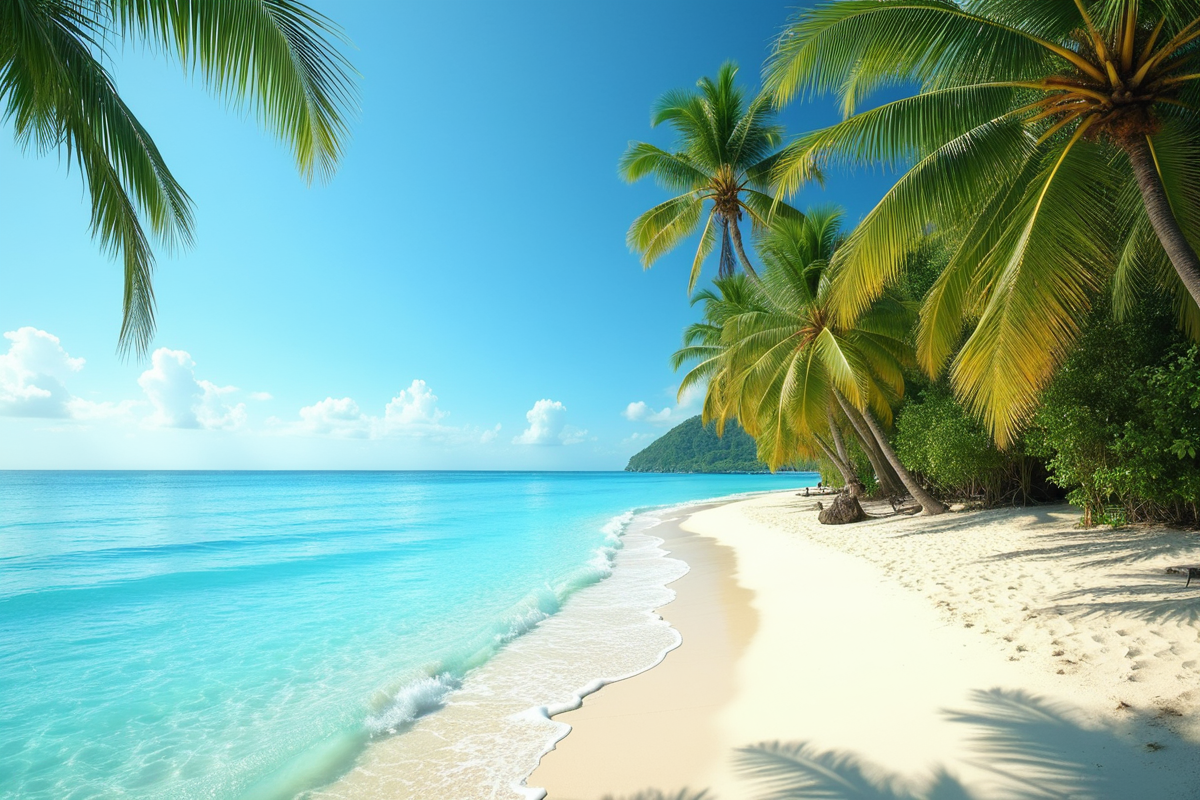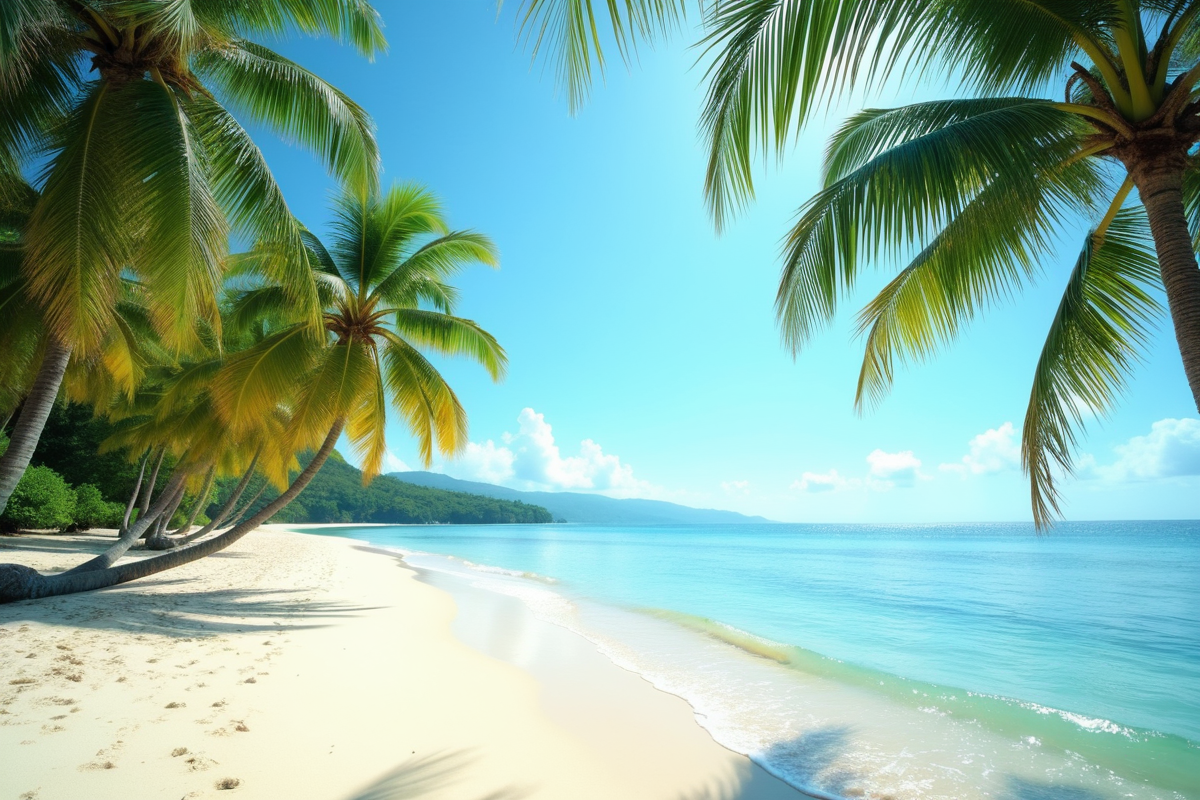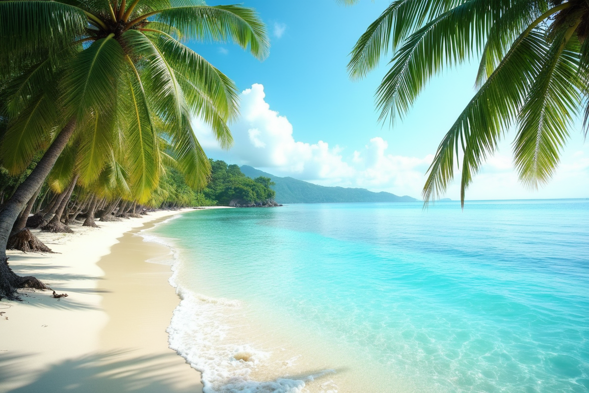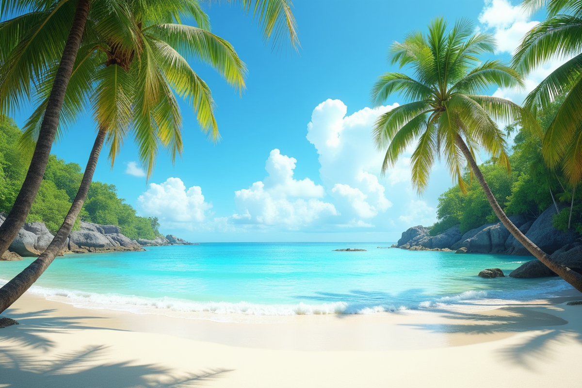 sunny sky tropical beach peaceful setting lush palm trees calm turquoise water