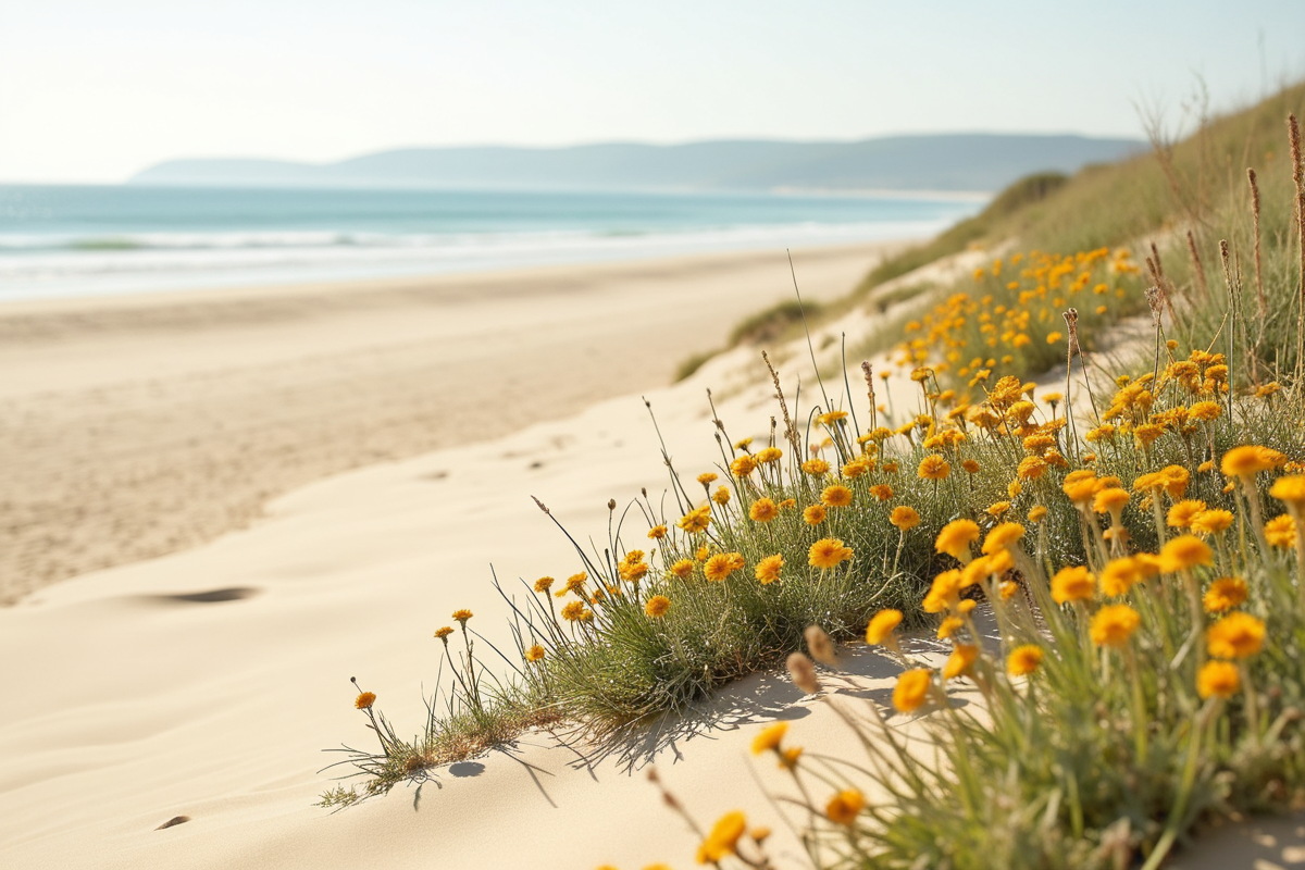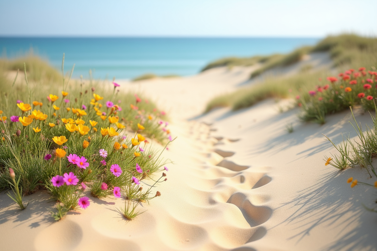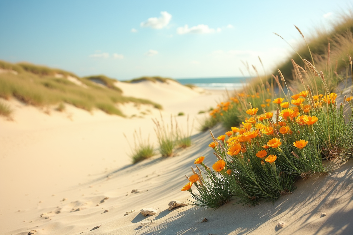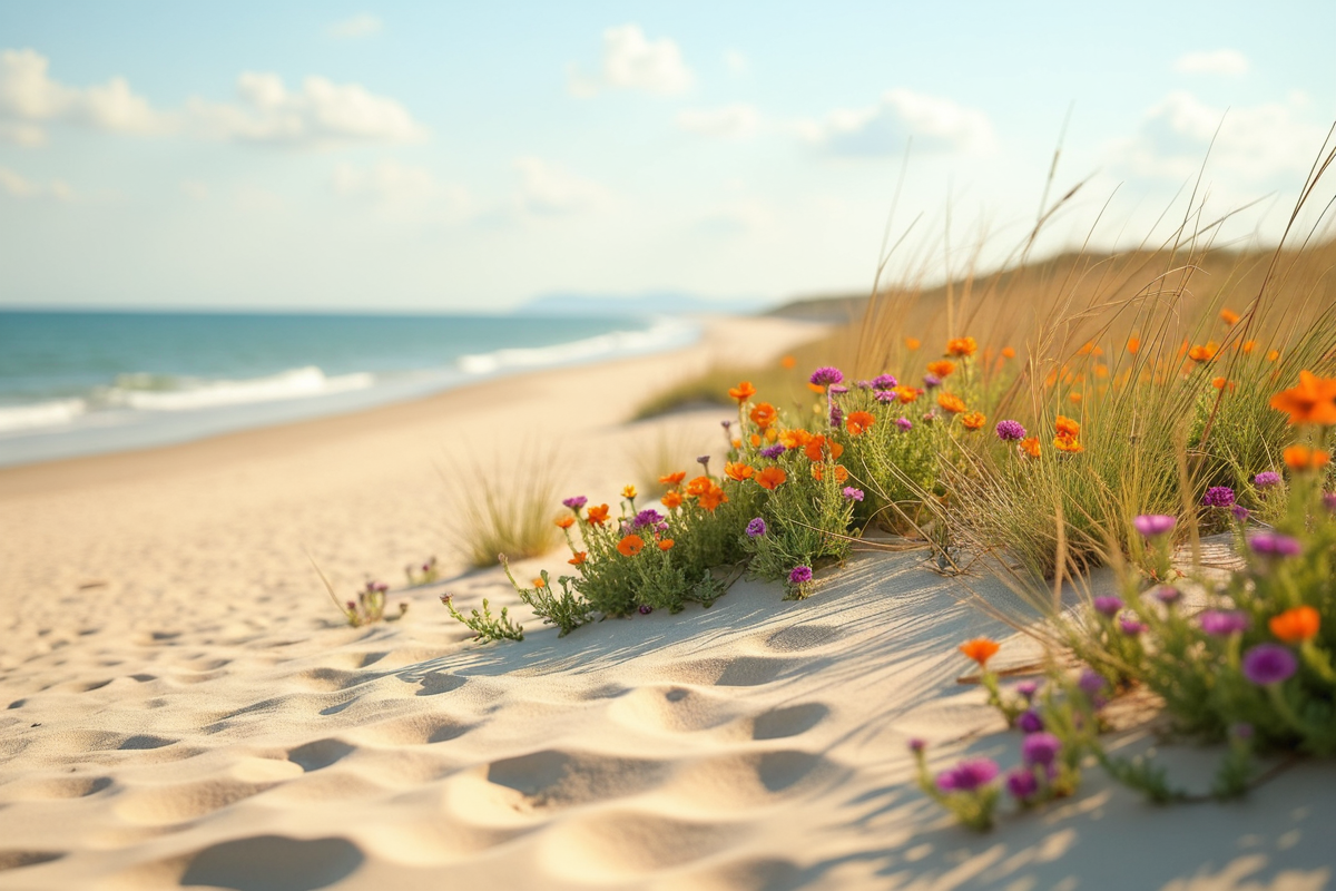 sunny sky tranquil setting sand beach rolling dunes coastal wildflowers