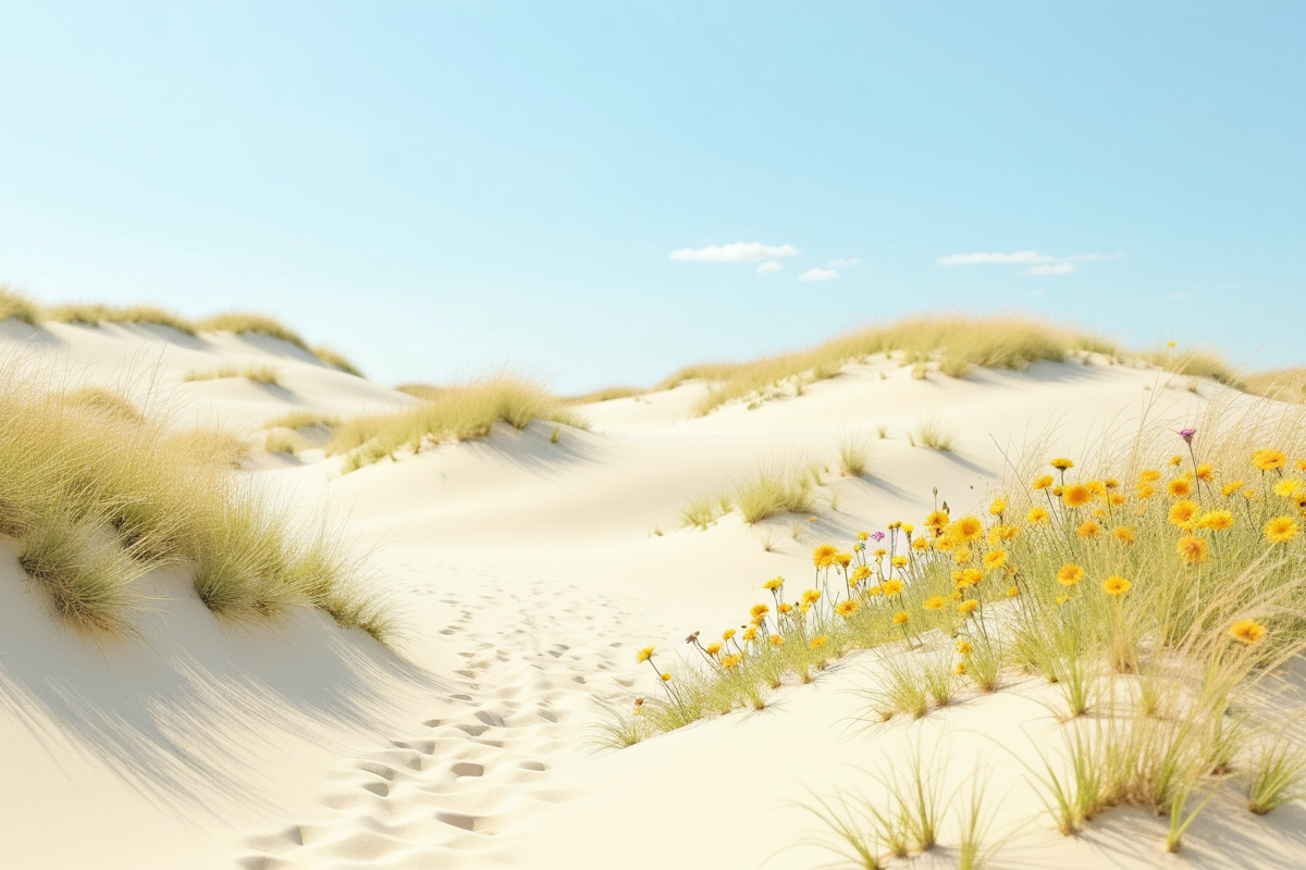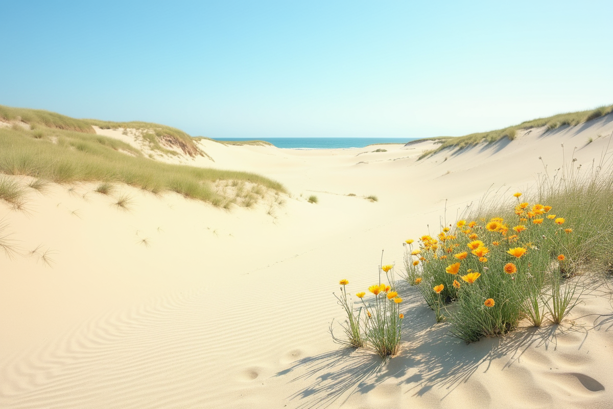 serene setting sandy beach rolling dunes bright sunlight coastal wildflowers