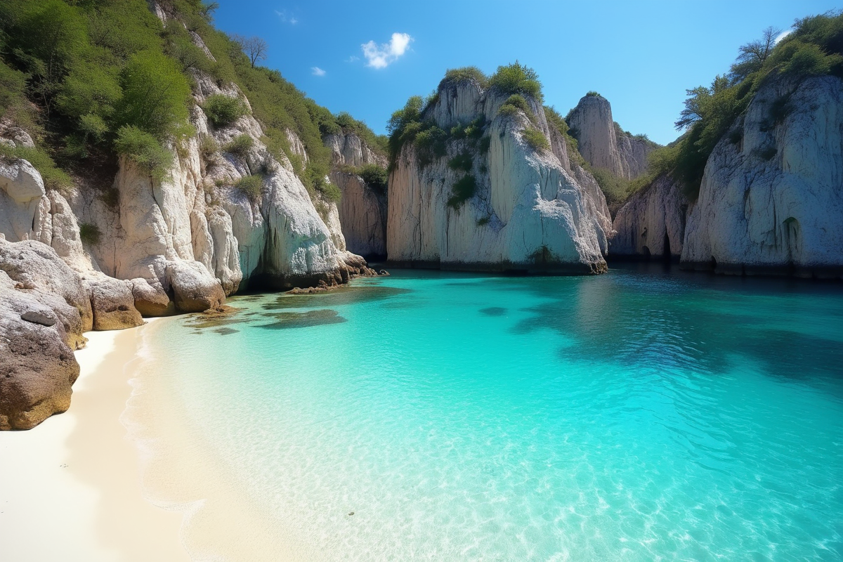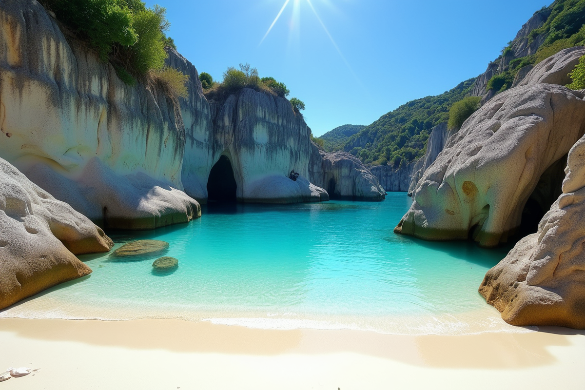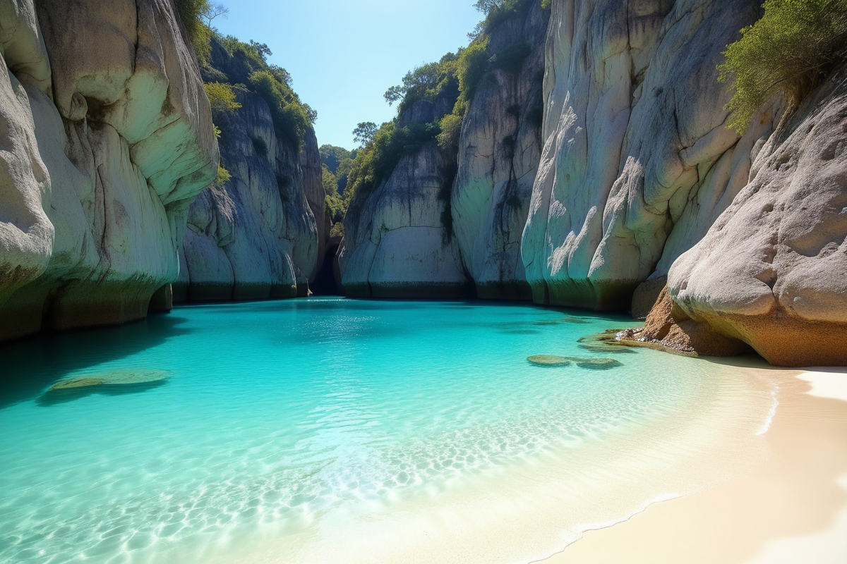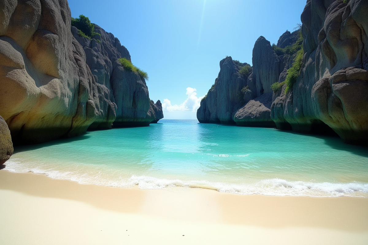 secluded beach bright sunlight clear lagoon scenic rocks tranquil retreat