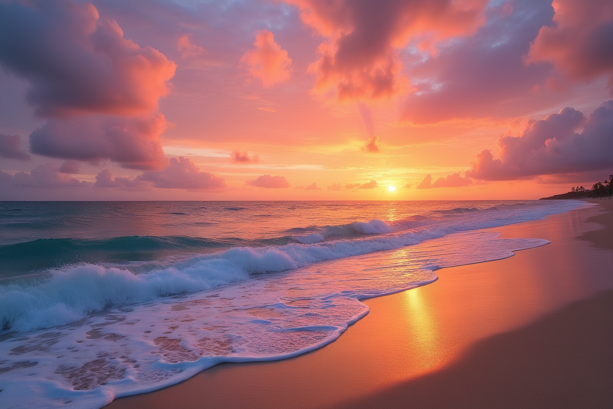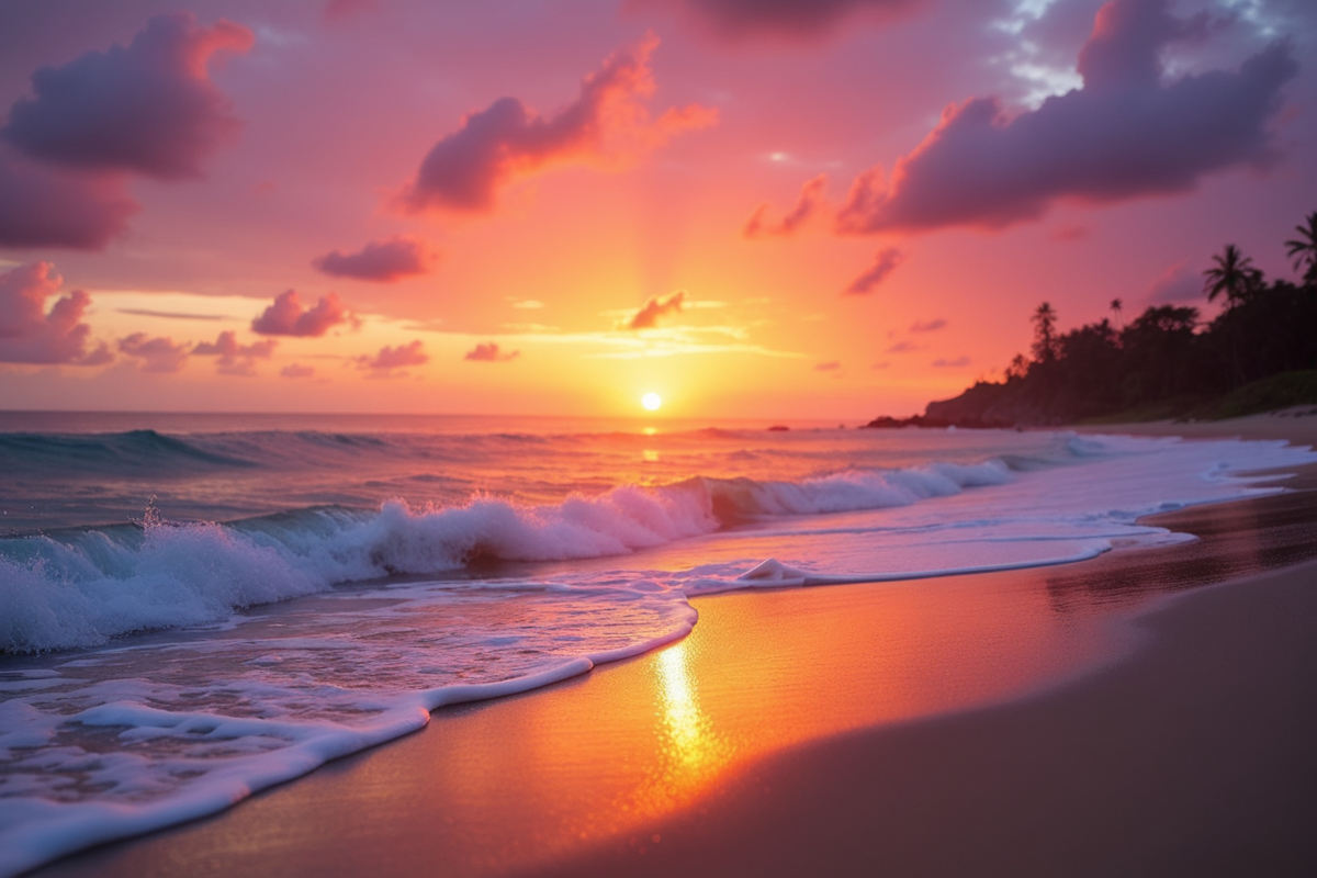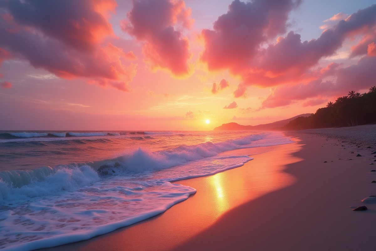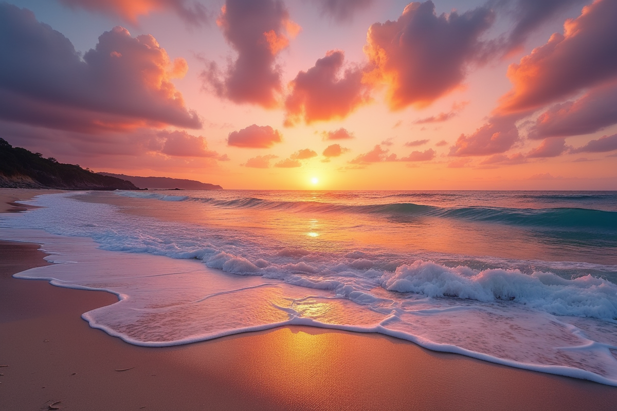 tranquil setting gentle surf sunset beach vibrant sky soft waves