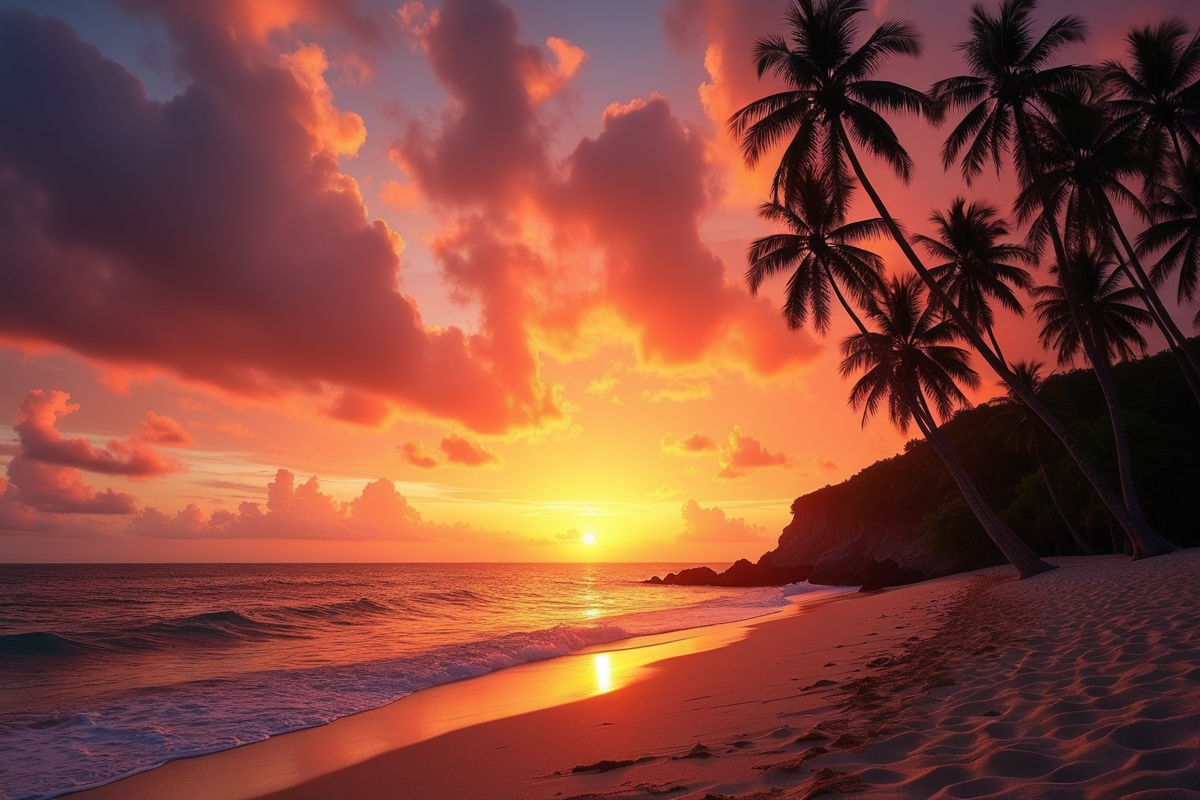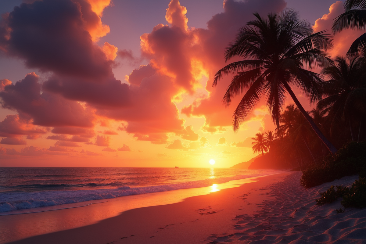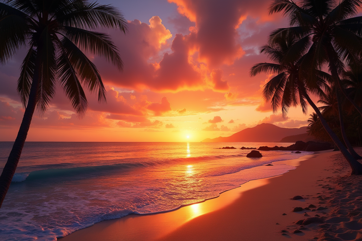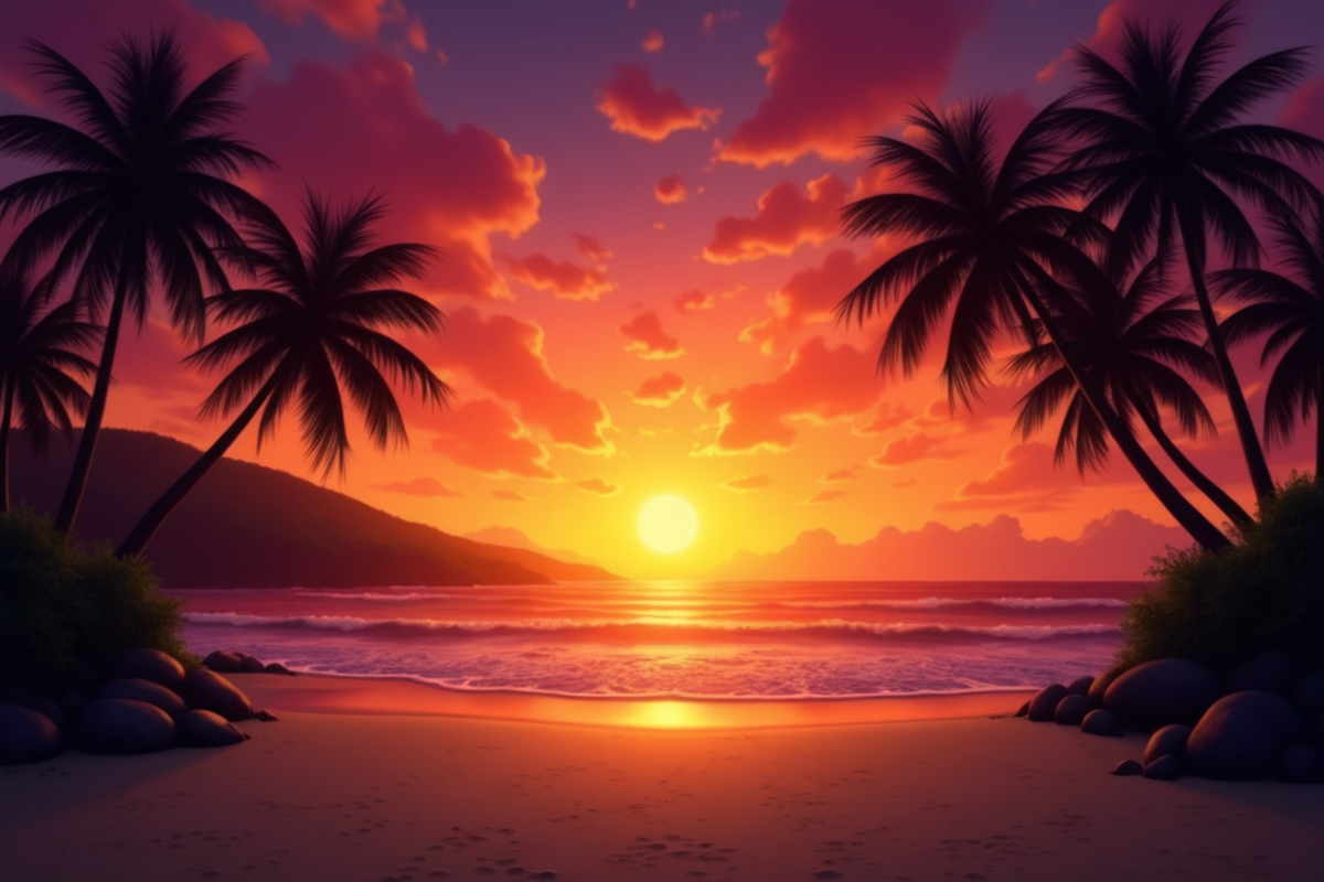 vibrant colors serene atmosphere sunset beach silhouetted palm trees warm light