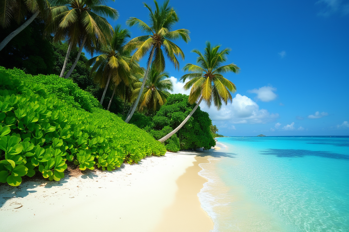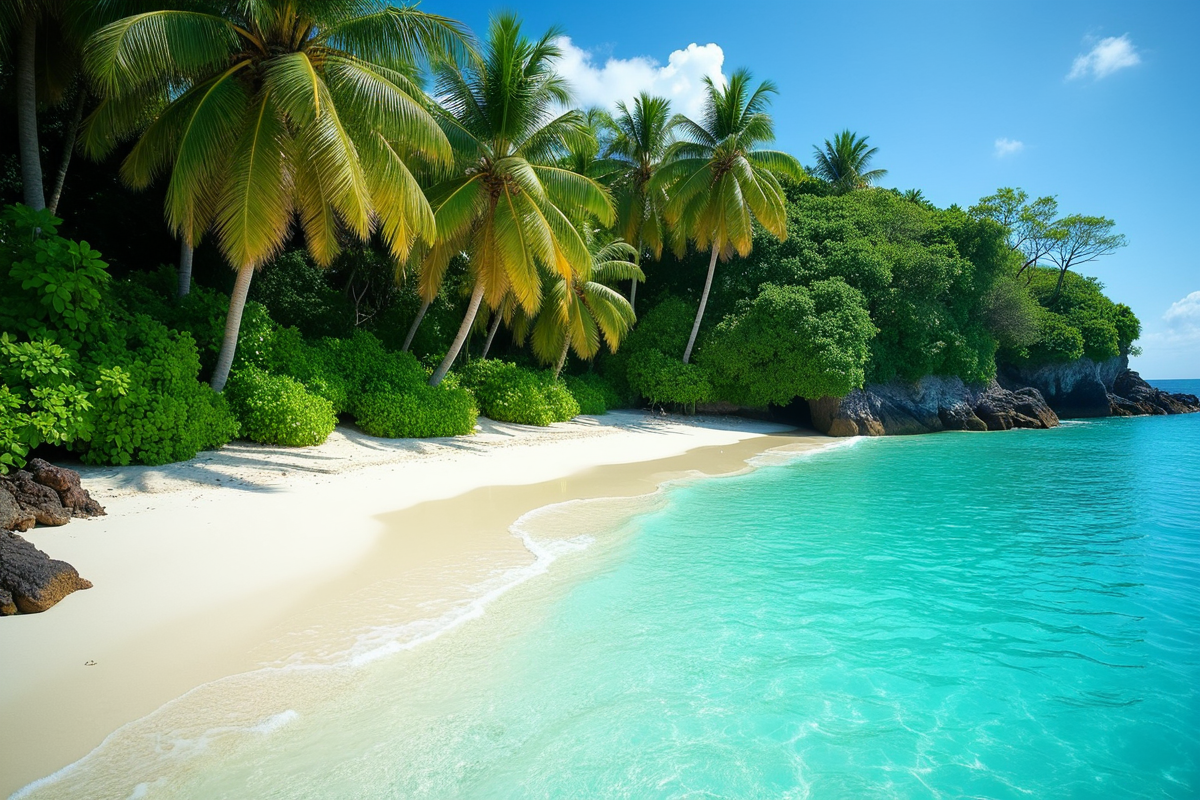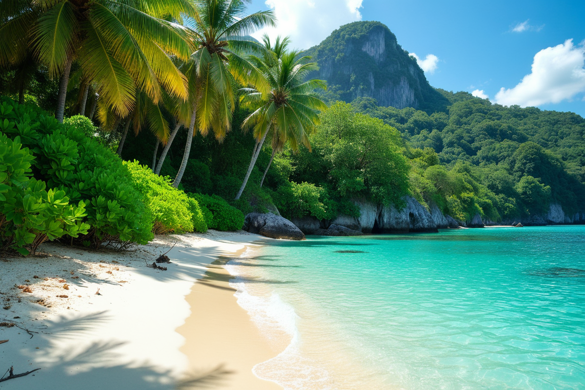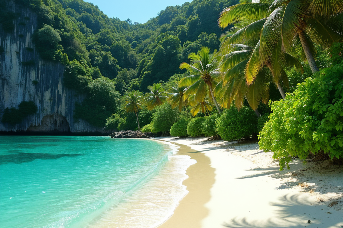 serene environment lush vegetation tropical beach white sand crystal-clear water