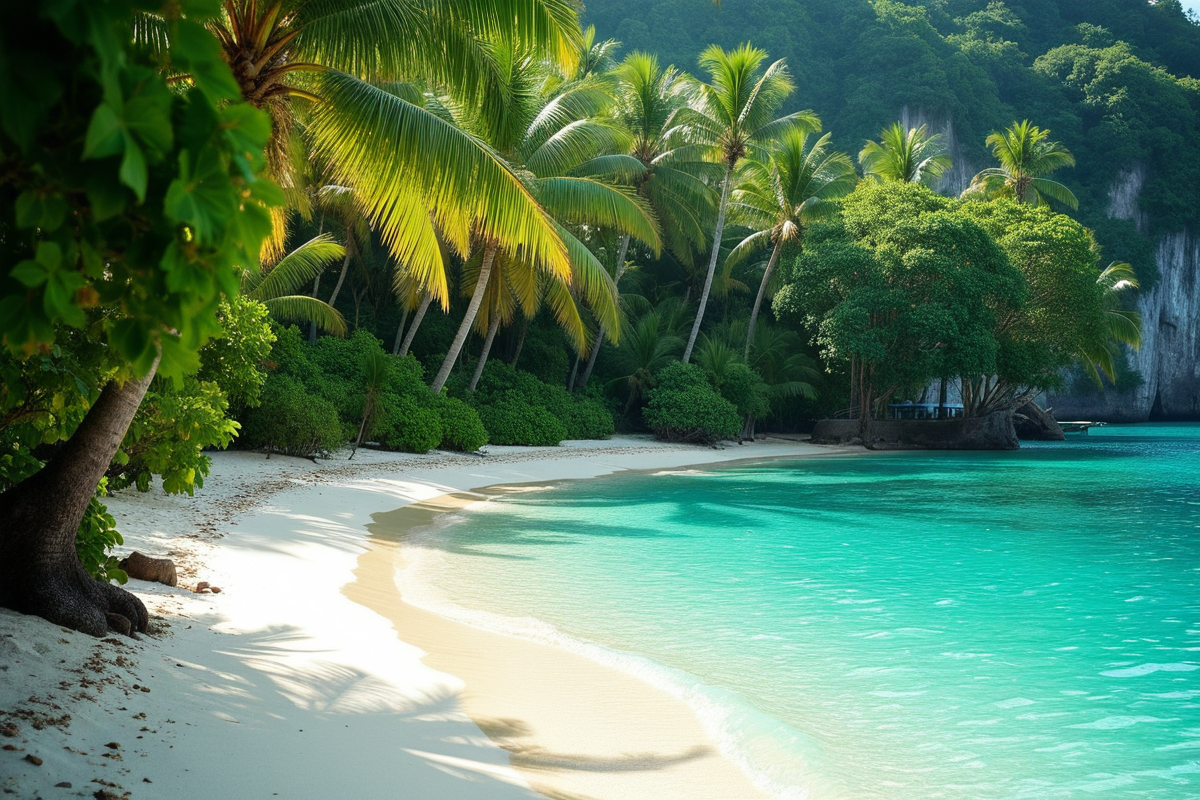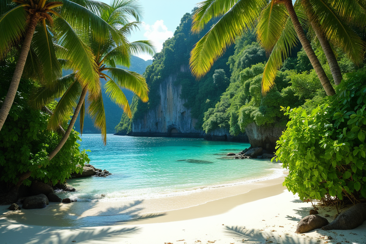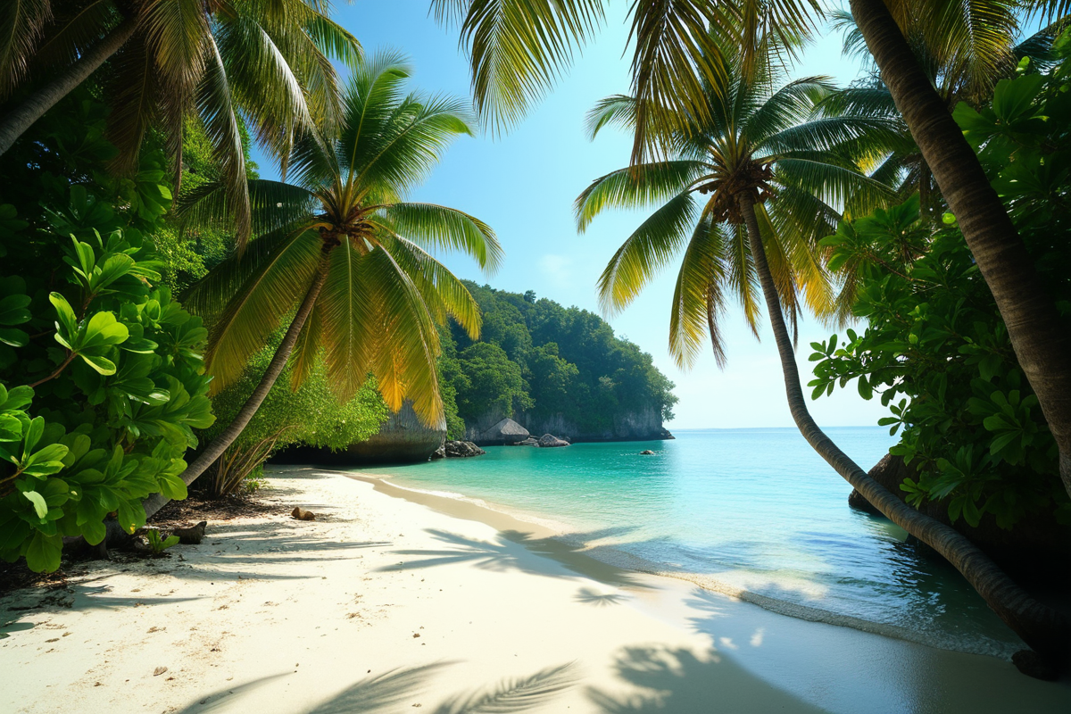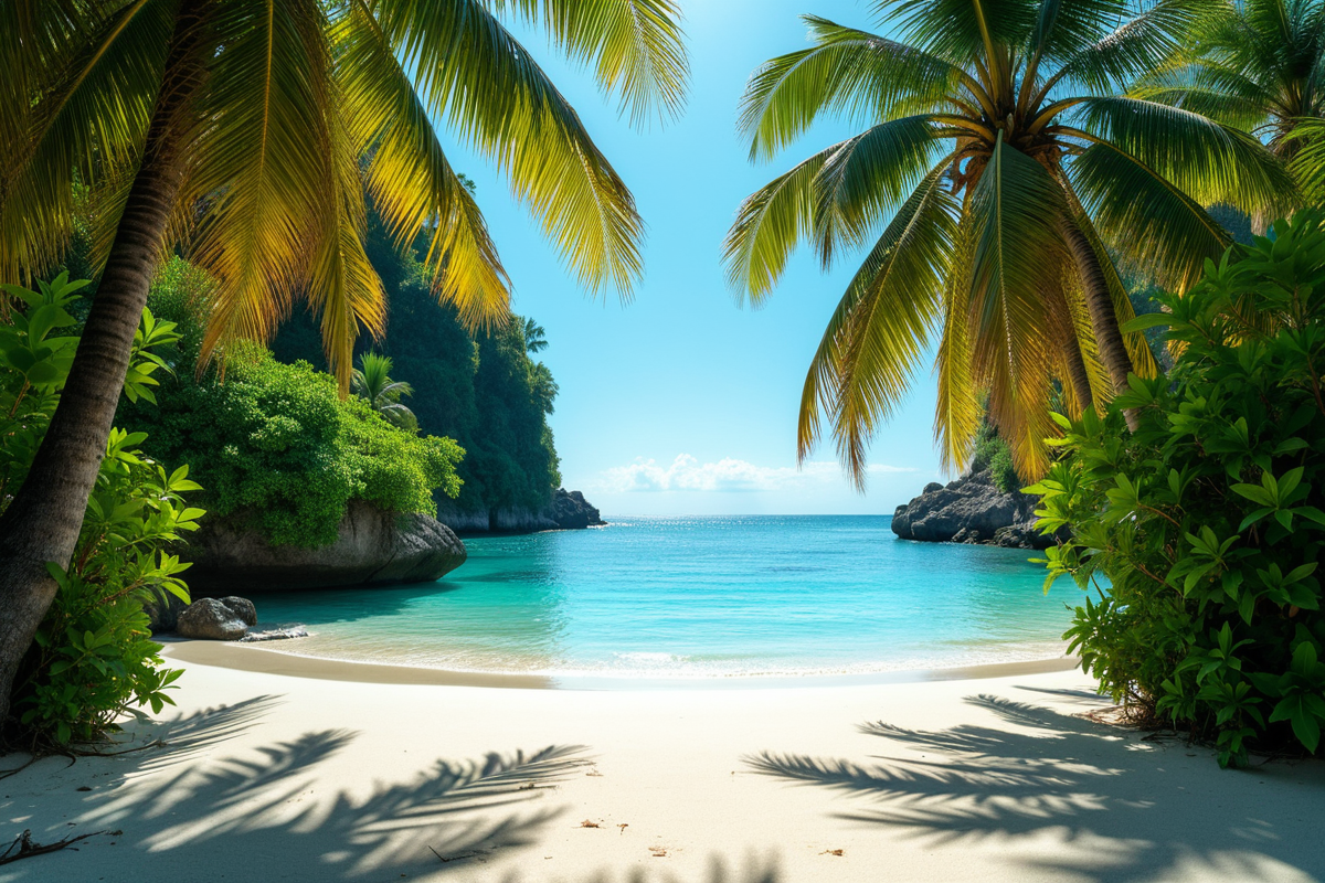 secluded beach serene environment white sand crystal-clear water lush tropical vegetation
