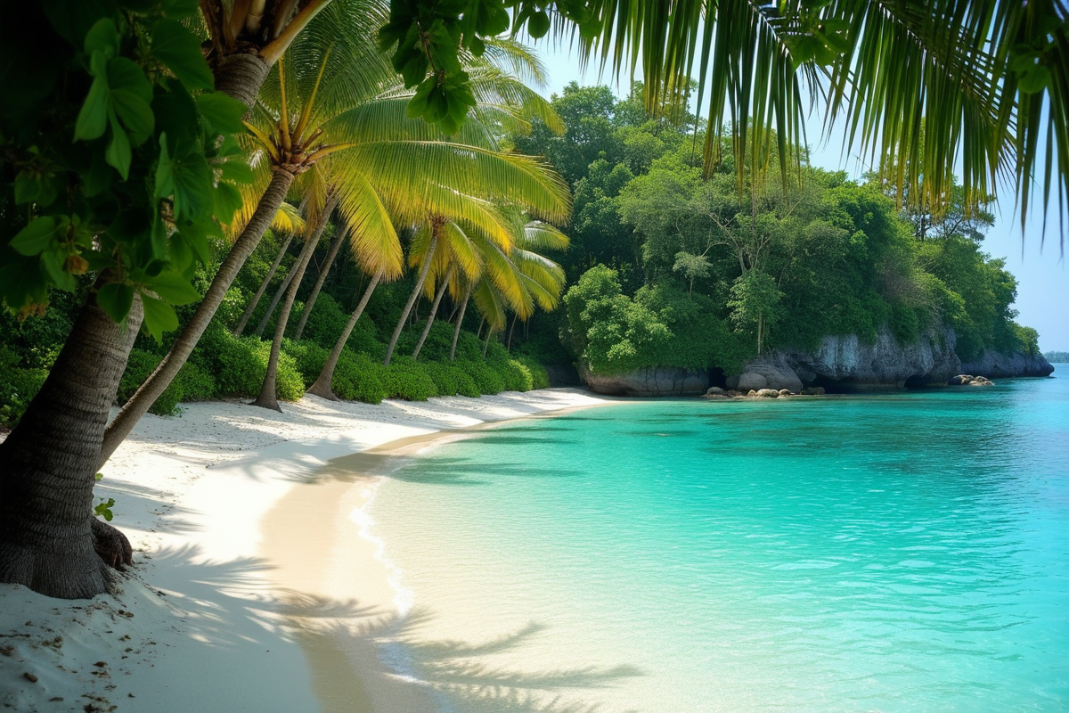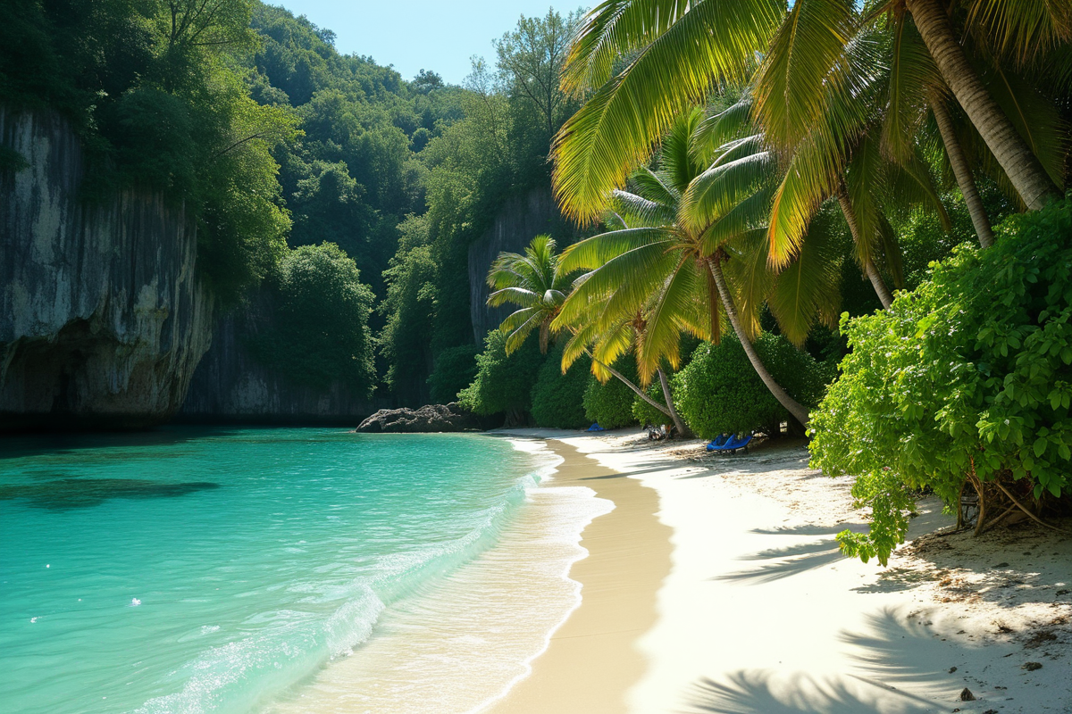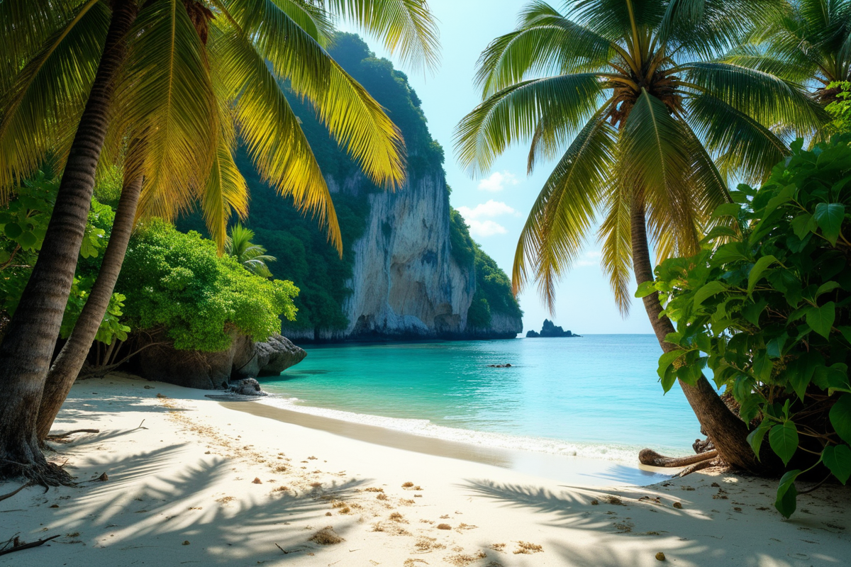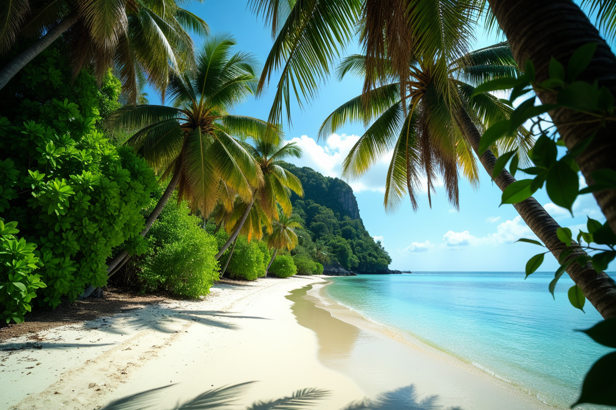 tropical beach lush greenery white sand crystal-clear water peaceful atmosphere