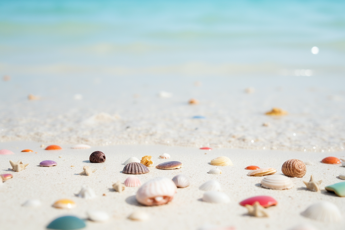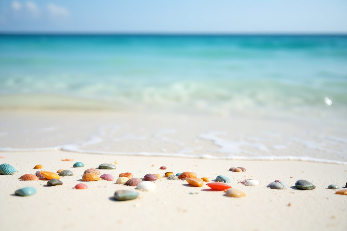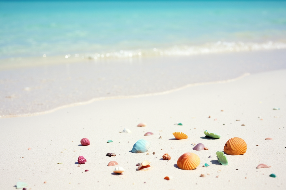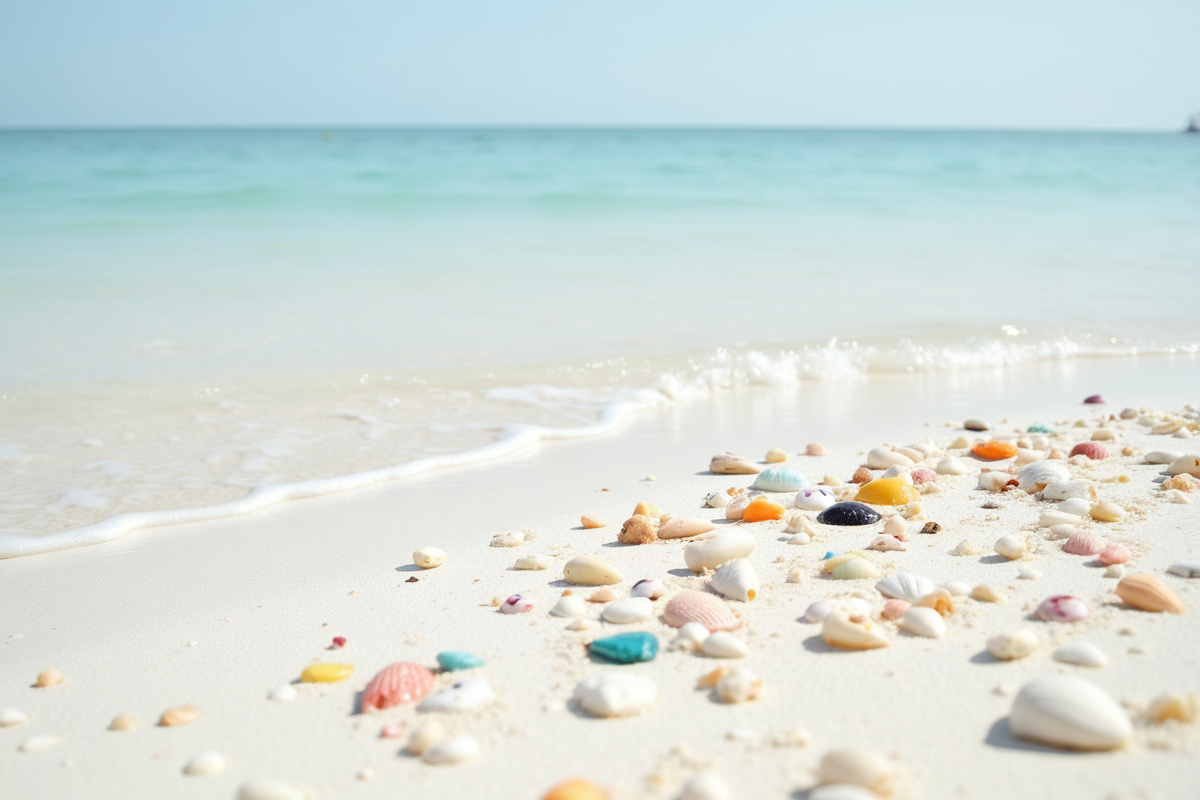 serene beach soft sand natural beauty clear shallow water colorful seashells