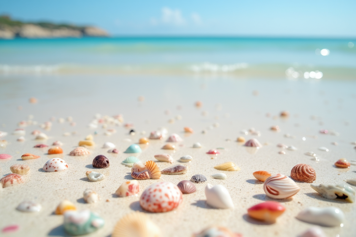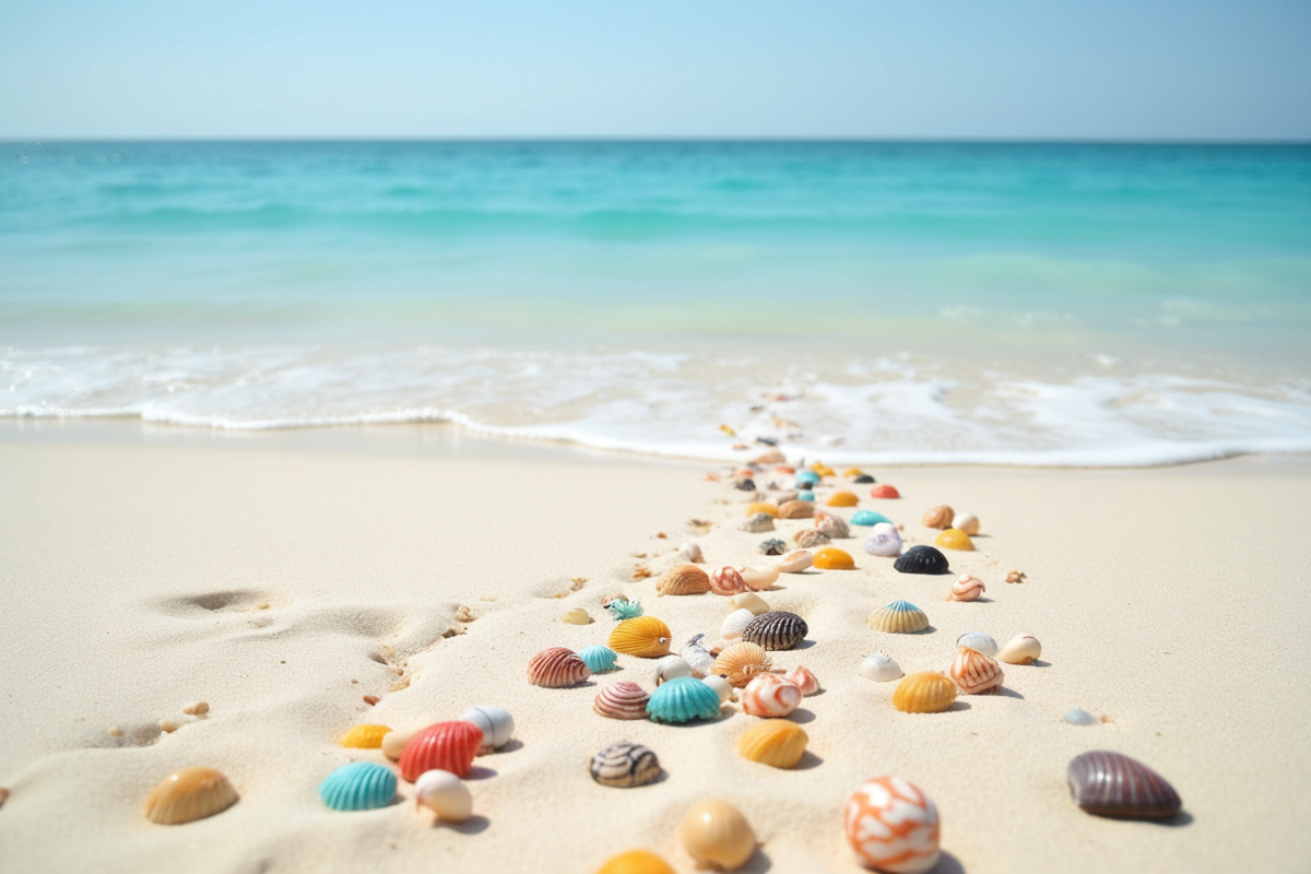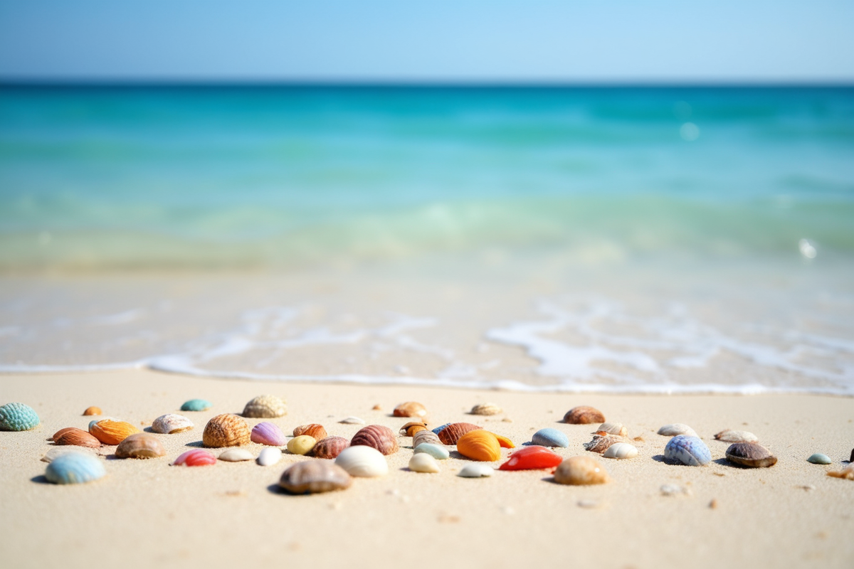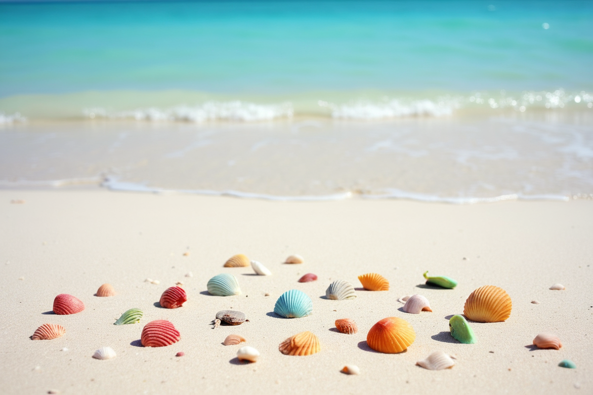 soft sand serene environment peaceful beach clear shallow water colorful seashells