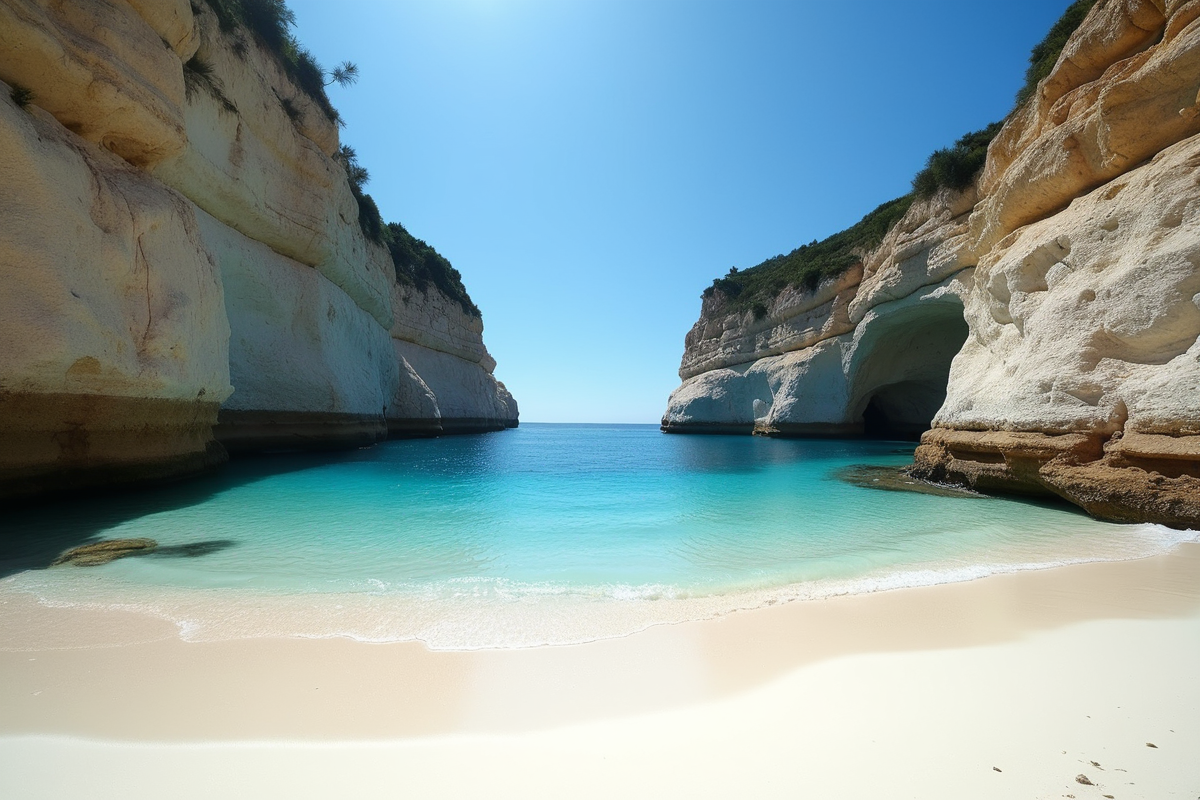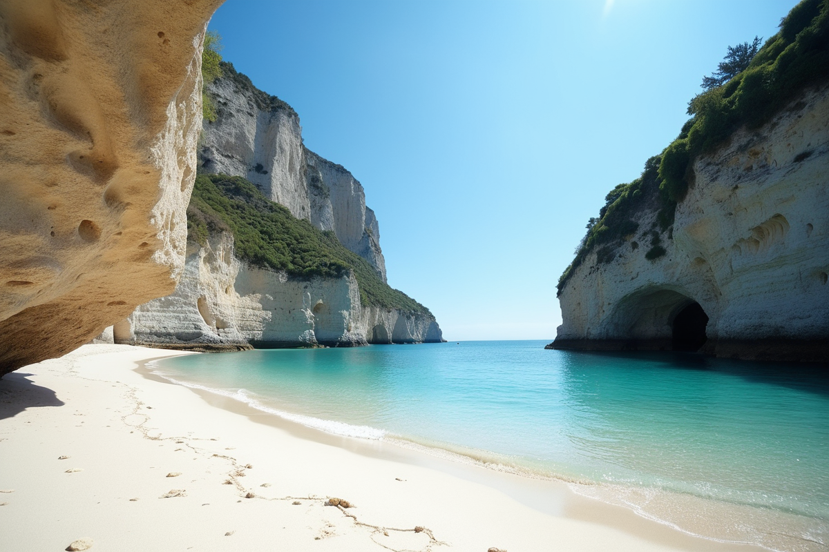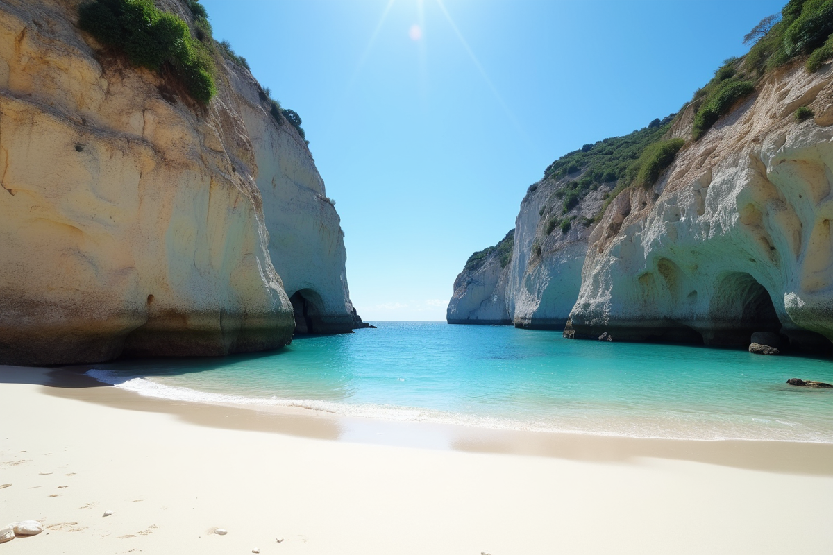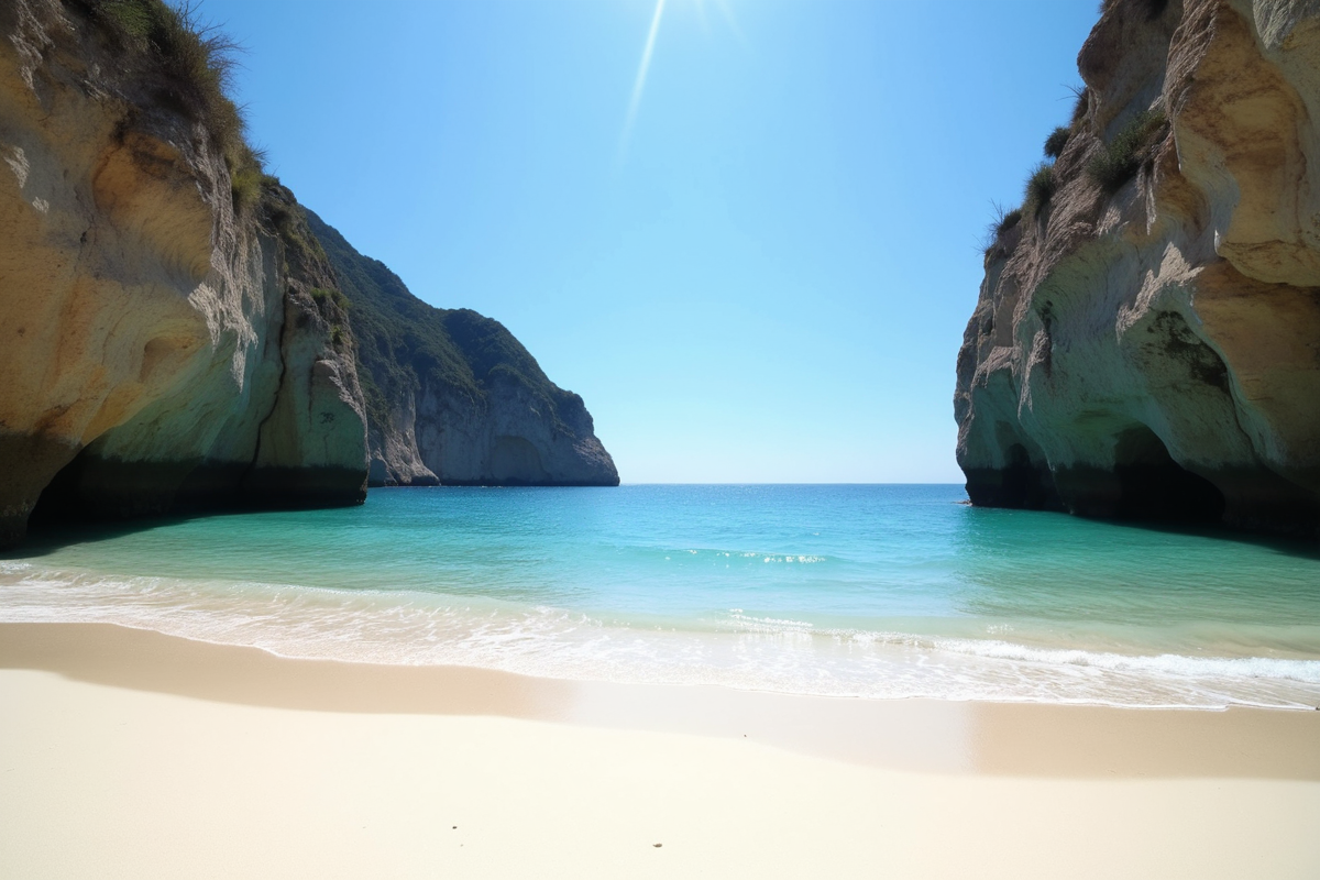soft sand serene environment tranquil water secluded cove overhanging cliffs