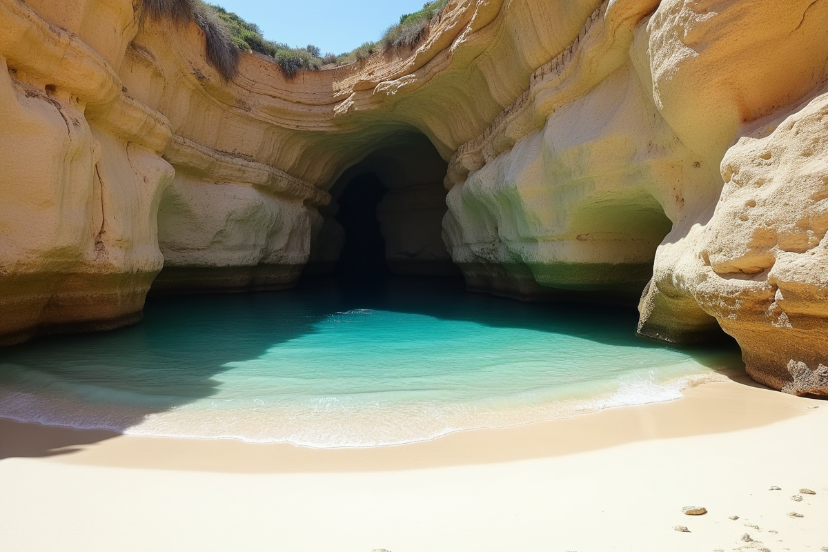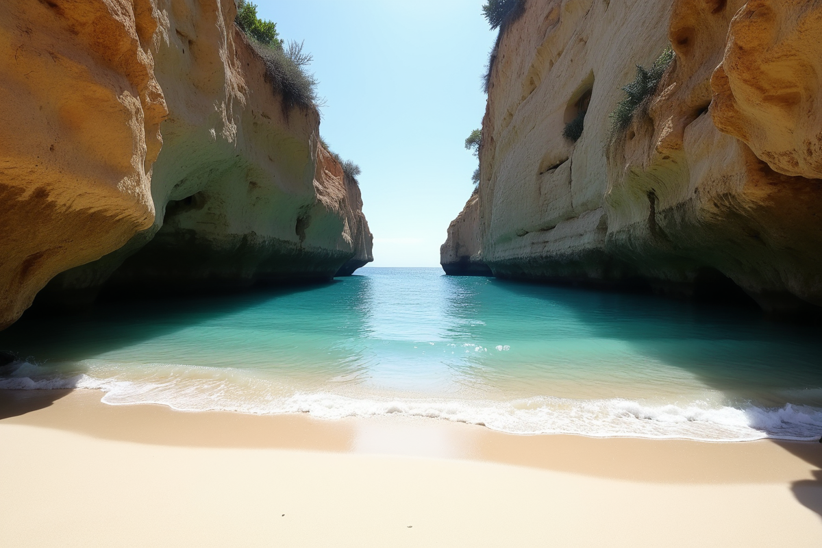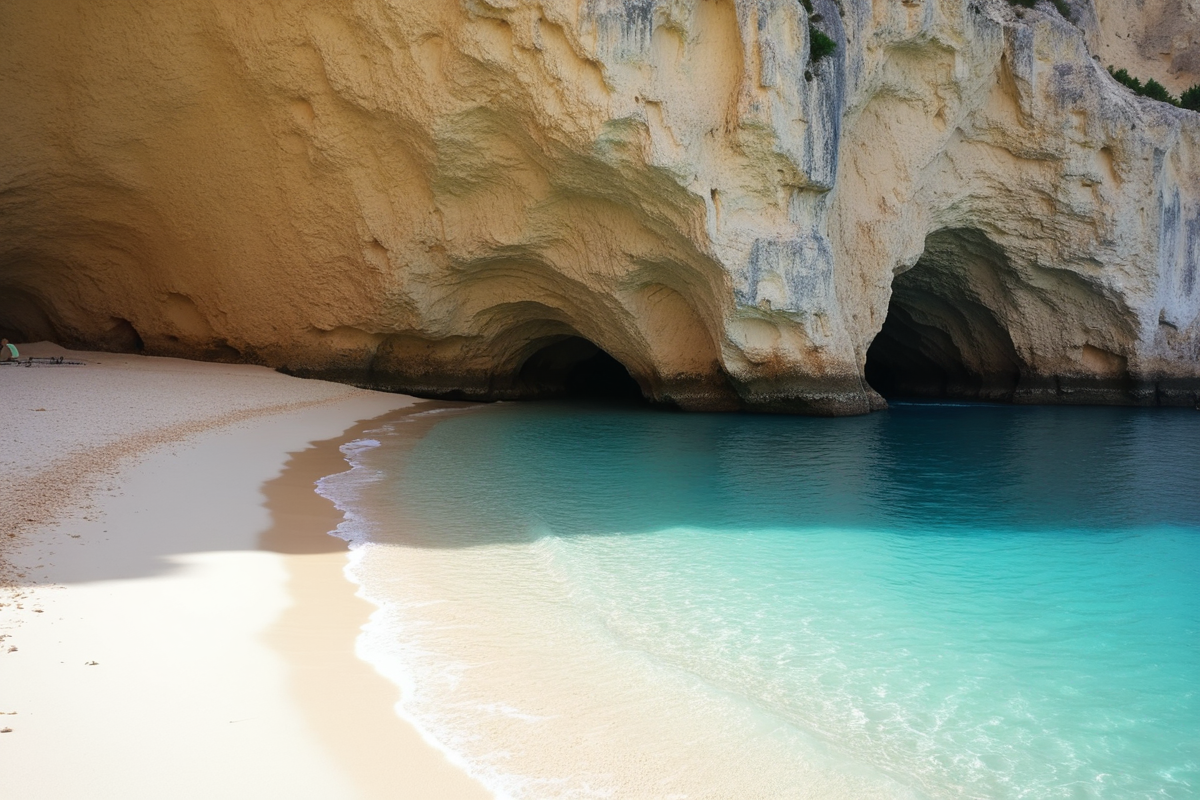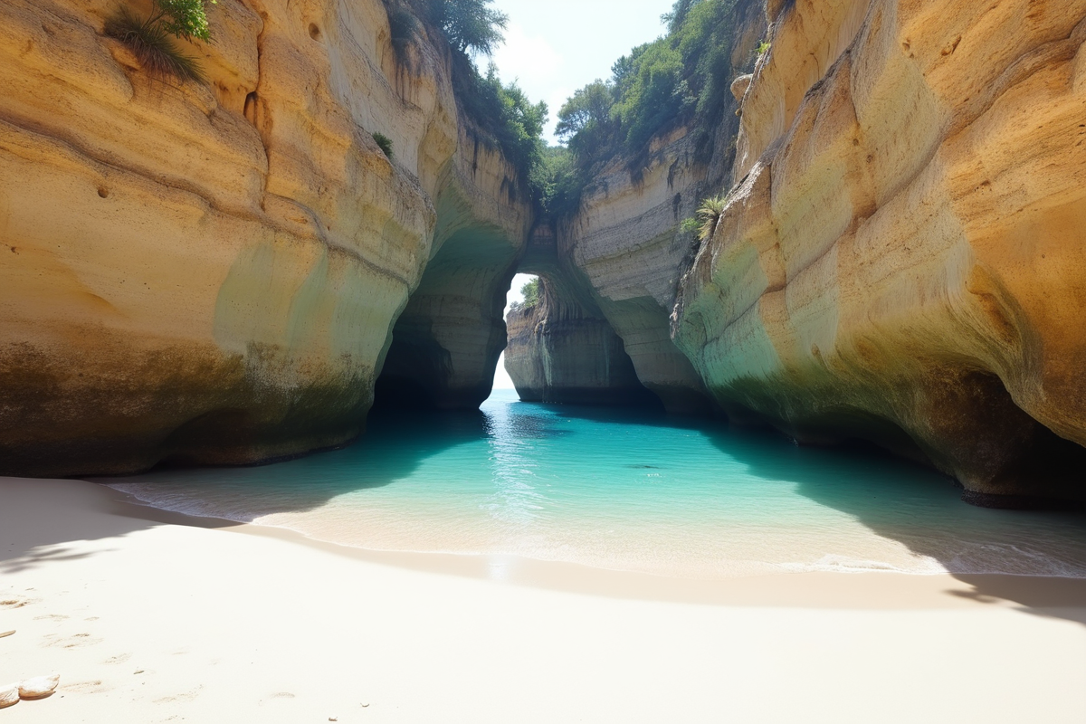 calm water soft sand serene setting secluded cove overhanging cliffs