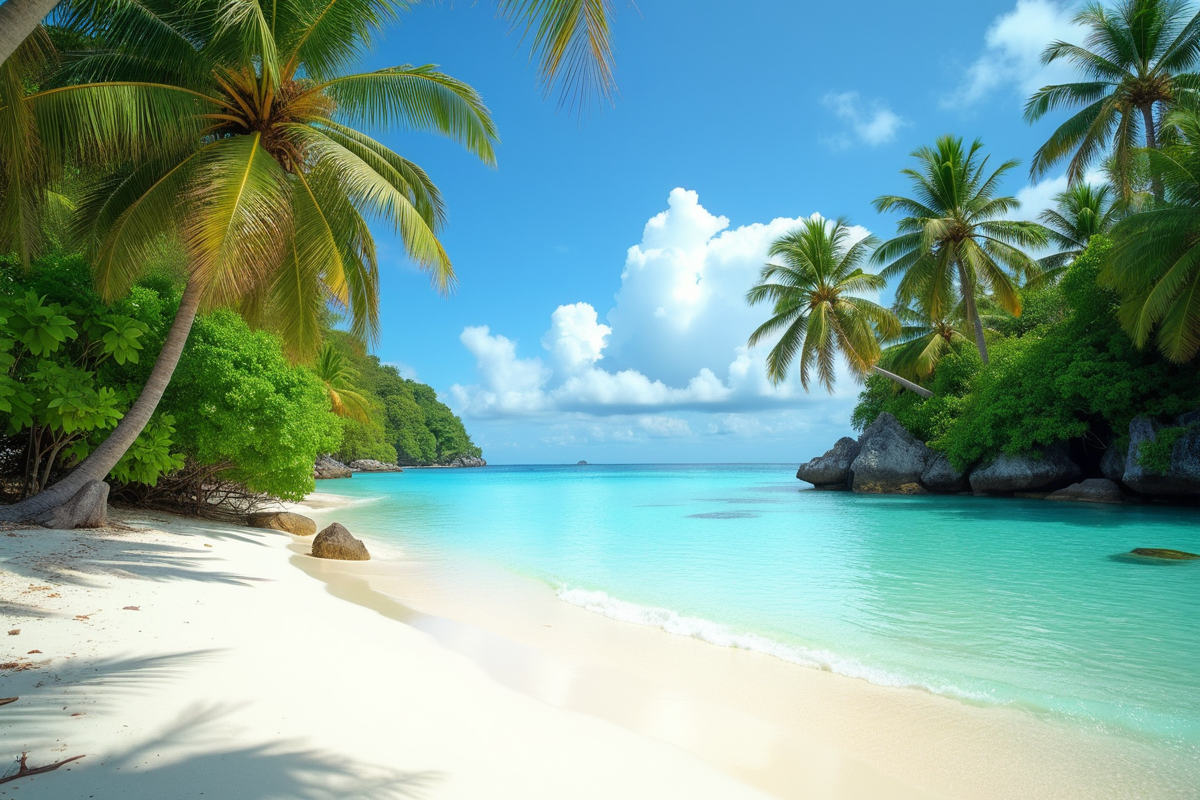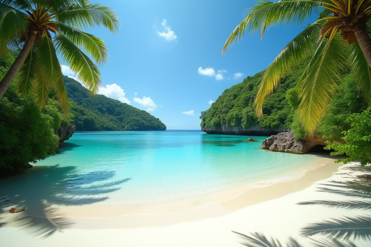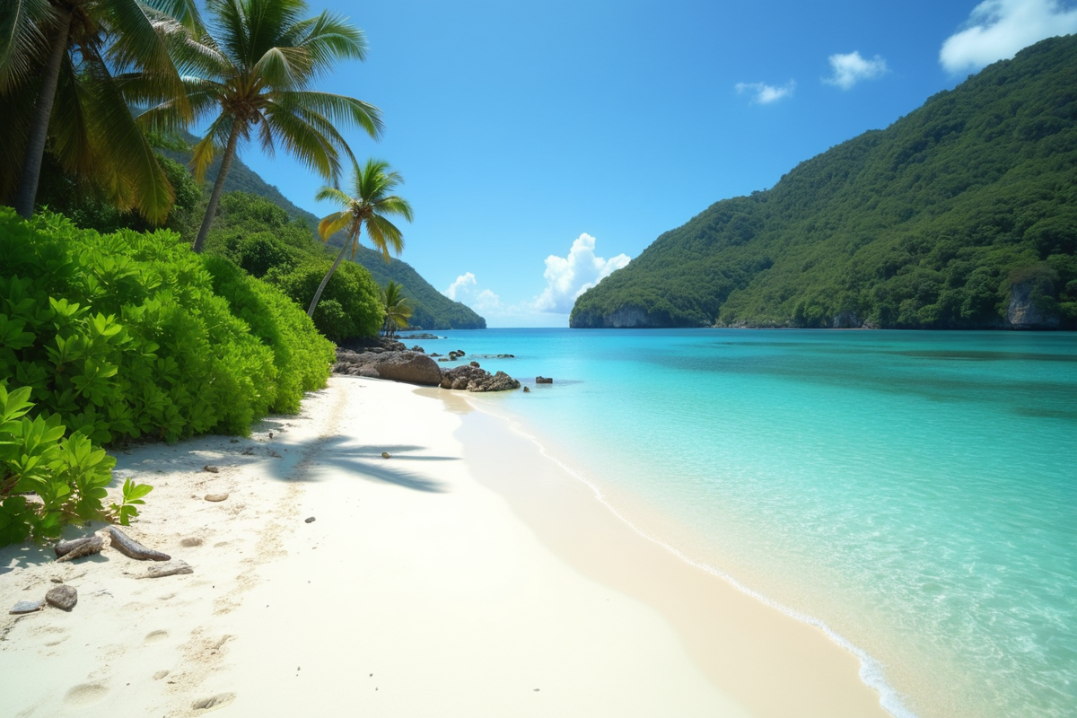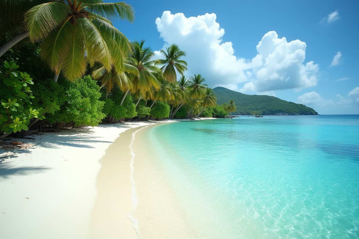 soft sand lush vegetation tropical beach peaceful setting clear lagoon