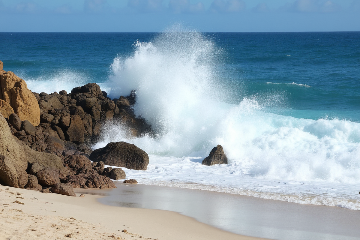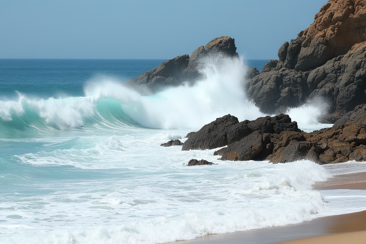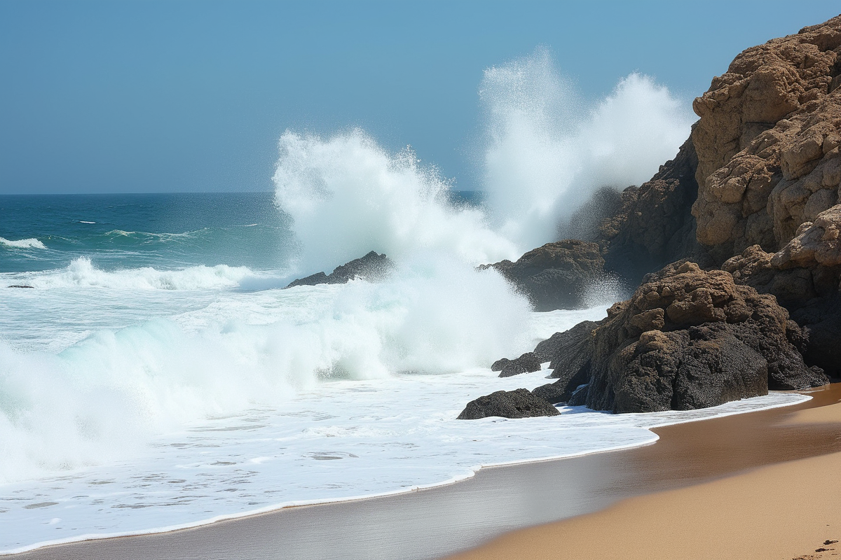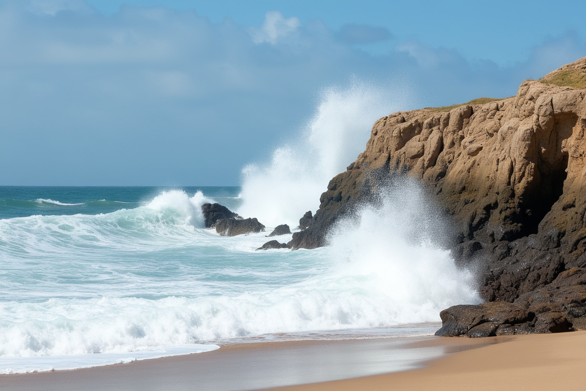 powerful surf rocky outcrops rugged landscape dramatic wave action energetic setting