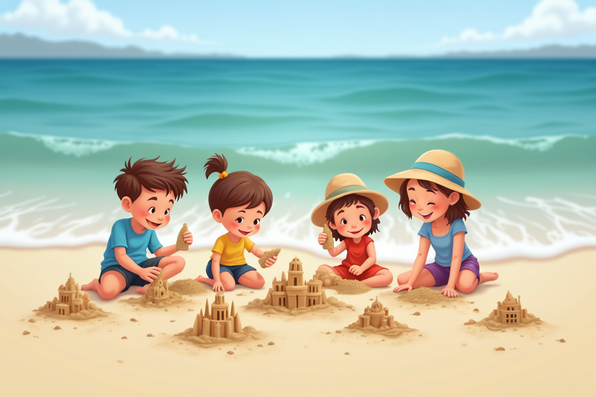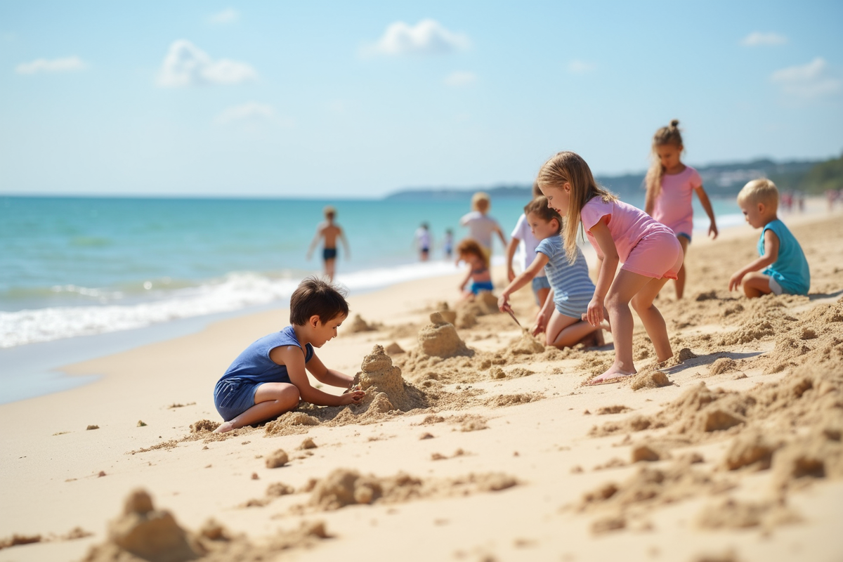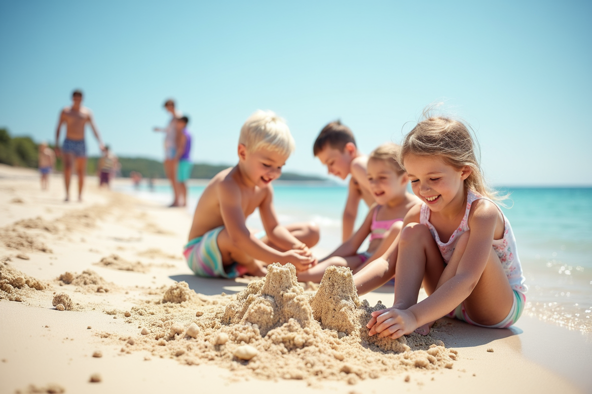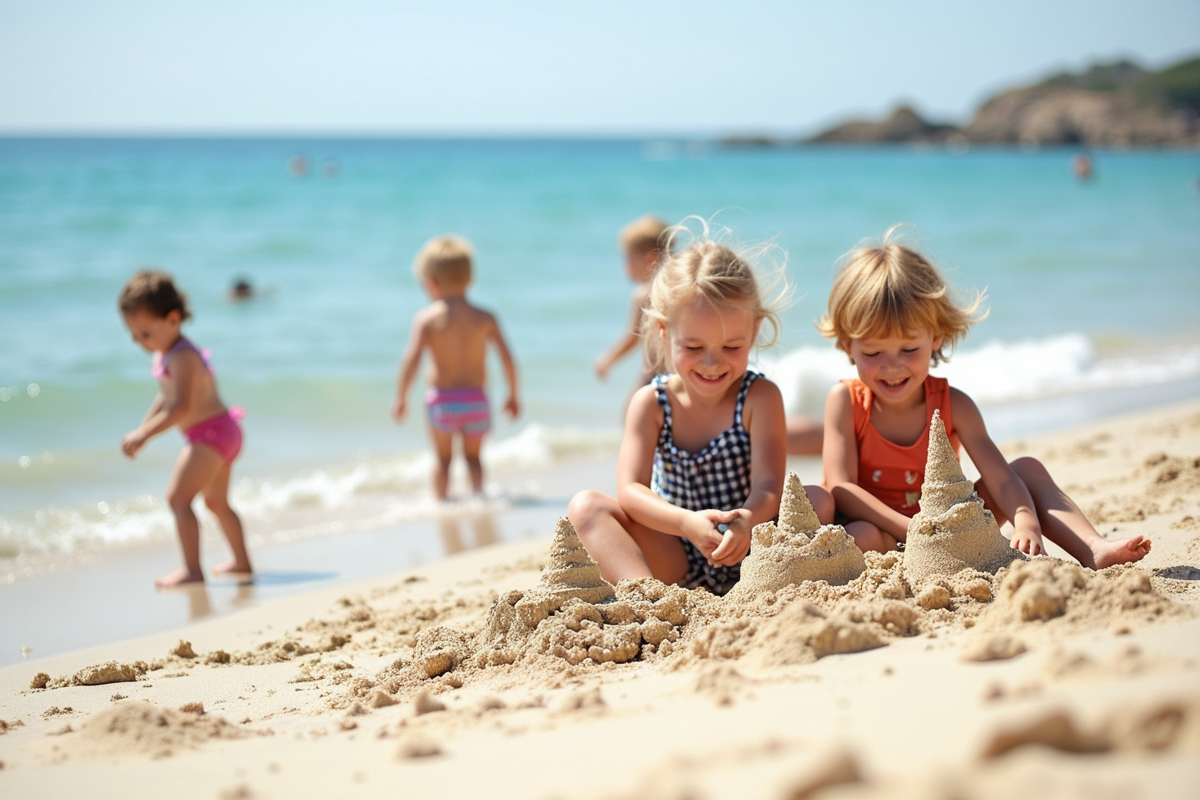 vibrant scene family beach sandcastles kids playing shoreline fun
