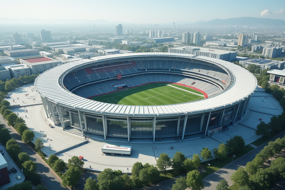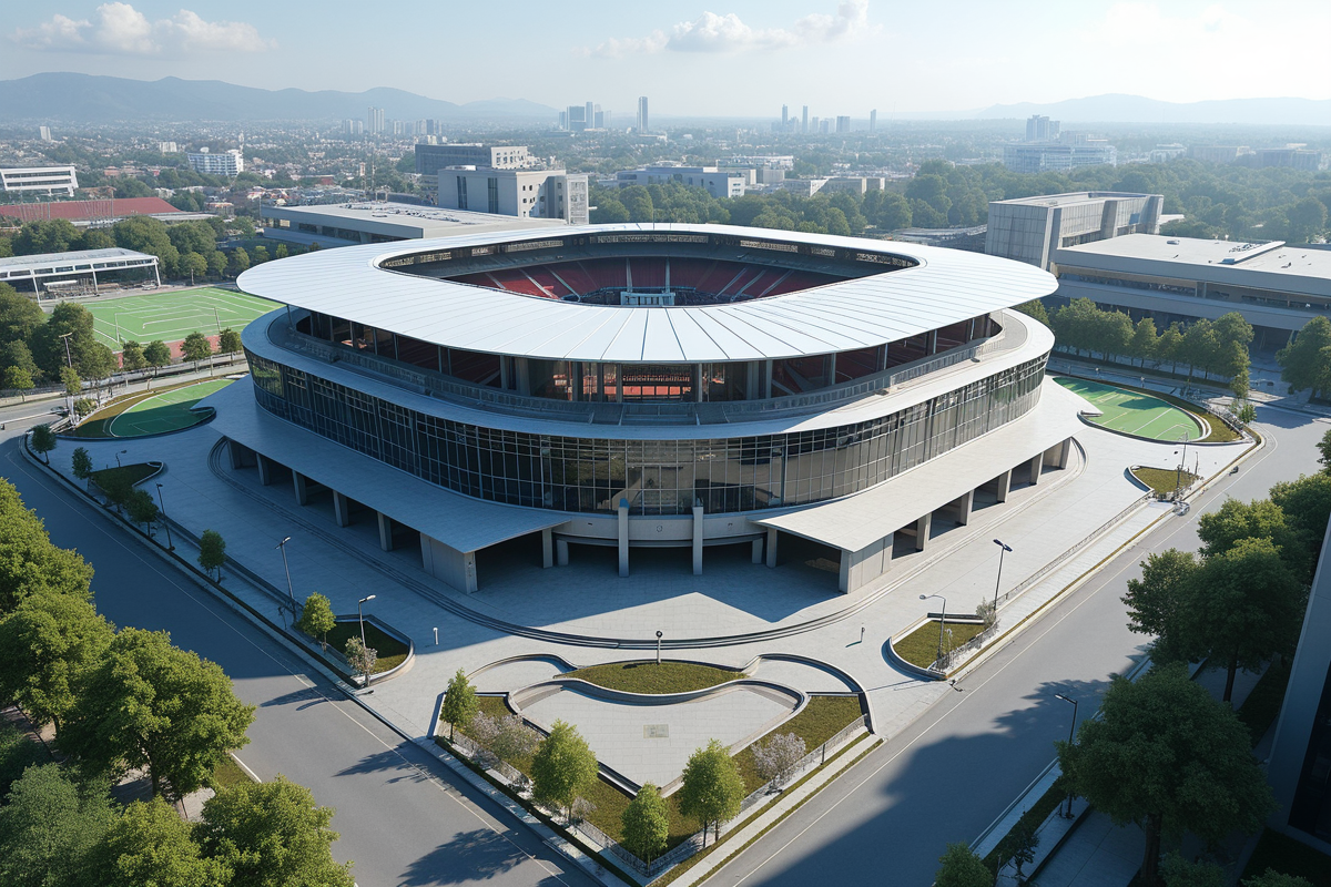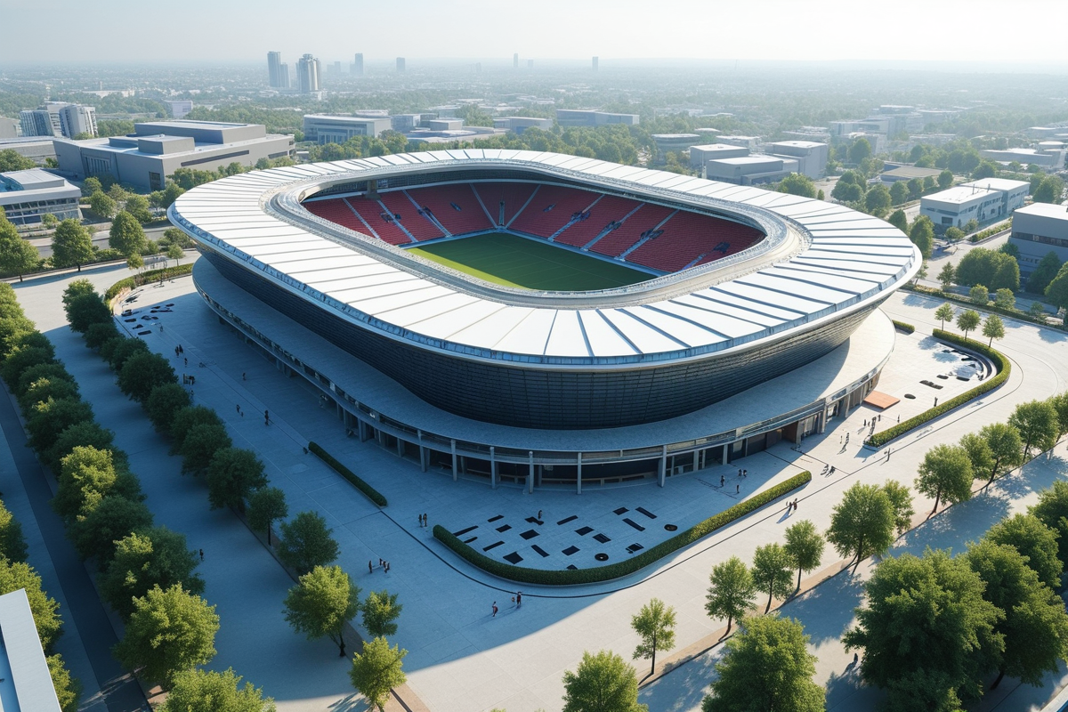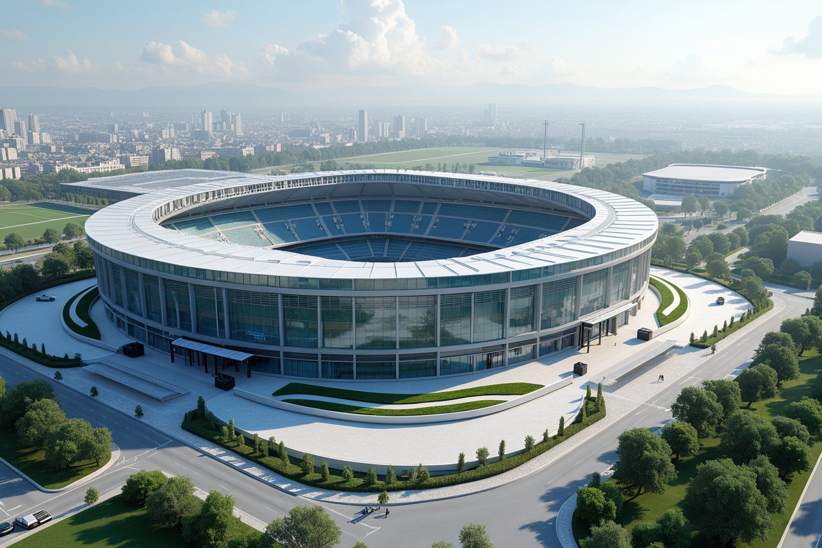 Building glass facades buildings sleek design open seating areas Modern sports arena high-tech facilities