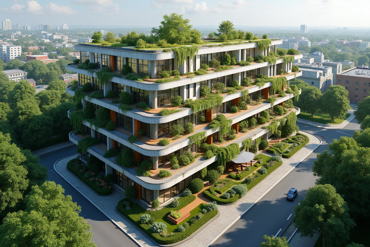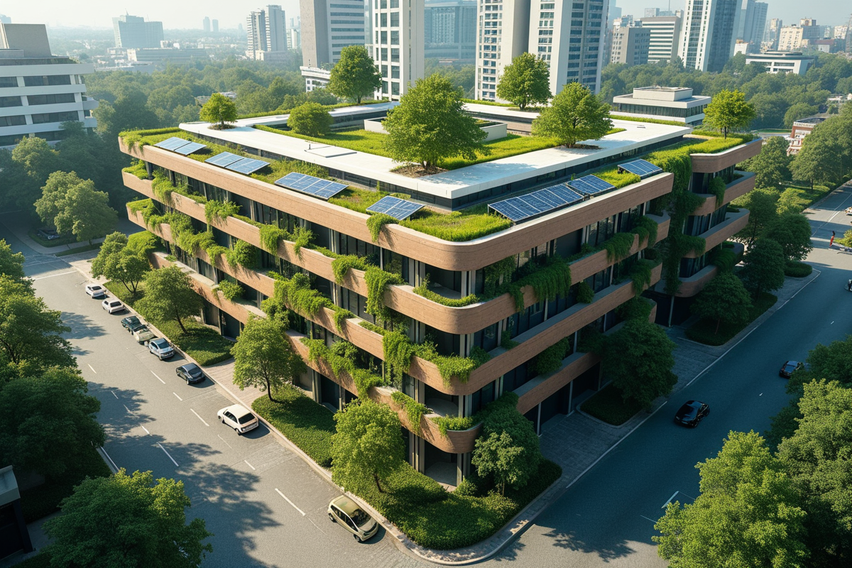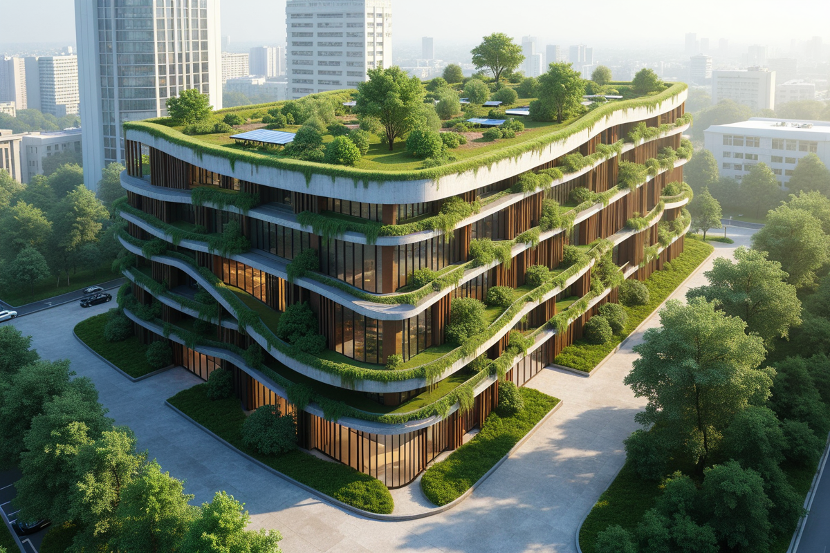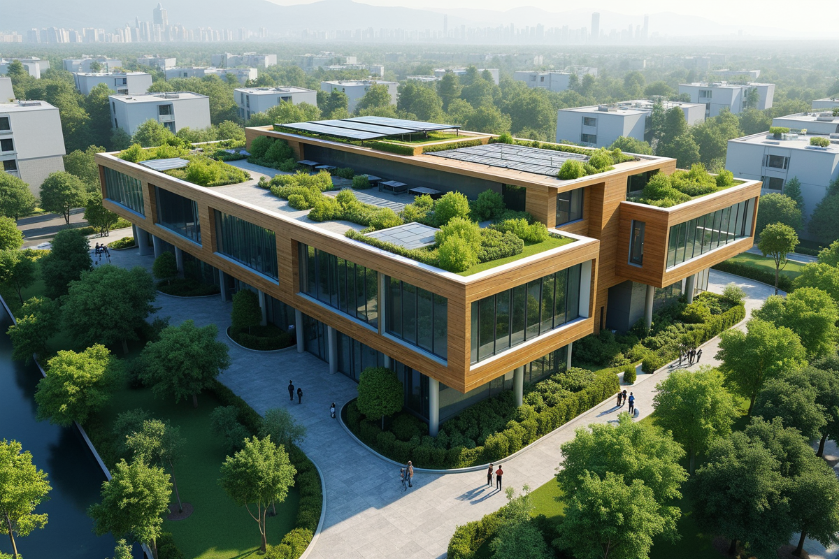 Building buildings sustainable design green roofs solar panels Eco-friendly office building natural ventilation