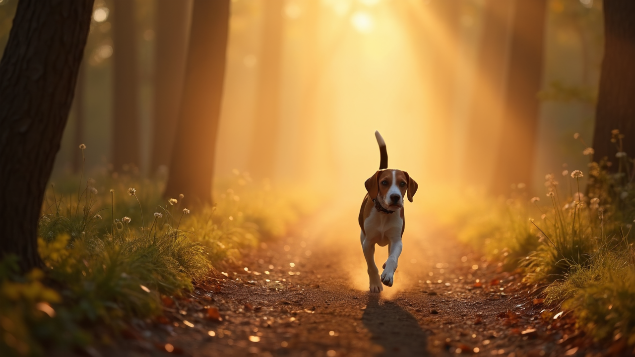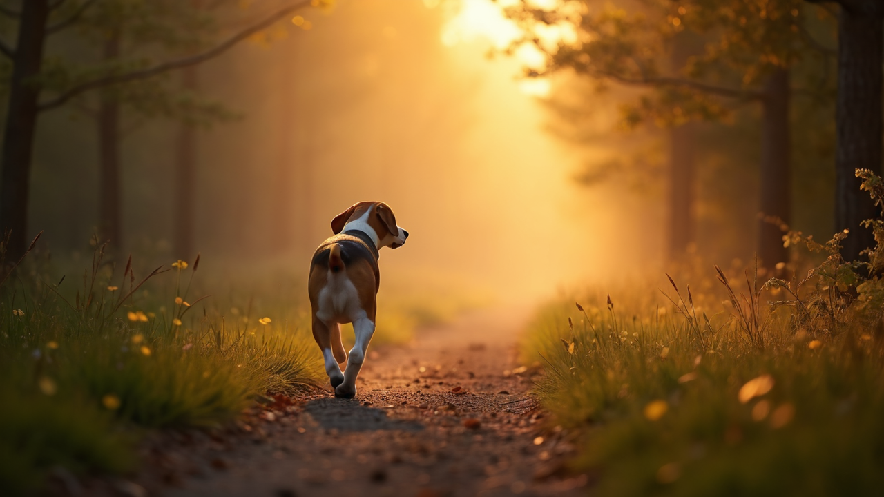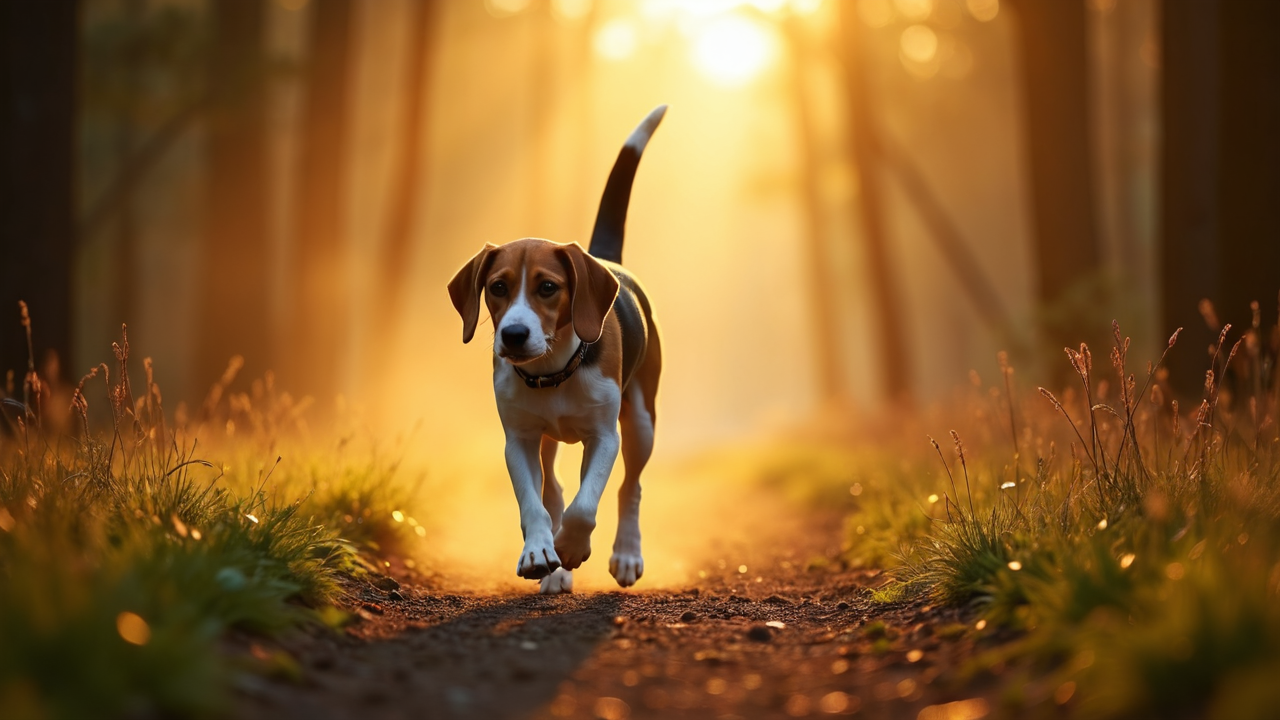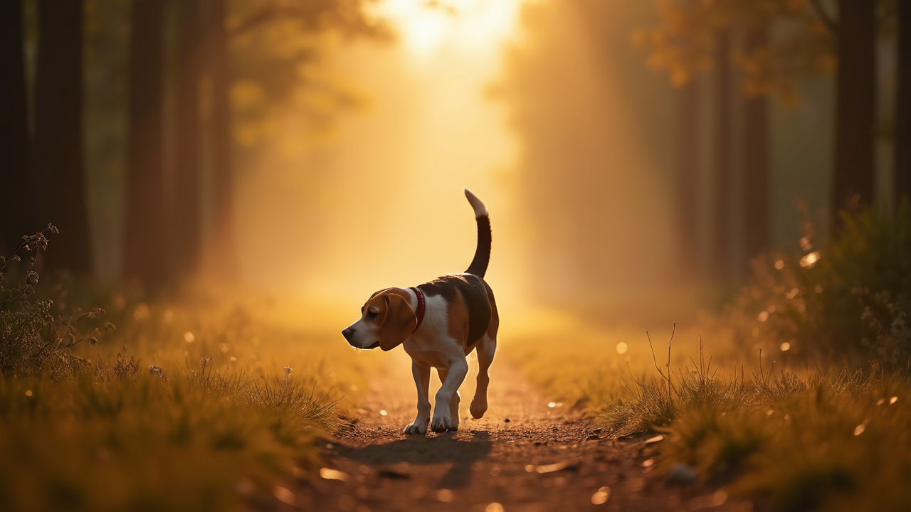 peaceful forest trail dawn golden light dog doggy dogs puppy Beagle trotting fresh