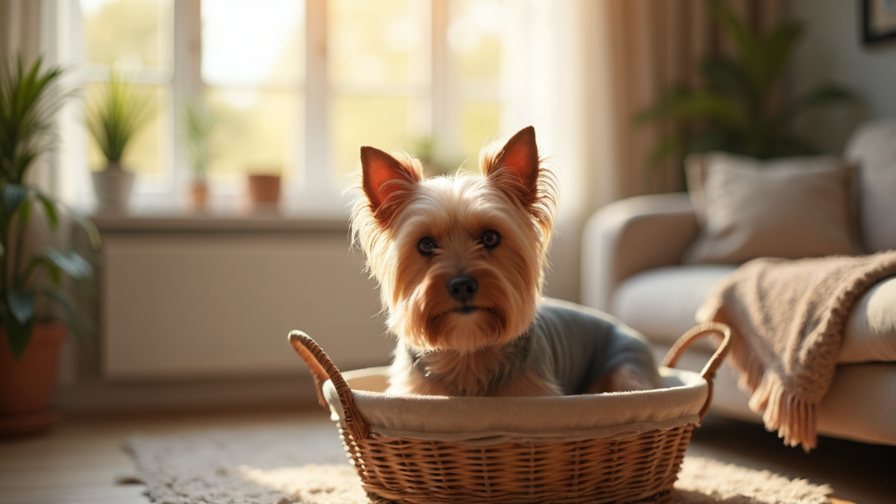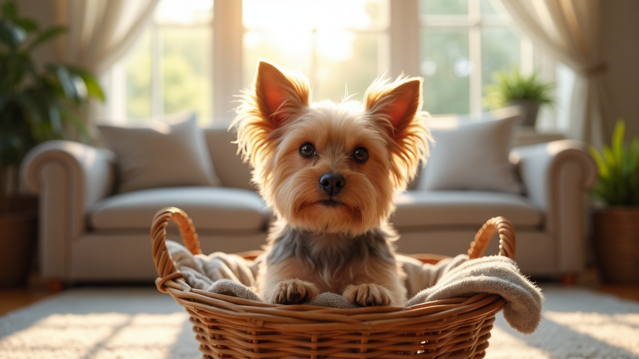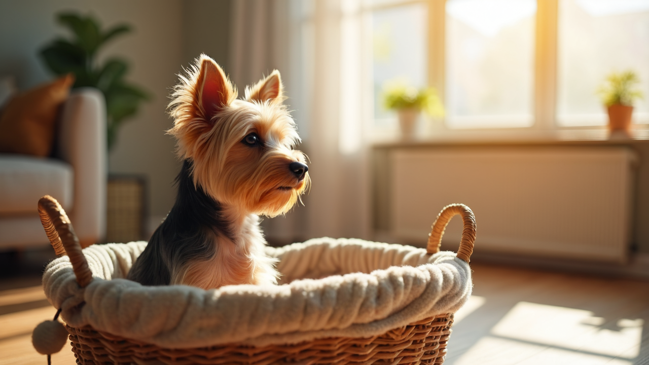 Modern Living Room Lively basket curious dog doggy dogs puppy inquisitive early morning Yorkshire Terrier sitting up