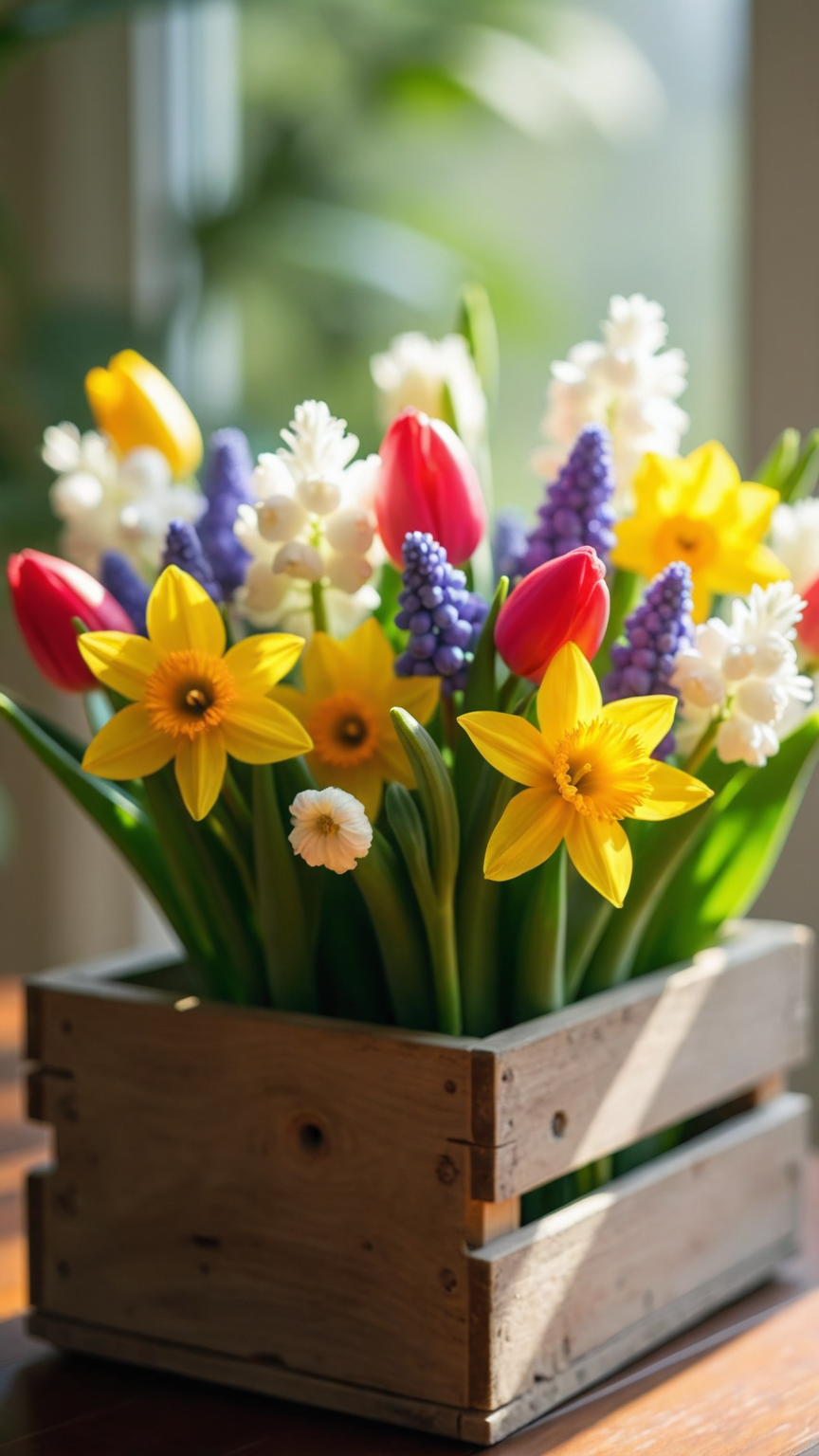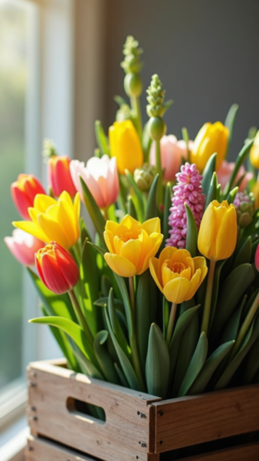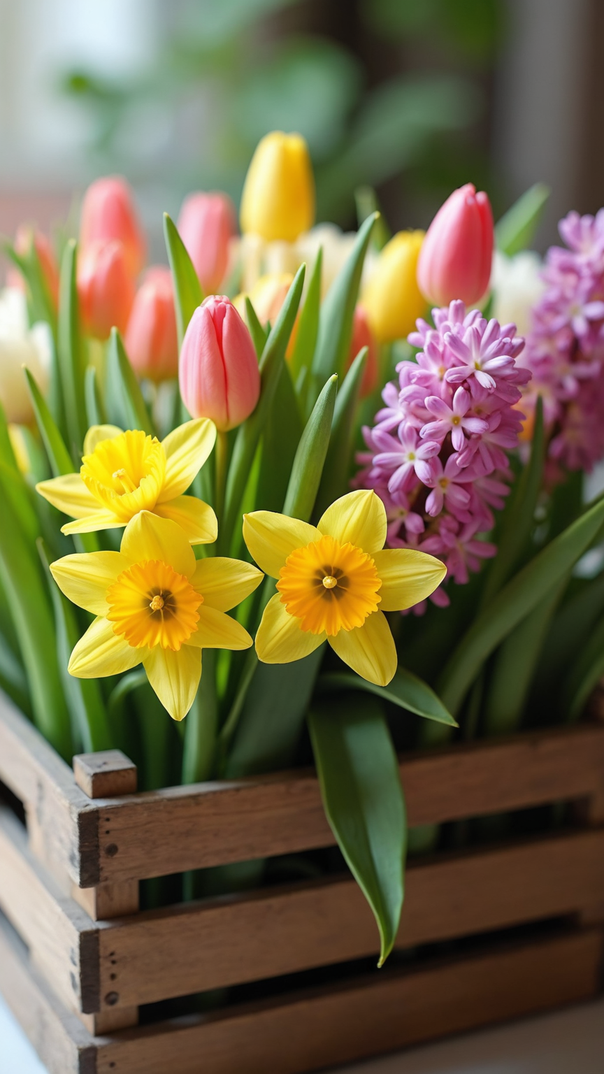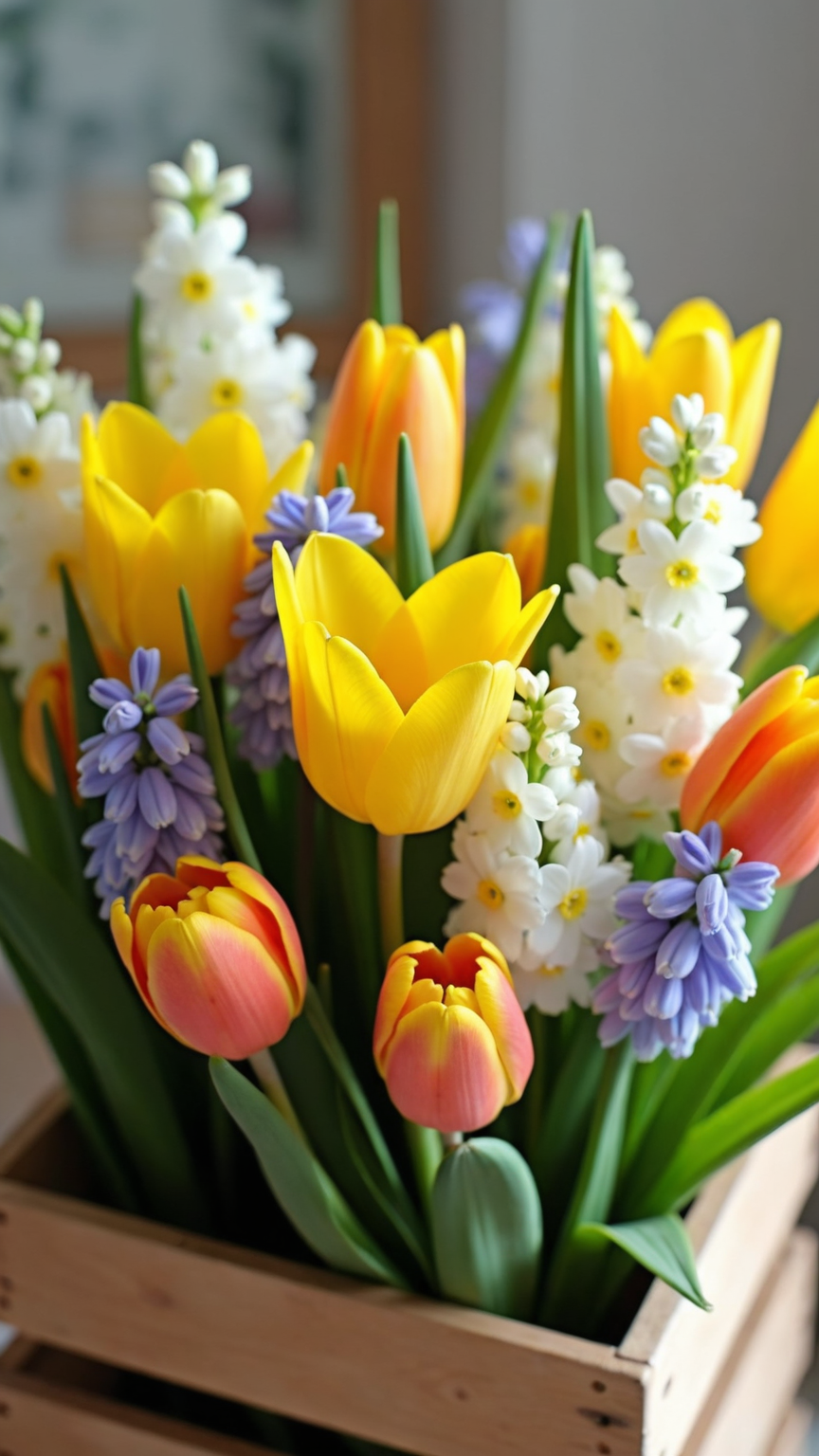 mobile wallpaper Floral flower petals petal rustic crate spring bouquet tulips and daffodils