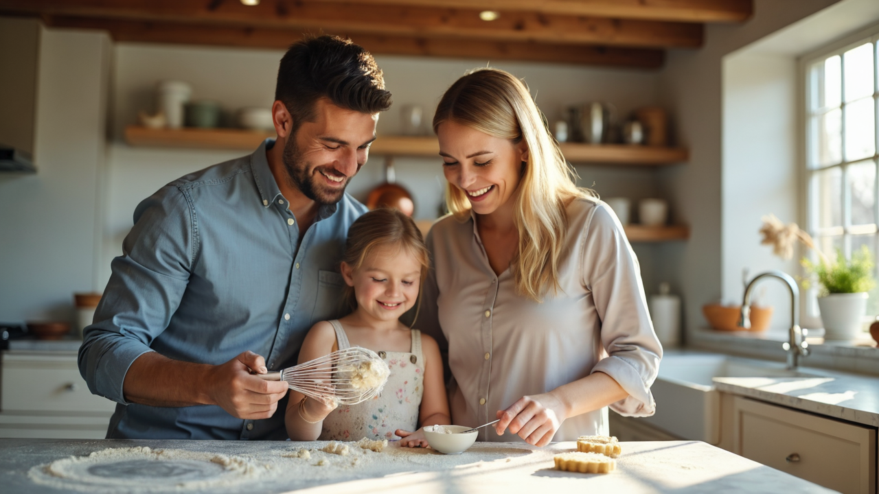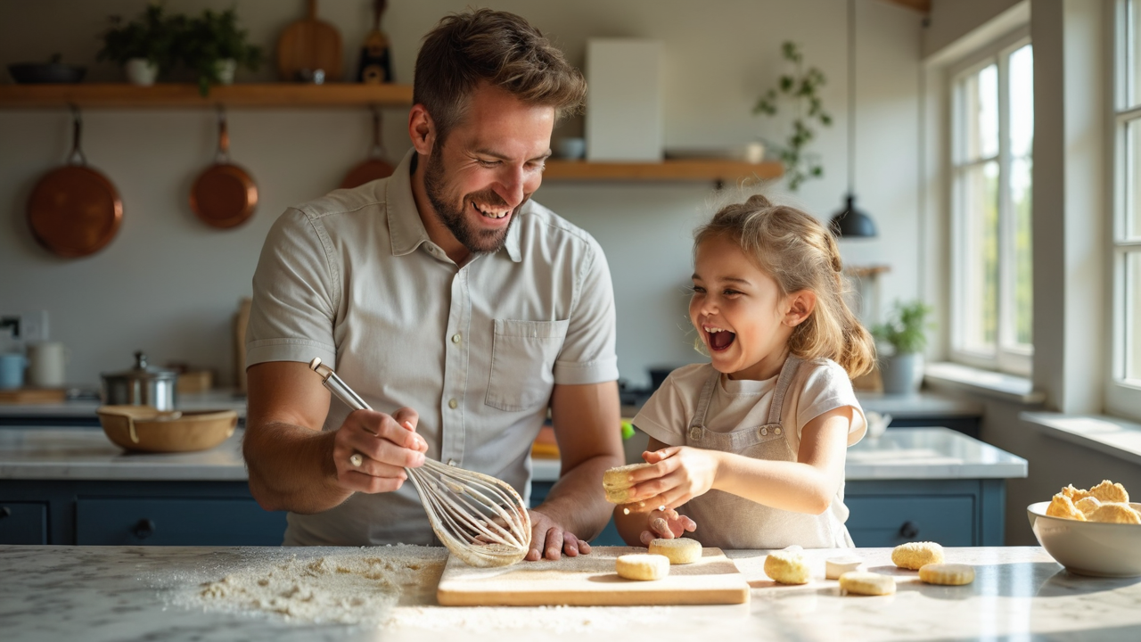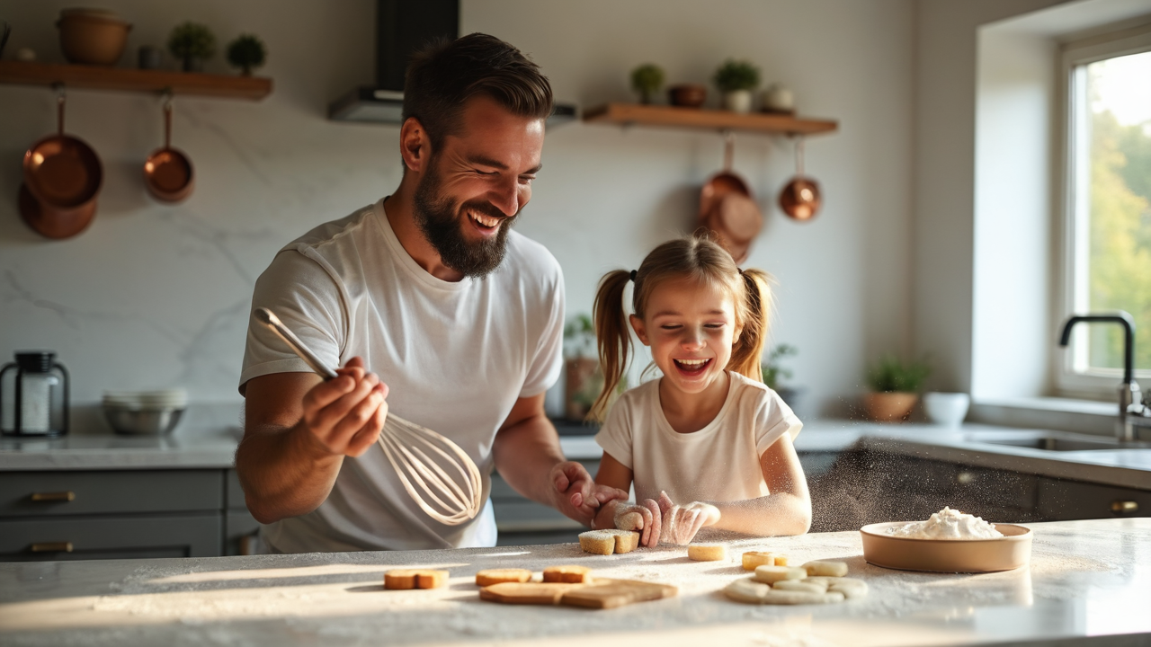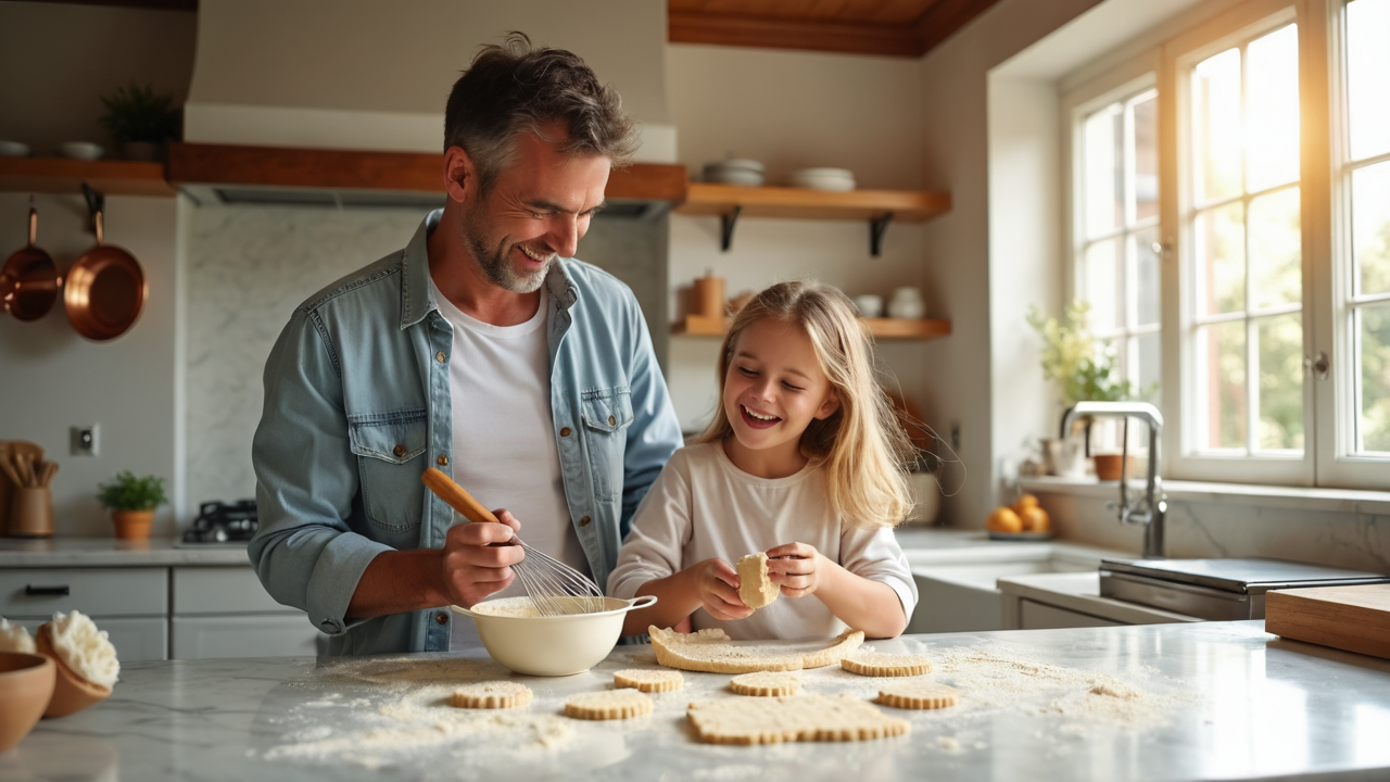 family moments father-daughter cookie cutting marble kitchen playful mess Baking together