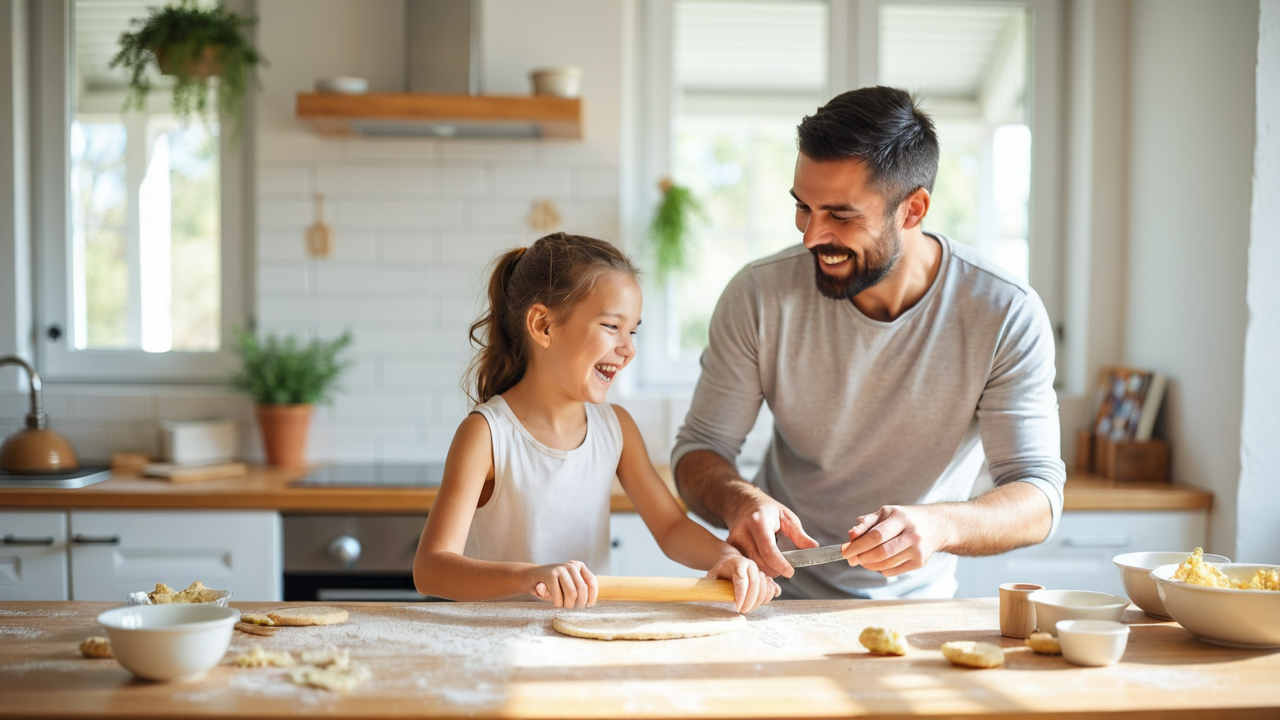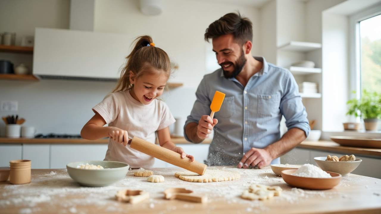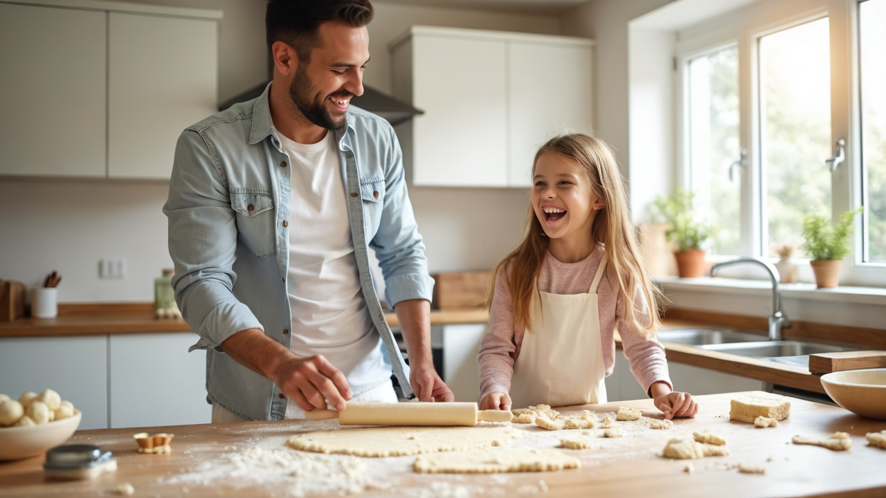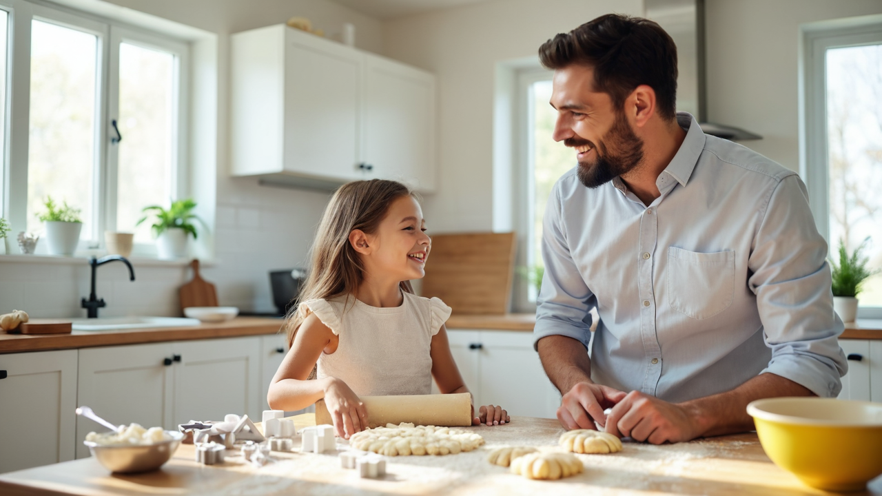 modern design family moments flour dust baking cookies Minimalist kitchen father-daughter fun