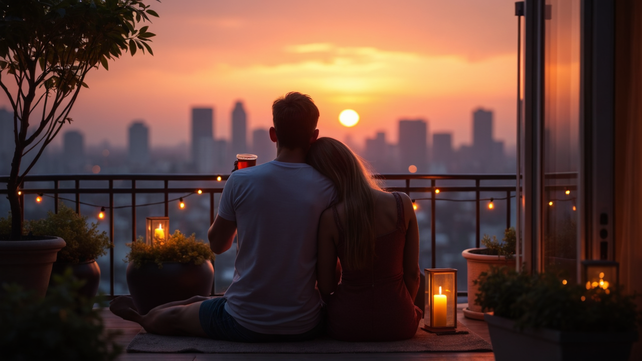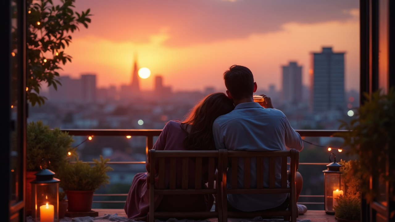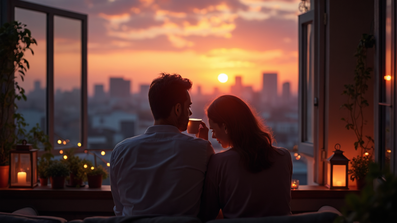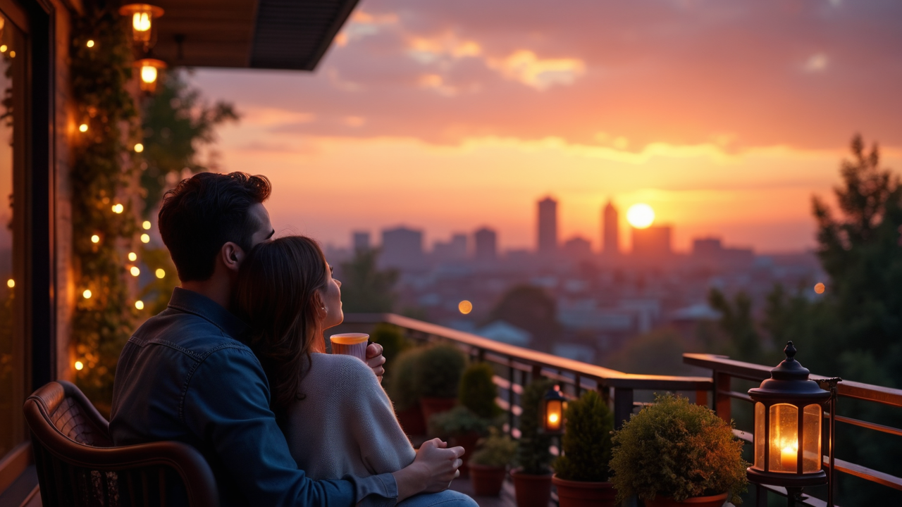 warm glow family cozy atmosphere moments Couple on balcony city skyline sunset tea