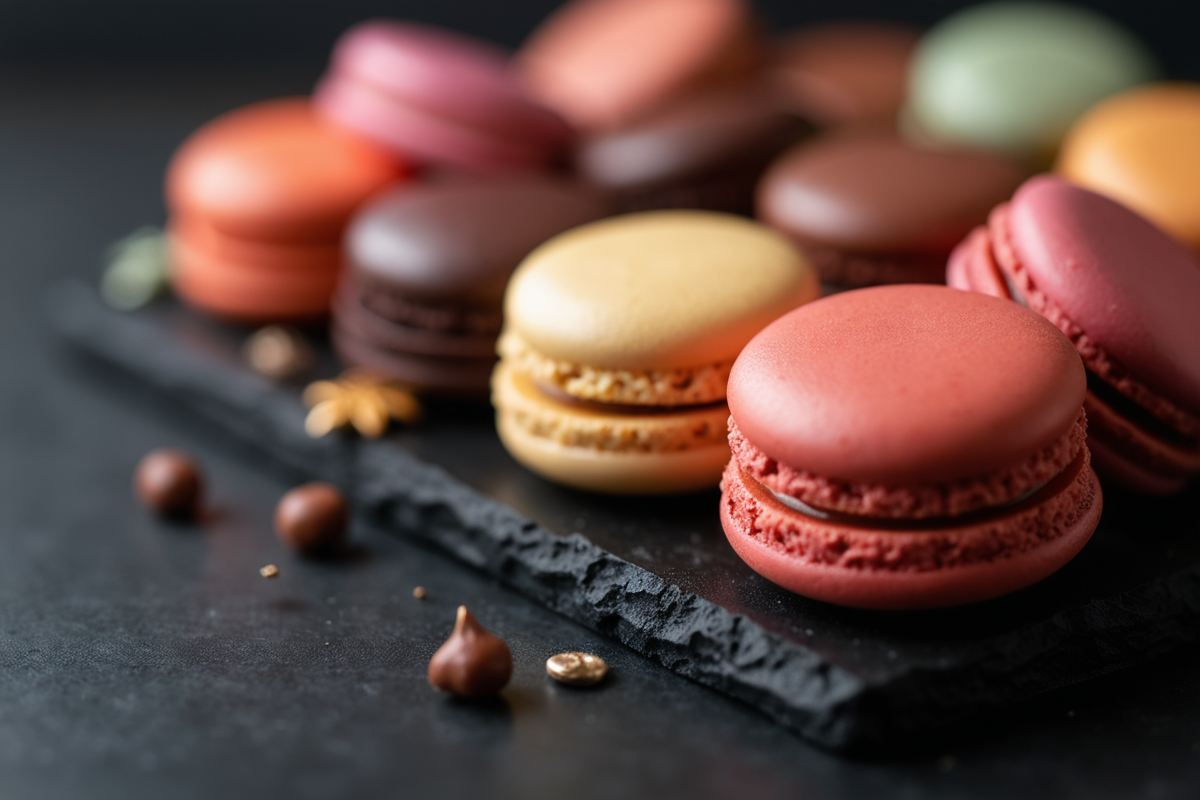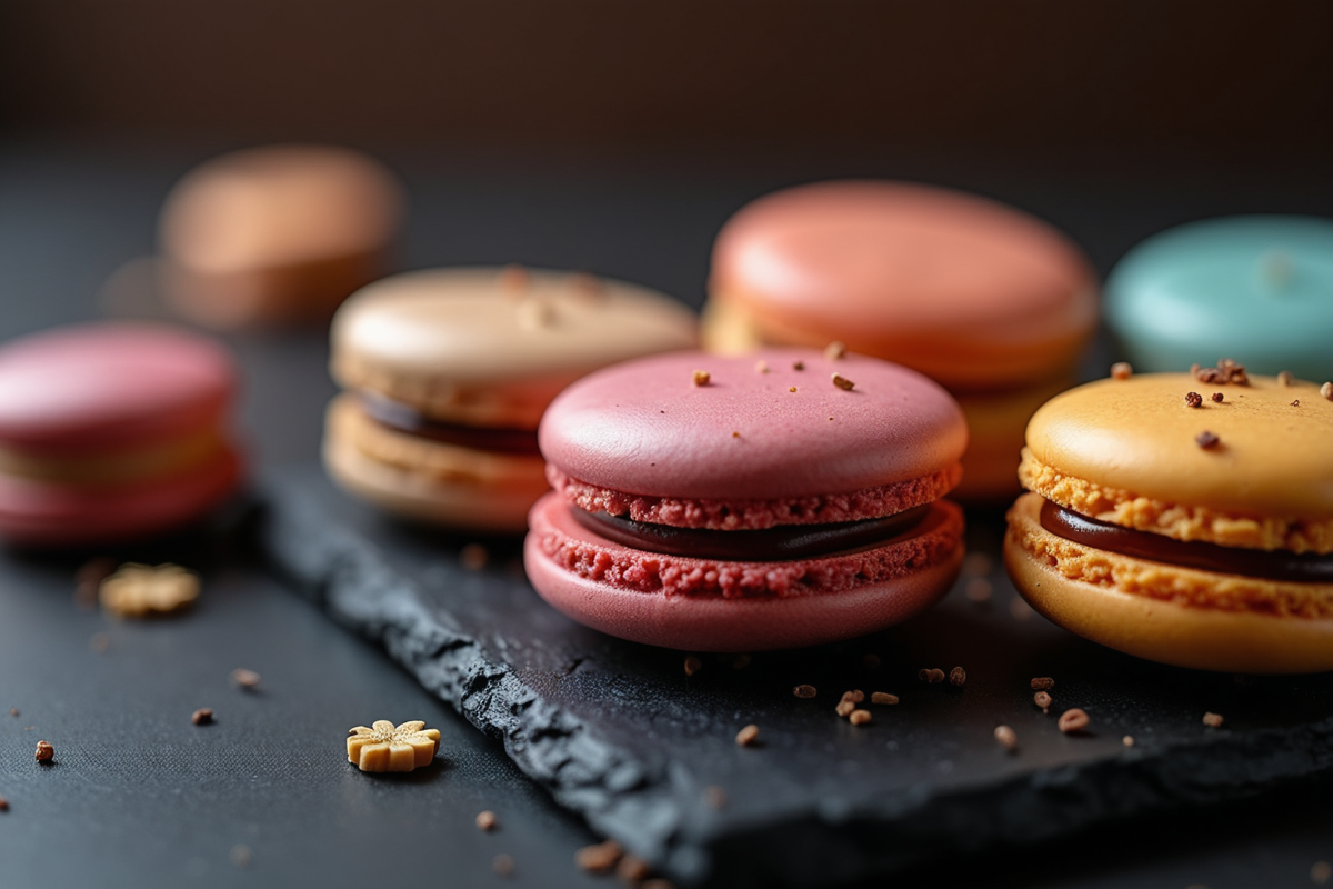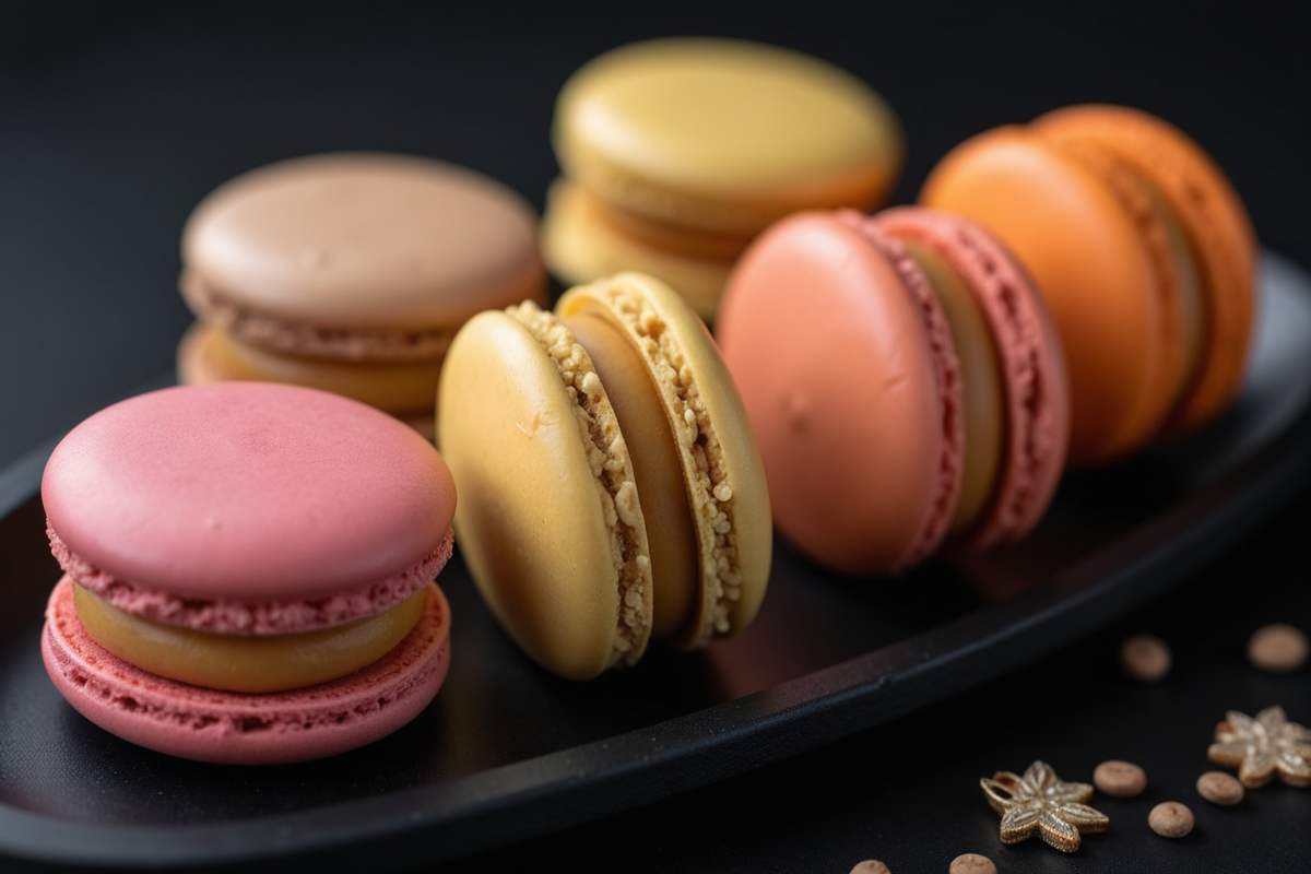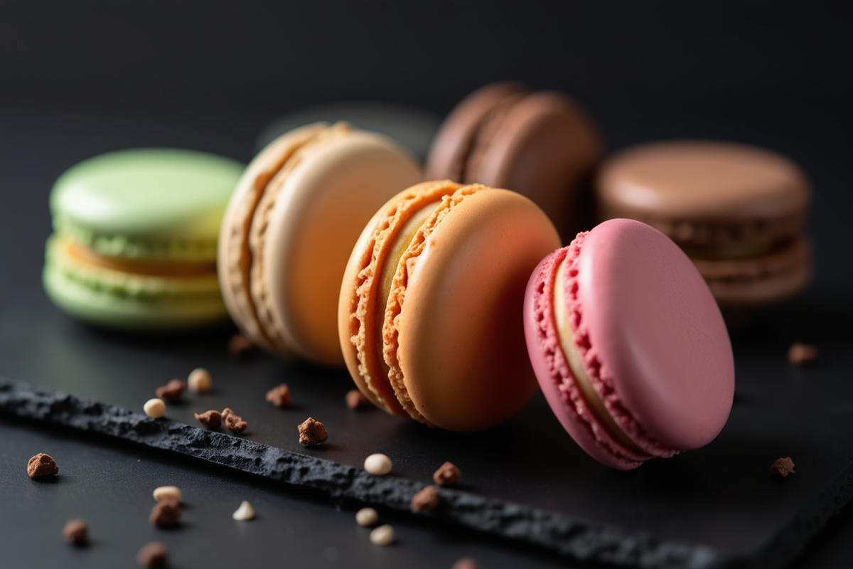 close-up colorful sweets dessert sweet black surface decorative accents Macarons filling smooth shells