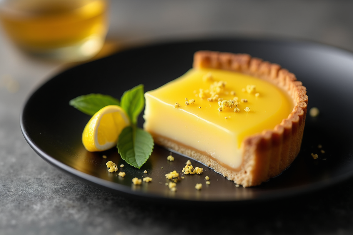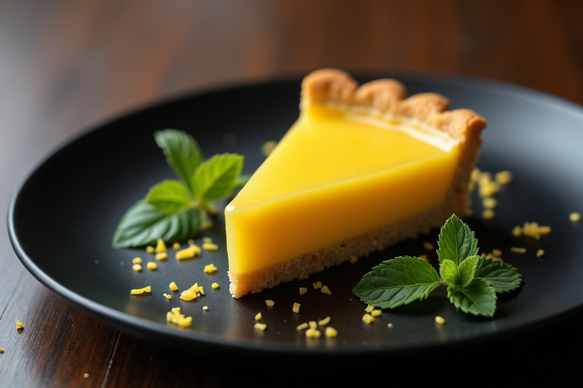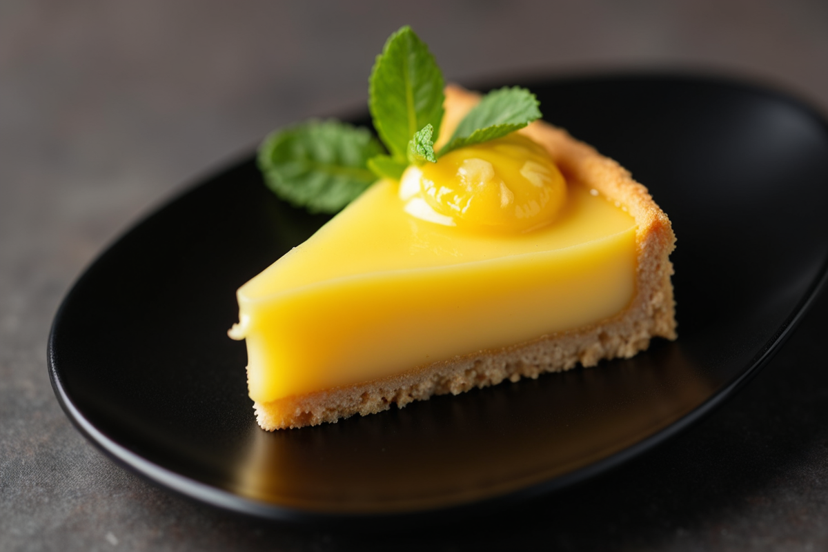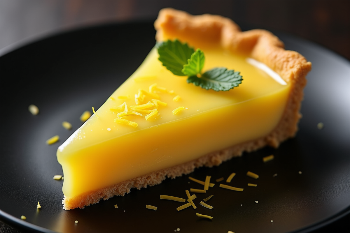 sweets dessert sweet slice black plate Lemon tart creamy filling golden crust lemon zest mint leaves