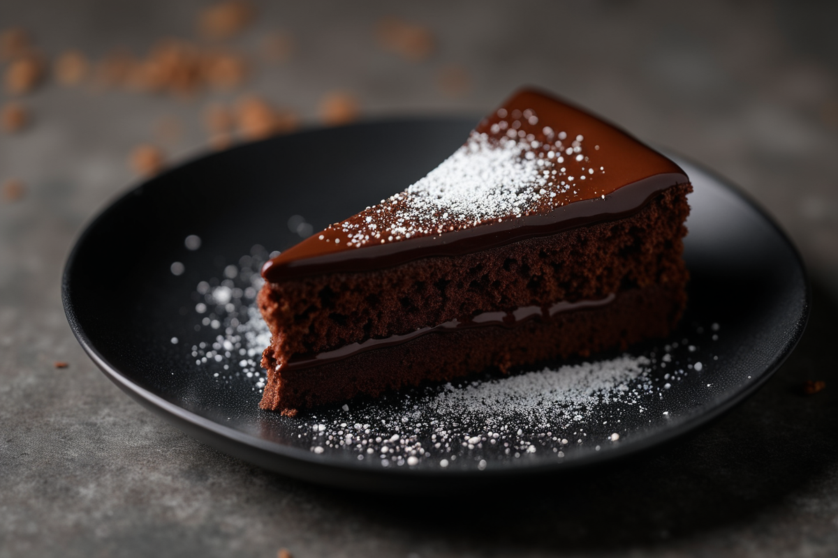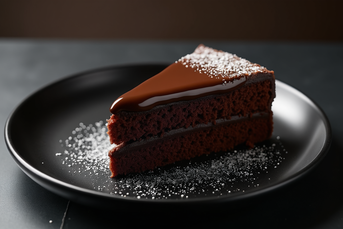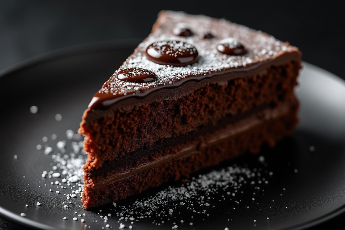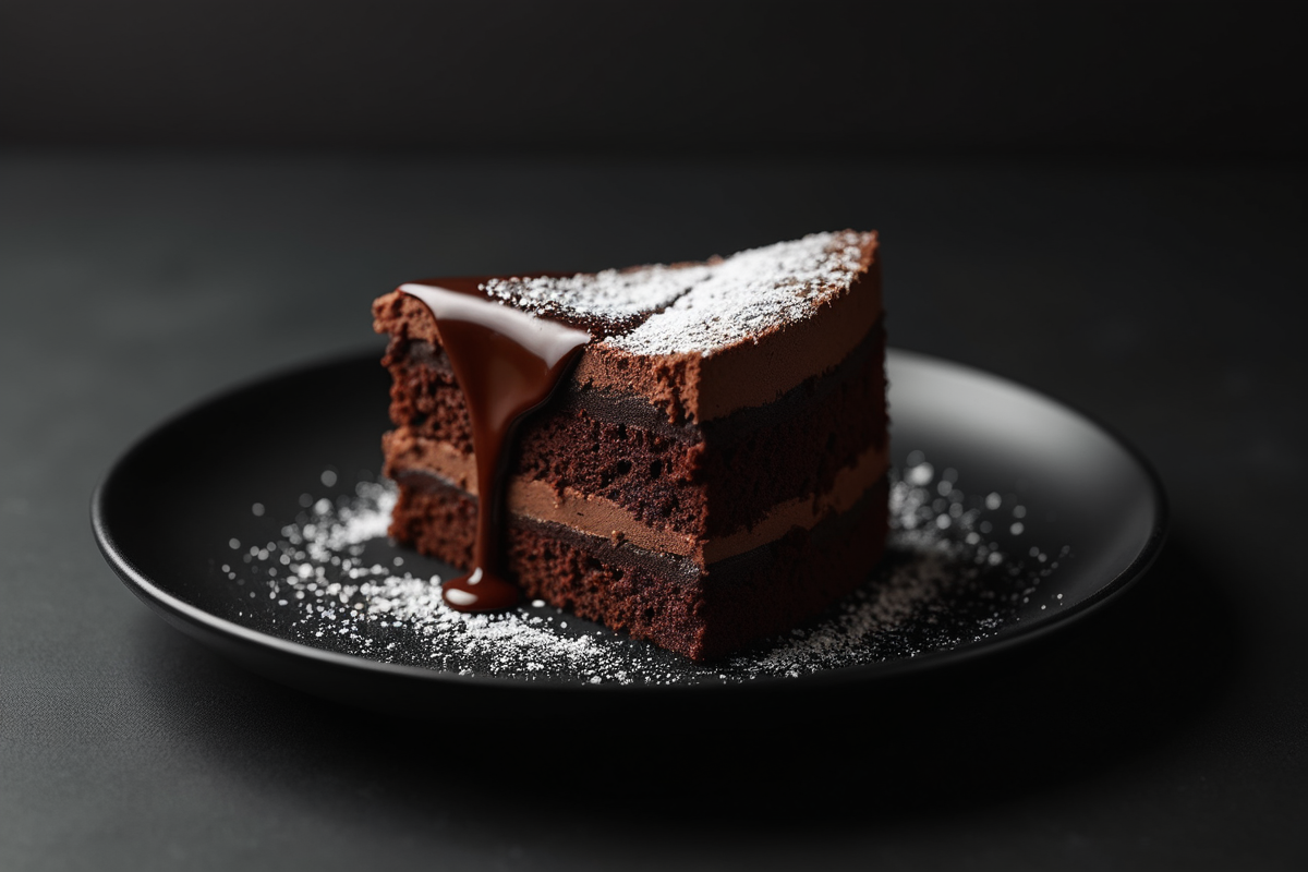 sweets dessert ganache sweet rich Chocolate cake slice powdered sugar black plate