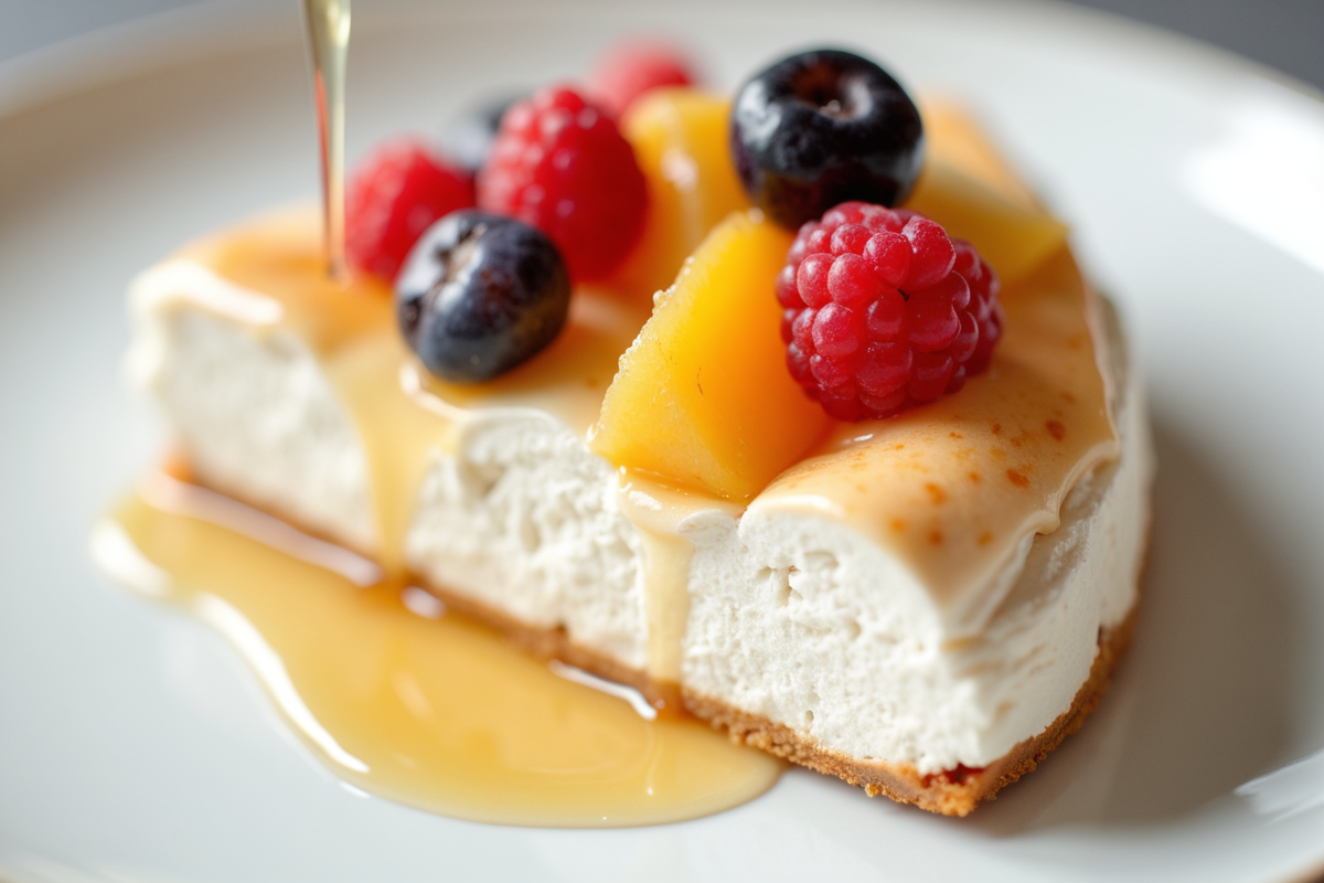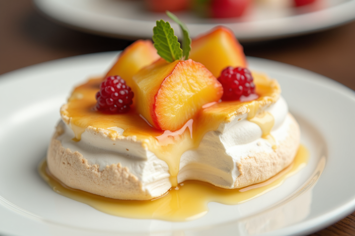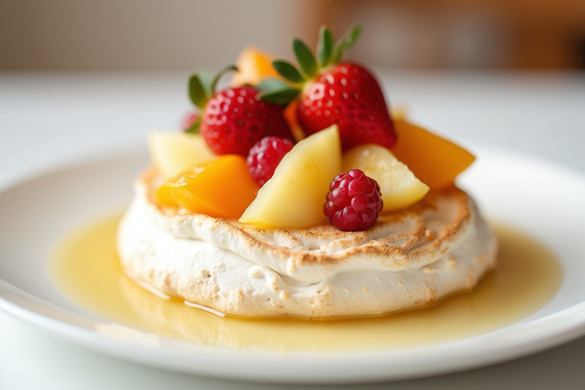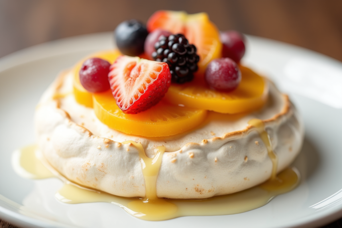 close-up sweets dessert sweet slice fresh fruit white plate Fruit pavlova honey drizzle golden meringue