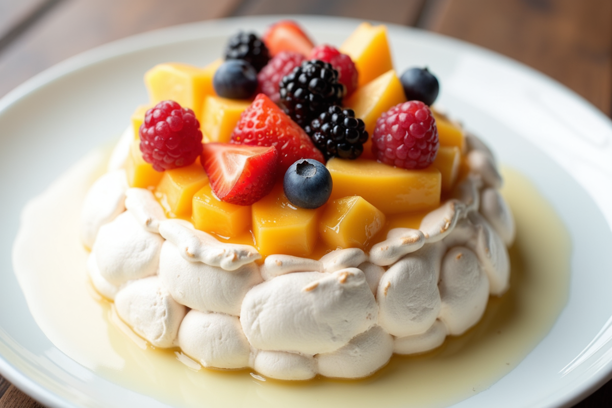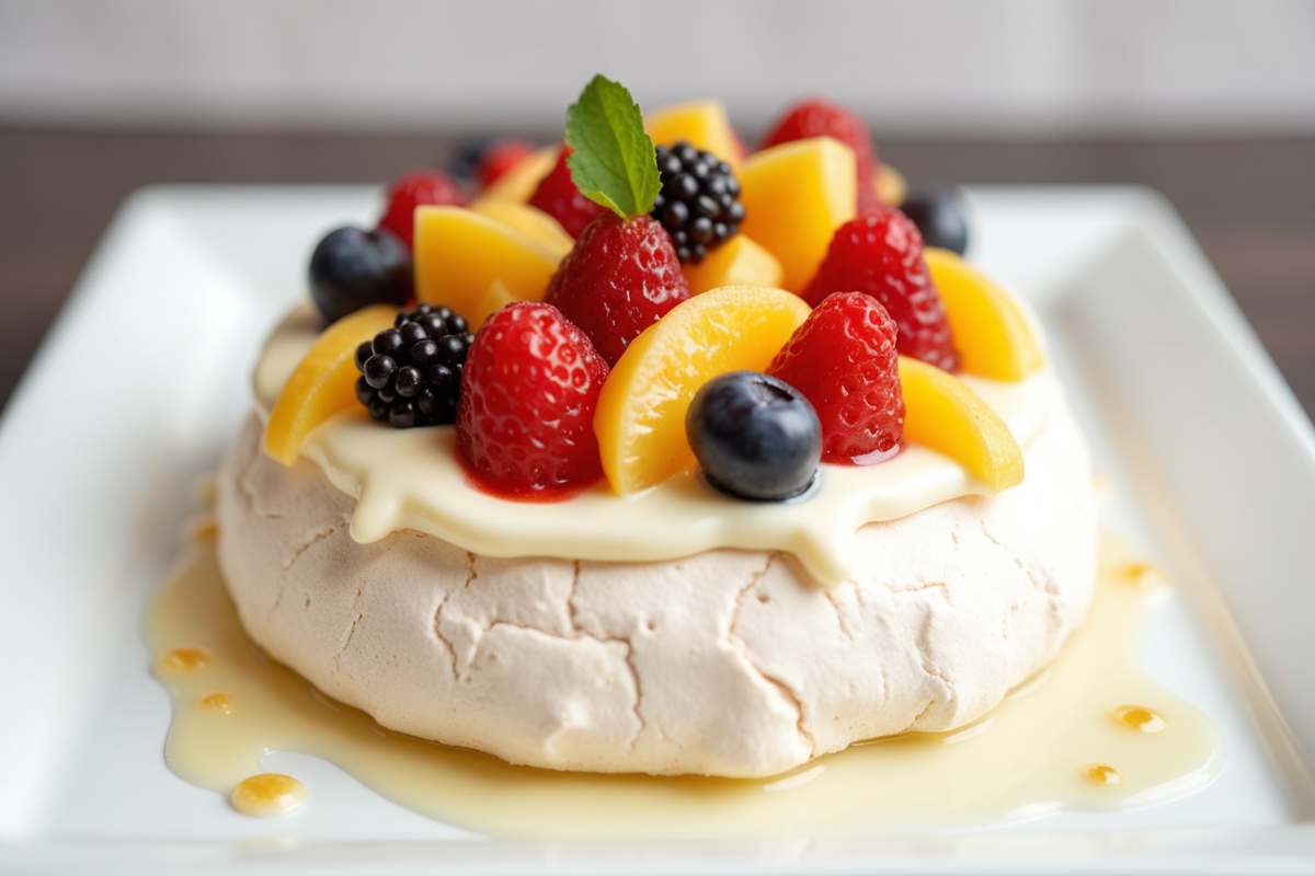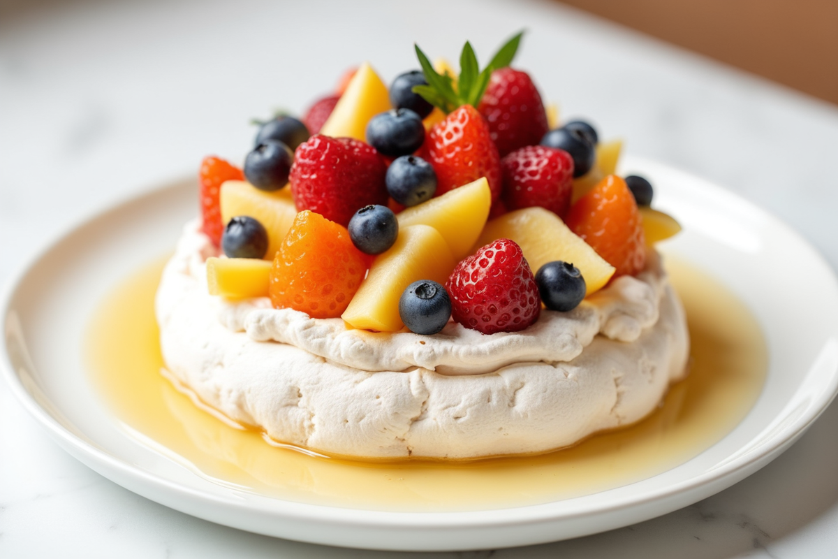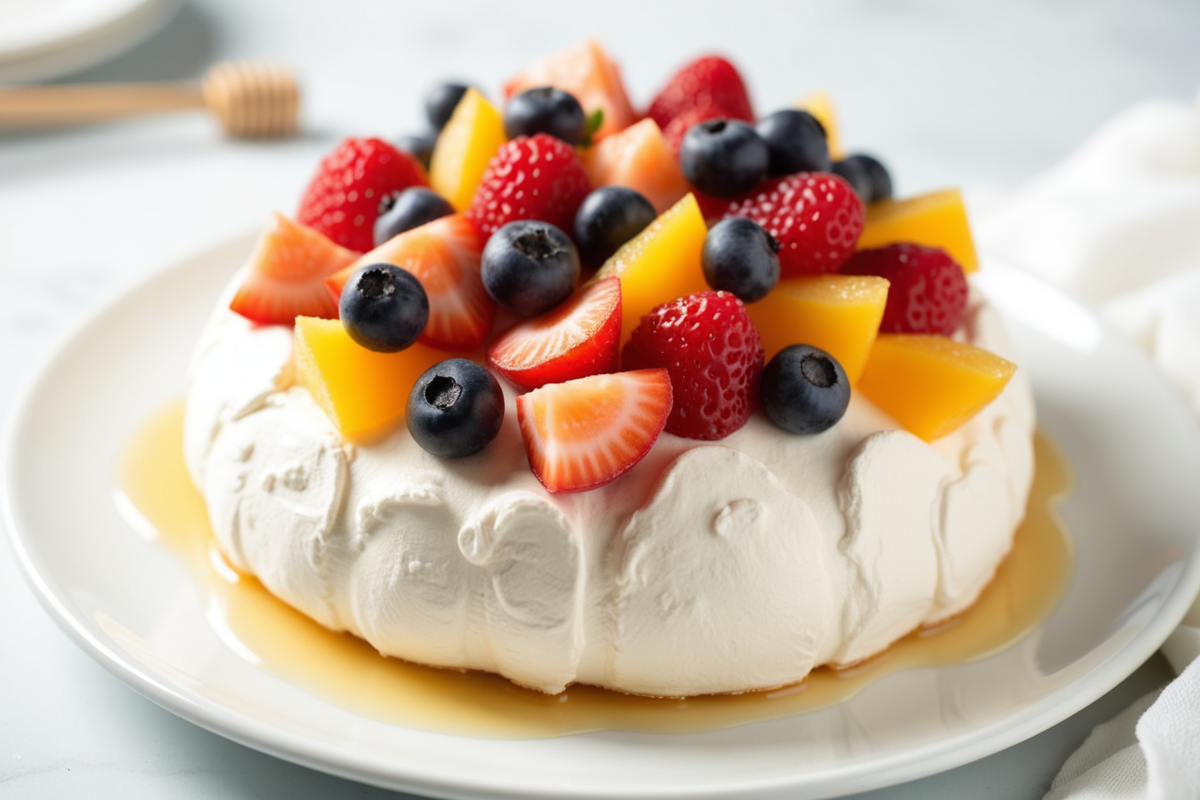 sweets dessert sweet fresh fruit white plate classic Fruit pavlova honey drizzle crisp meringue