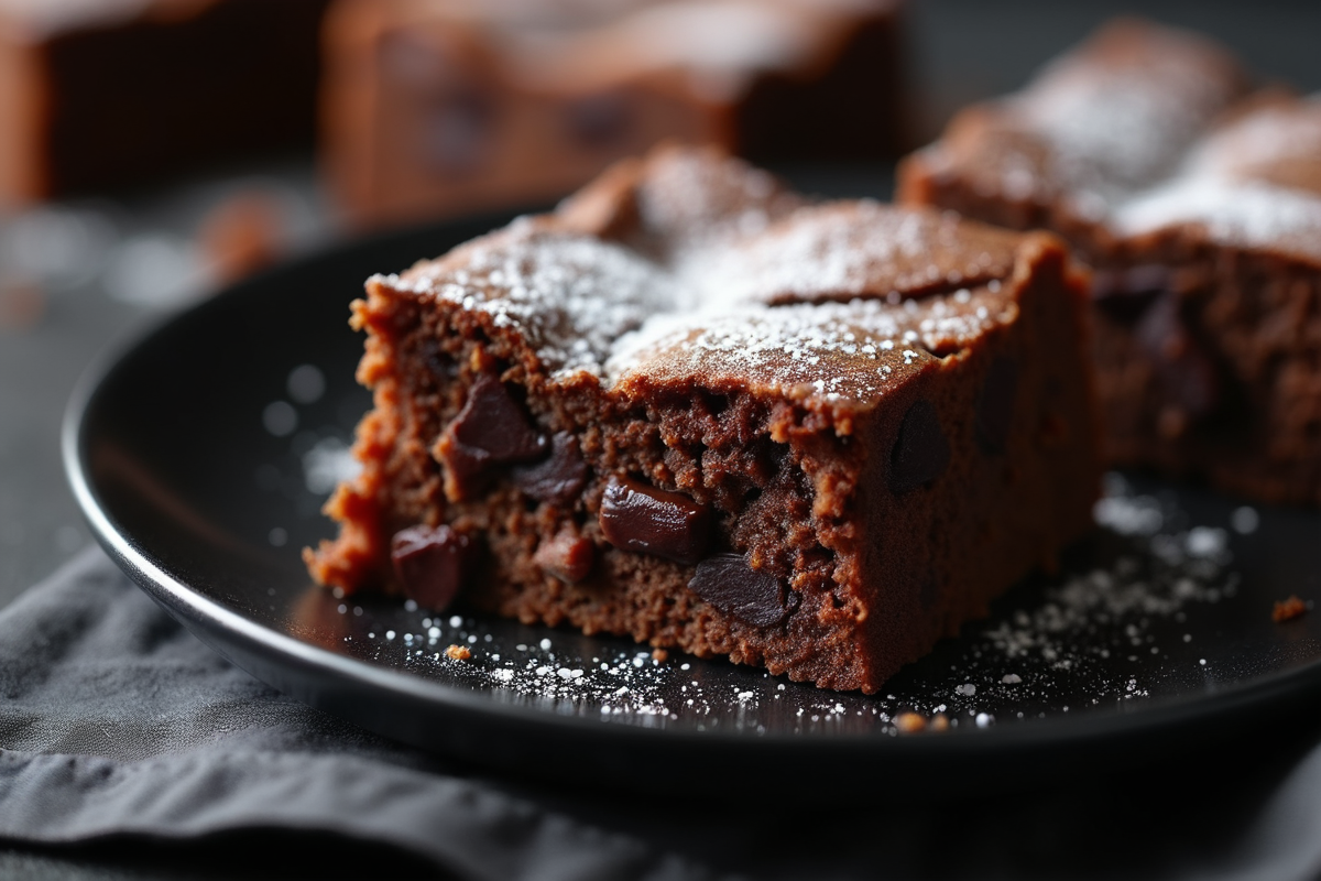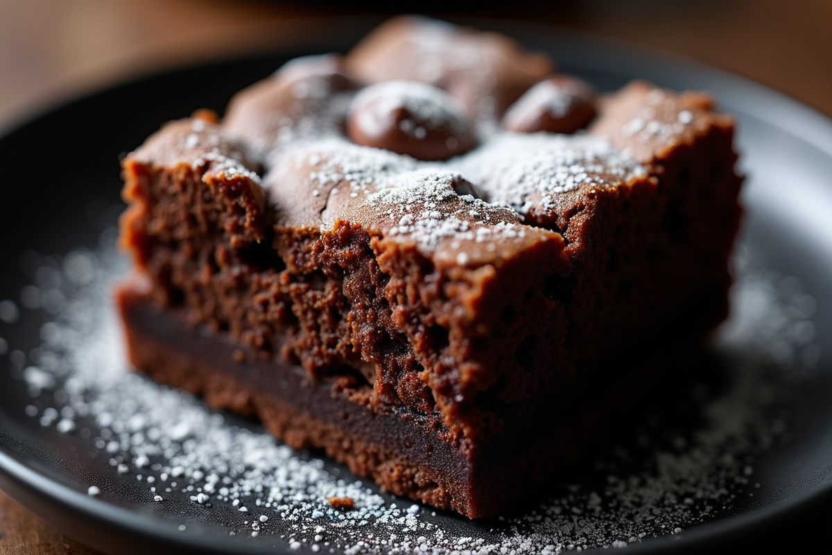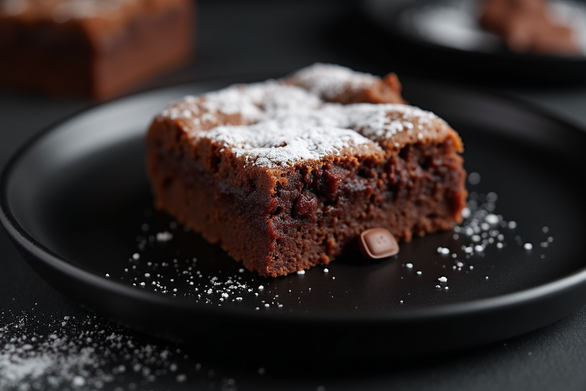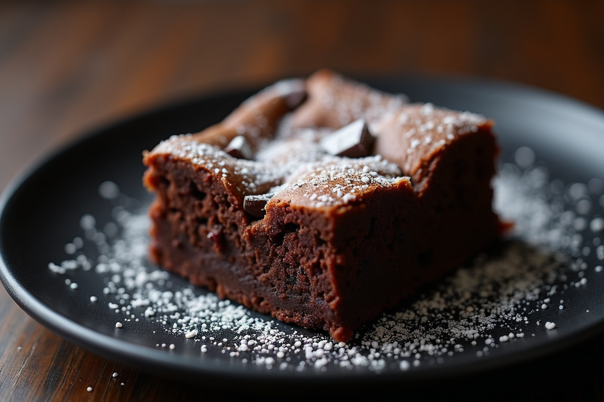 close-up sweets dessert sweet rich powdered sugar black plate chocolate chunks fudgy Brownie single