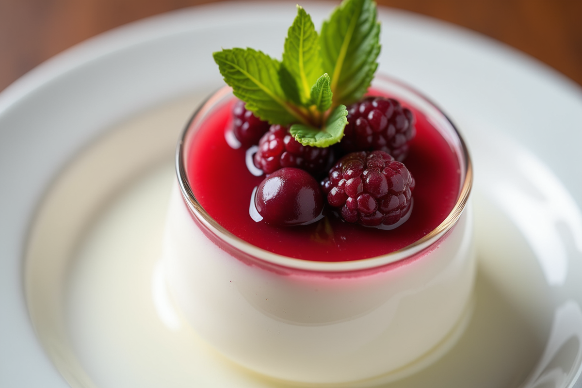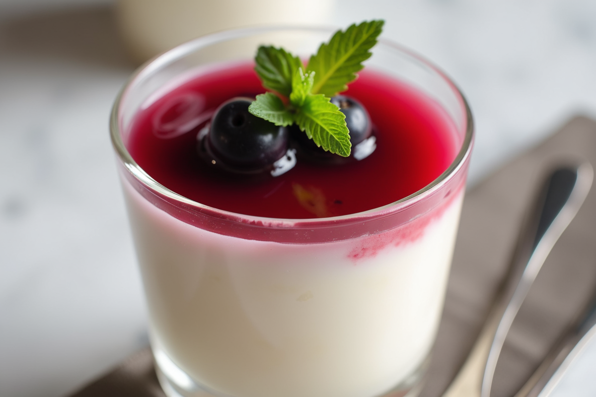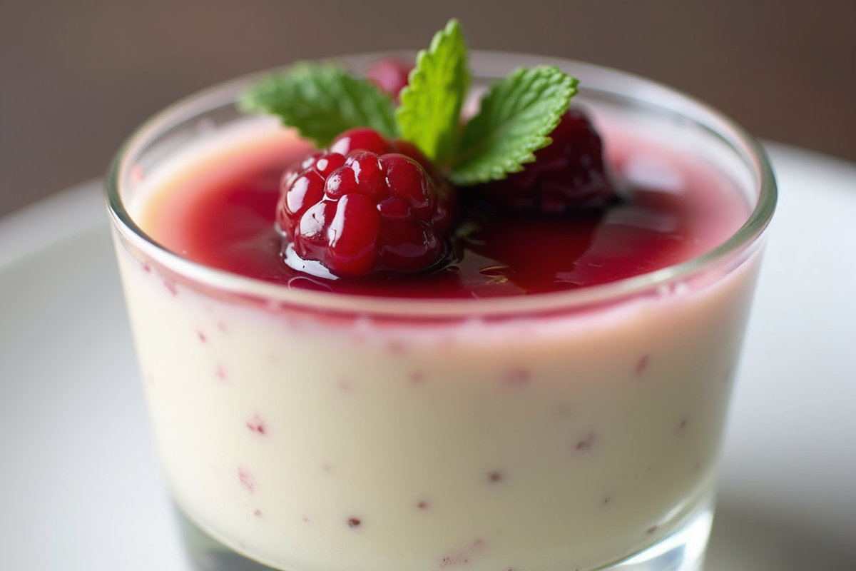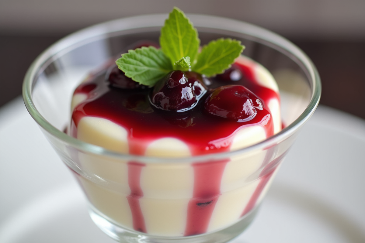 Smooth sweets dessert sweet mint leaves clear glass cup Panna cotta berry sauce creamy