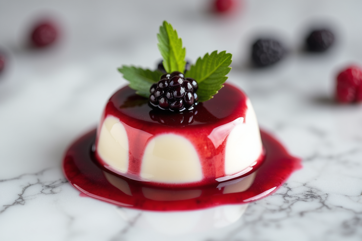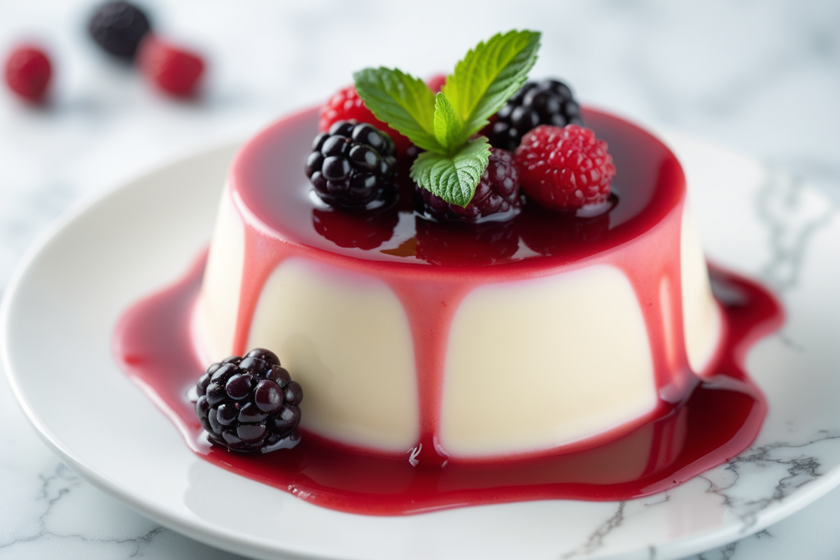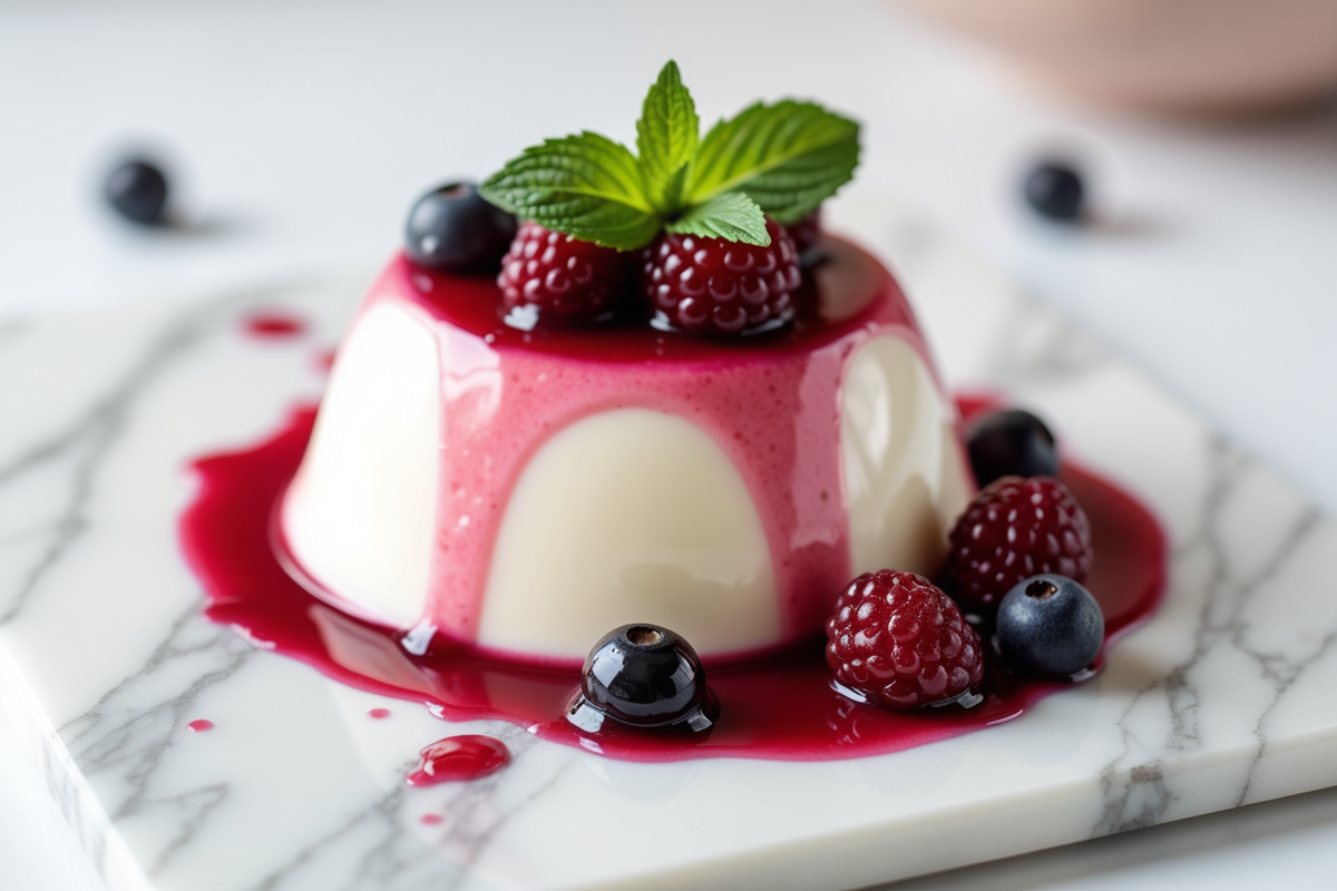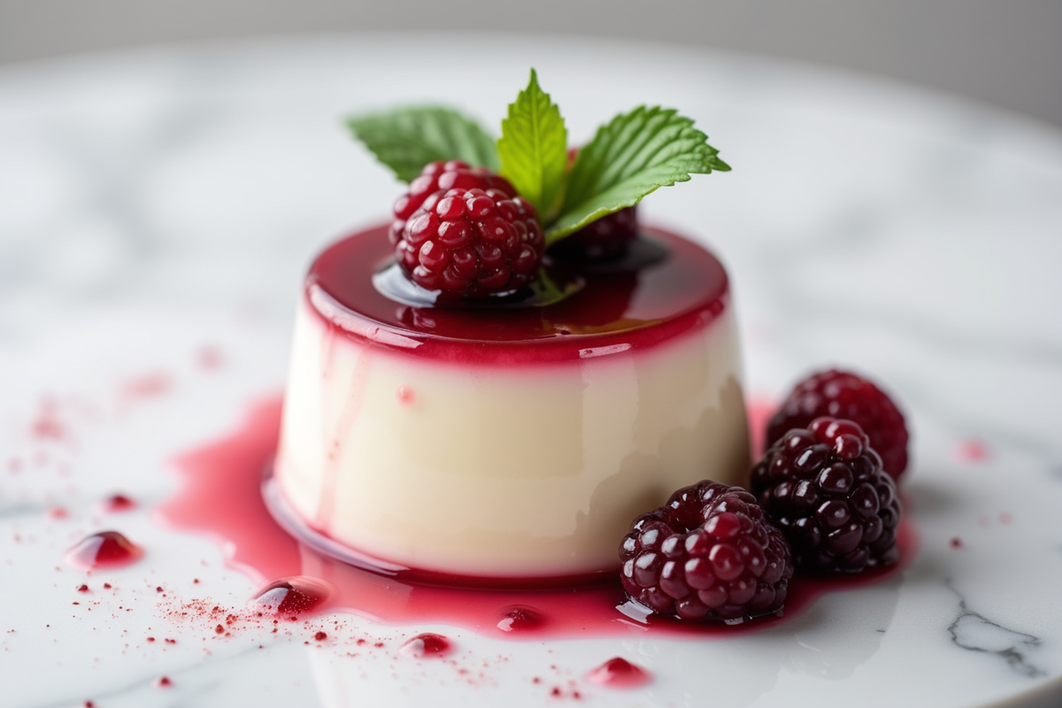 Smooth sweets dessert sweet marble surface creamy texture styled mint Panna cotta berry sauce berries