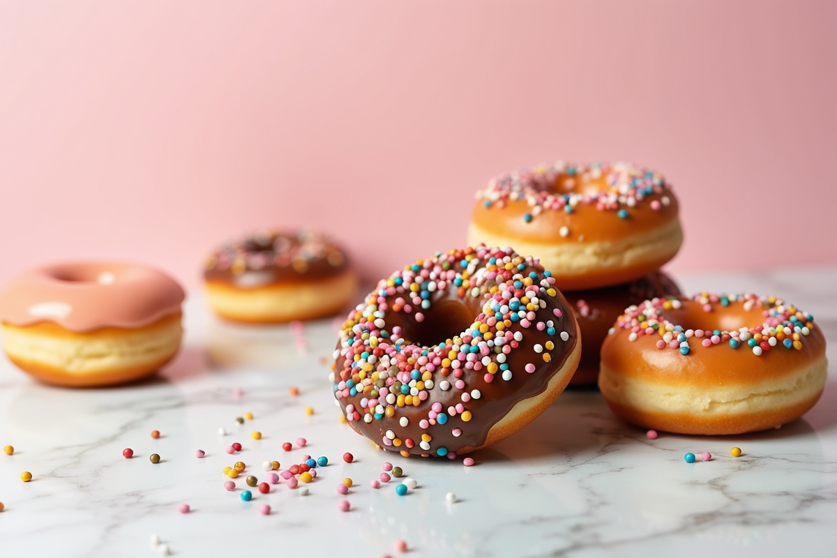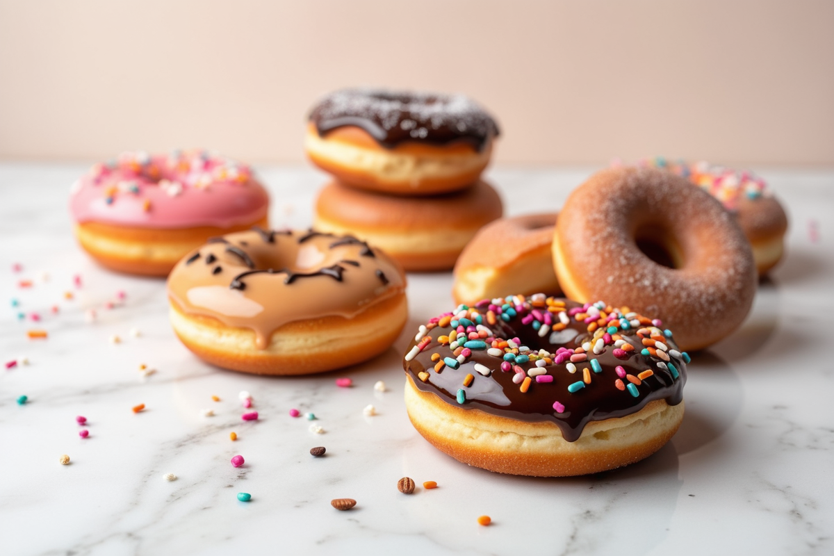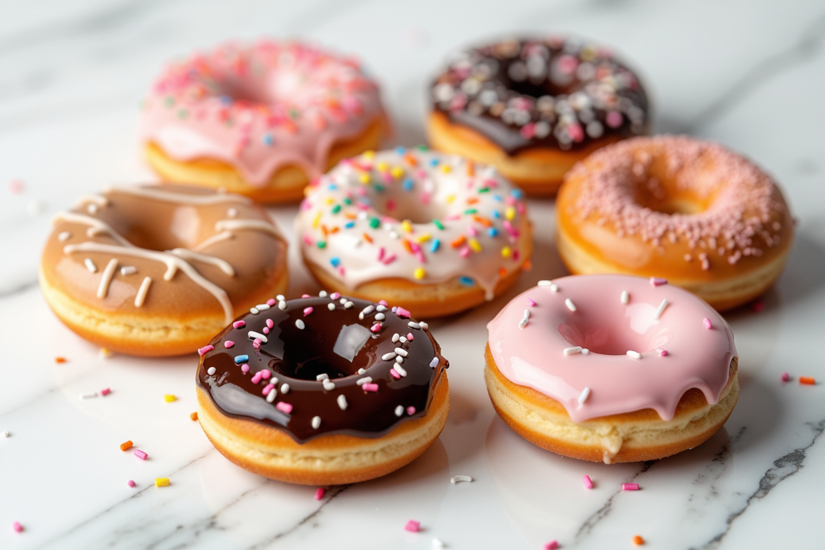 sweets dessert sweet powdered sugar marble surface classic assorted Donuts sprinkles colorful glazes