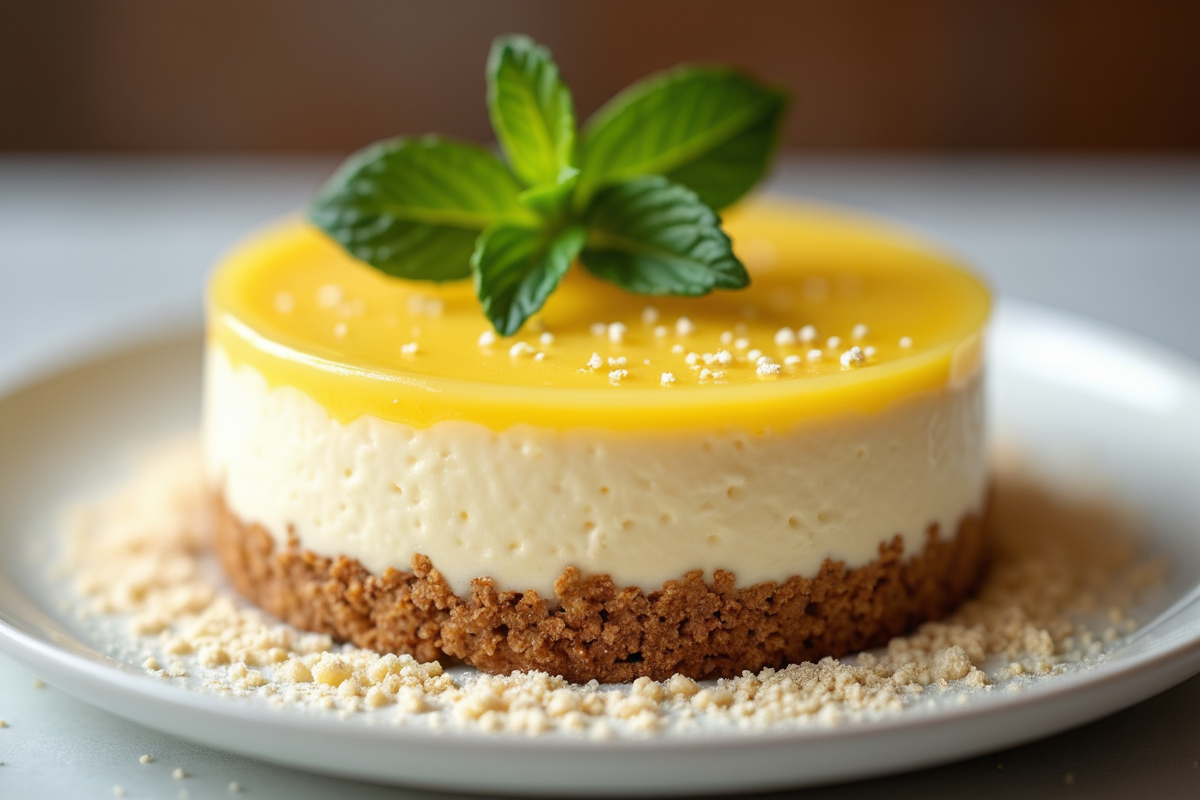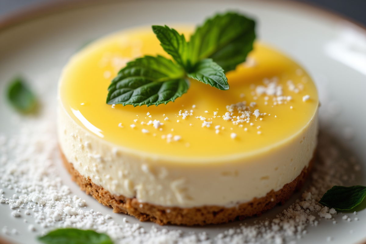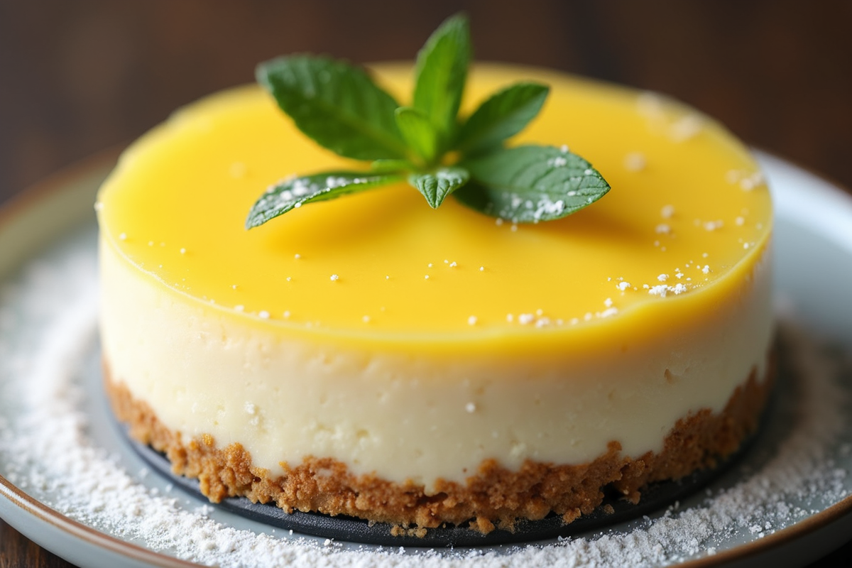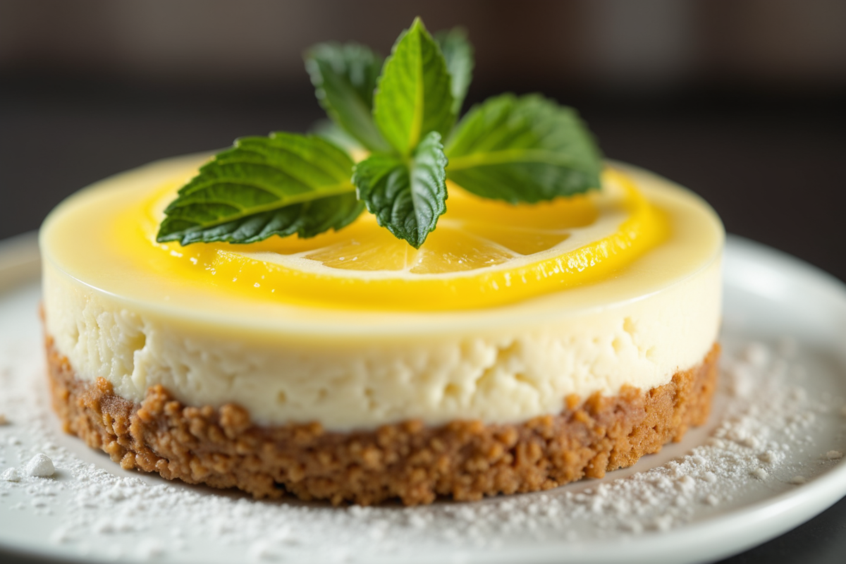 elegant dessert powdered sugar mint leaves Cheesecake global dessert graham cracker crust lemon curd