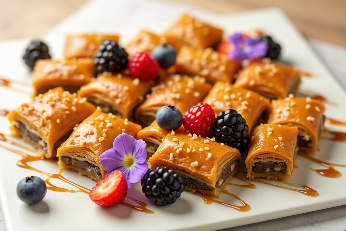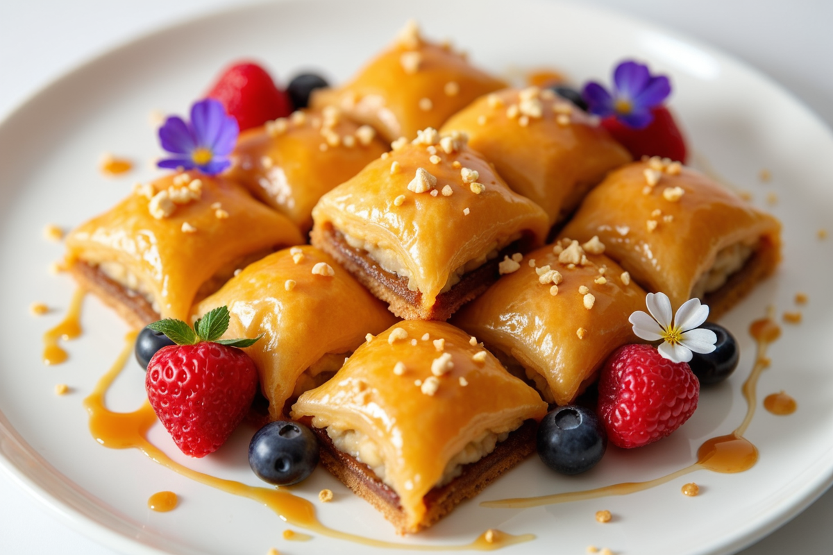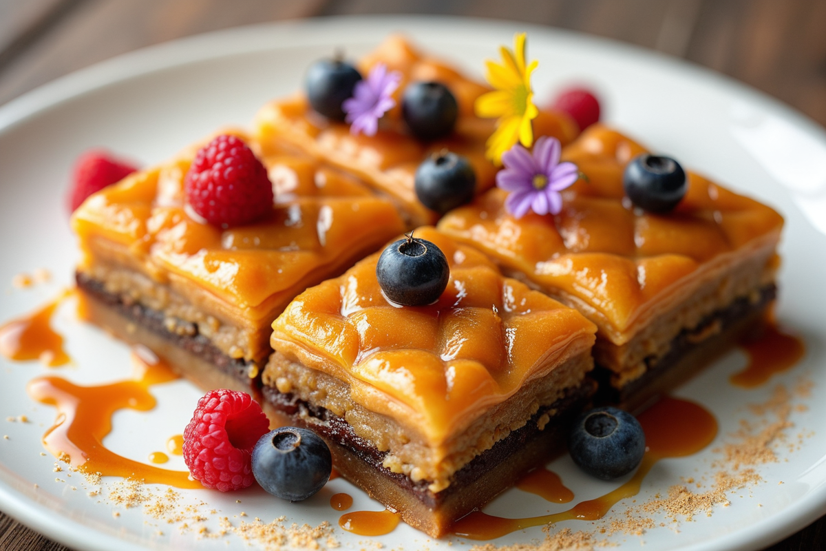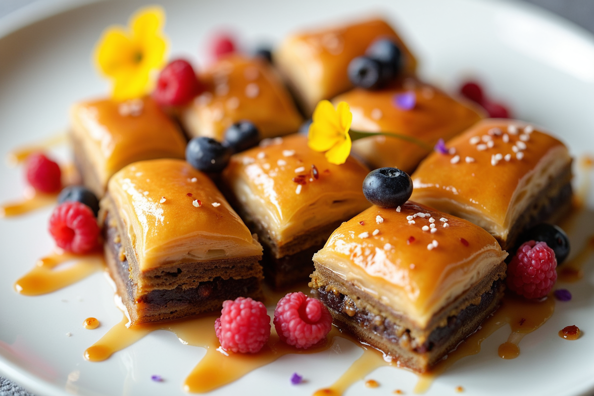 Artistic dessert edible flowers global dessert caramel sauce fresh berries geometric pattern Baklava