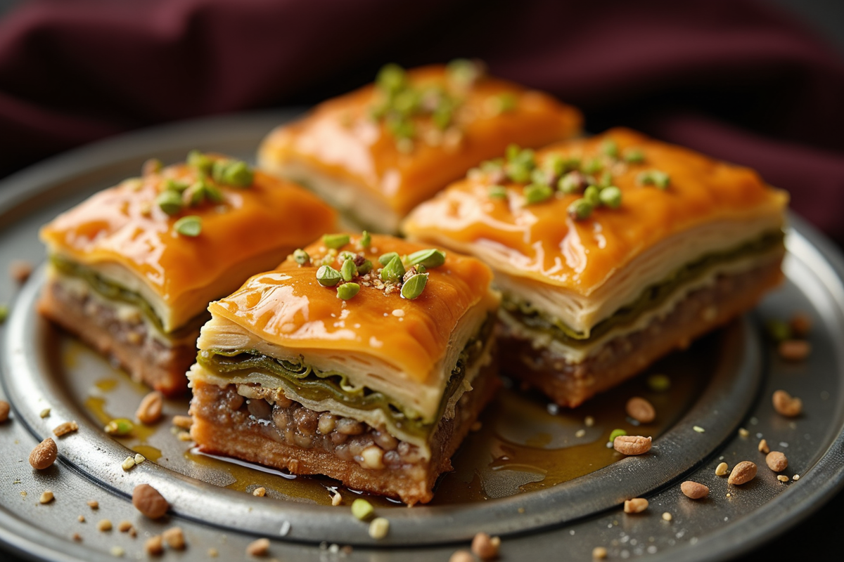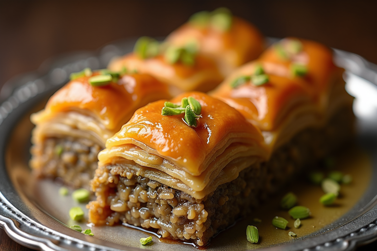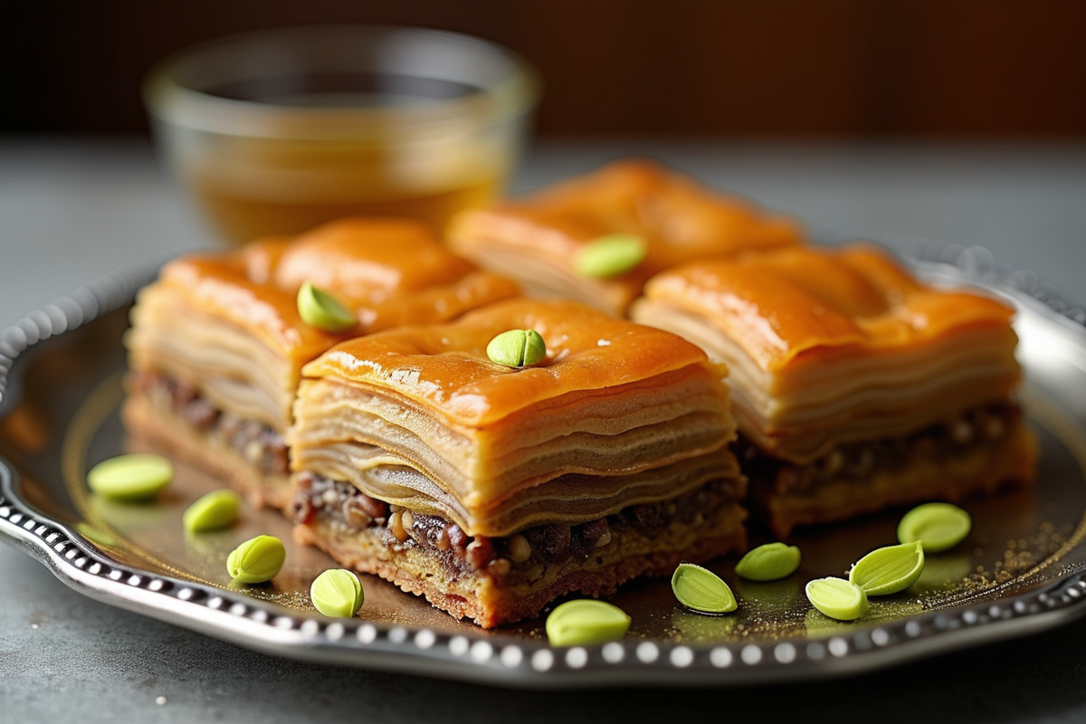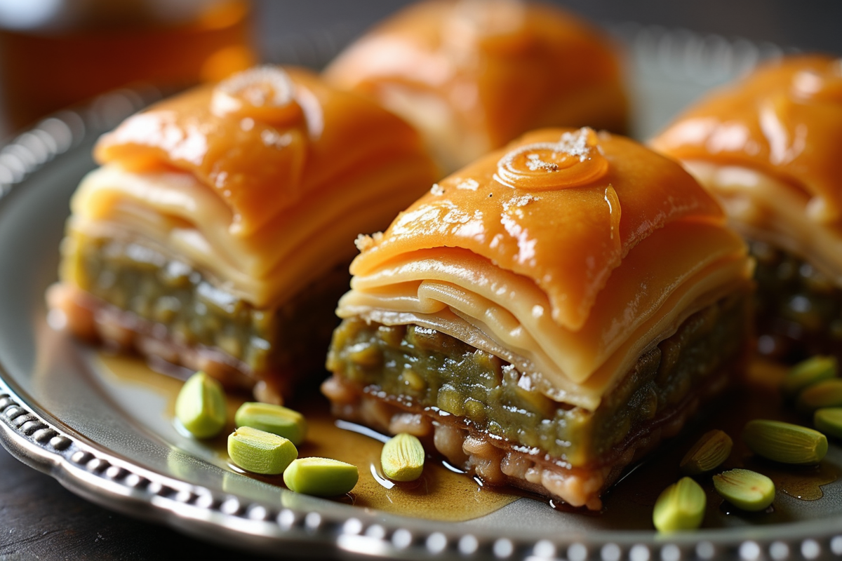 dessert classic honey drizzle global dessert silver tray Baklava nut filling golden exterior pistachios