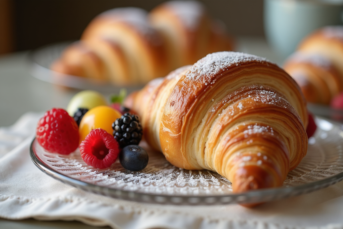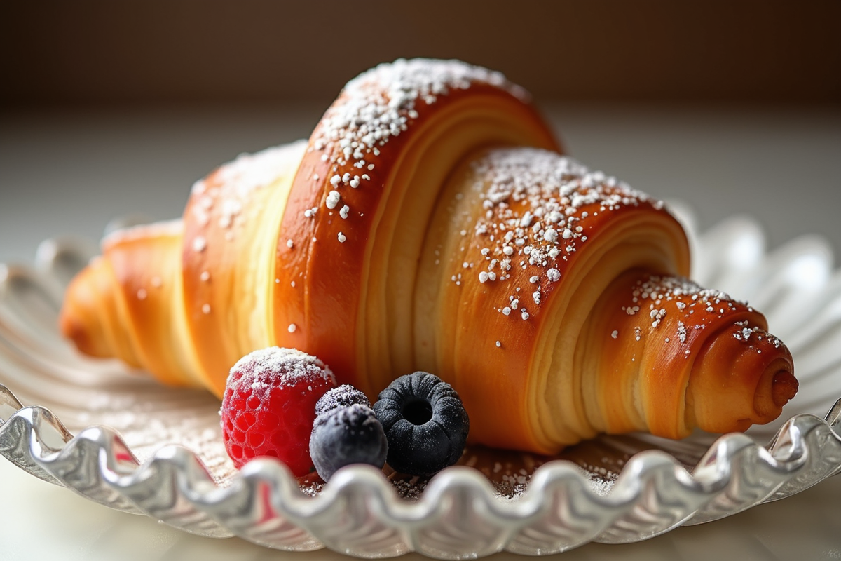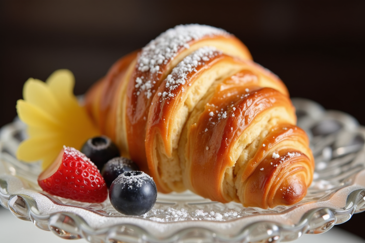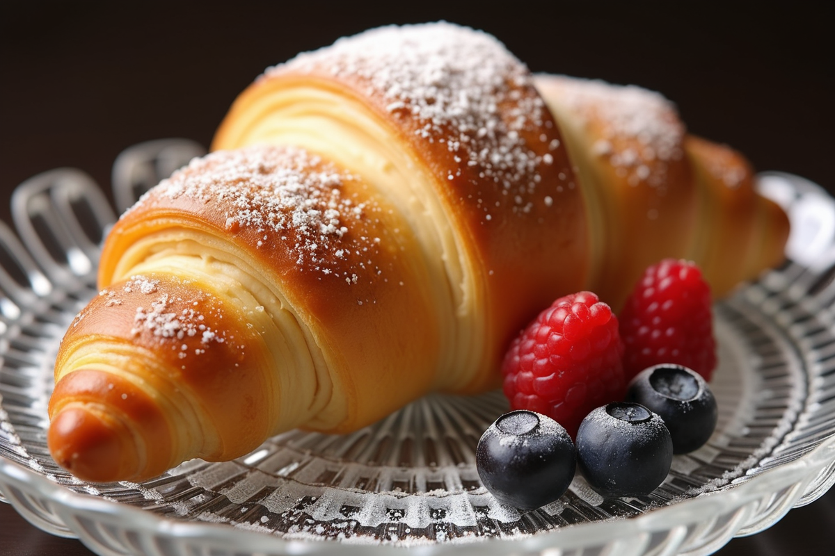 elegant dessert powdered sugar fresh fruit crystal dish Croissant global pastry golden surface