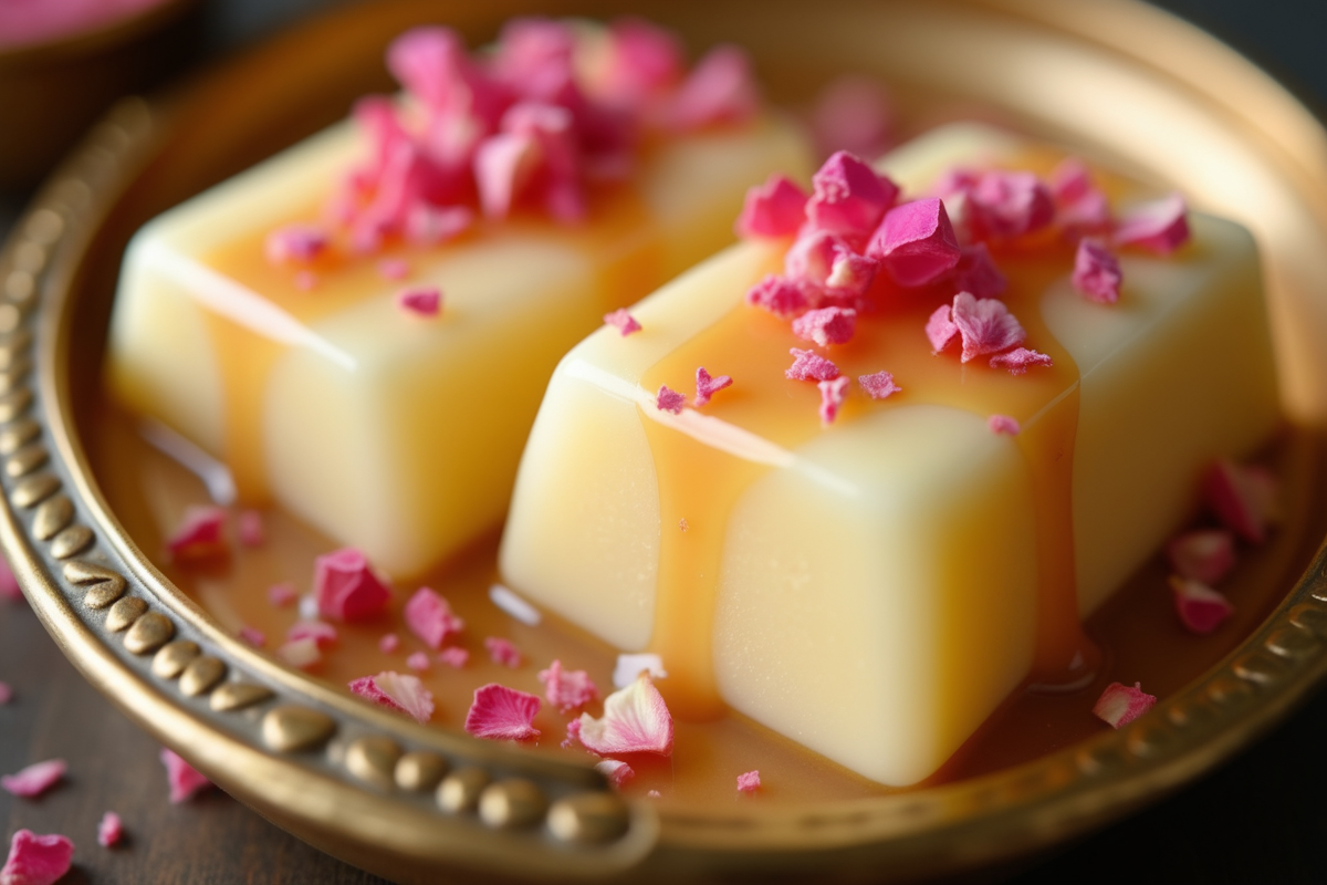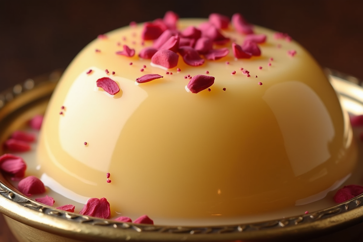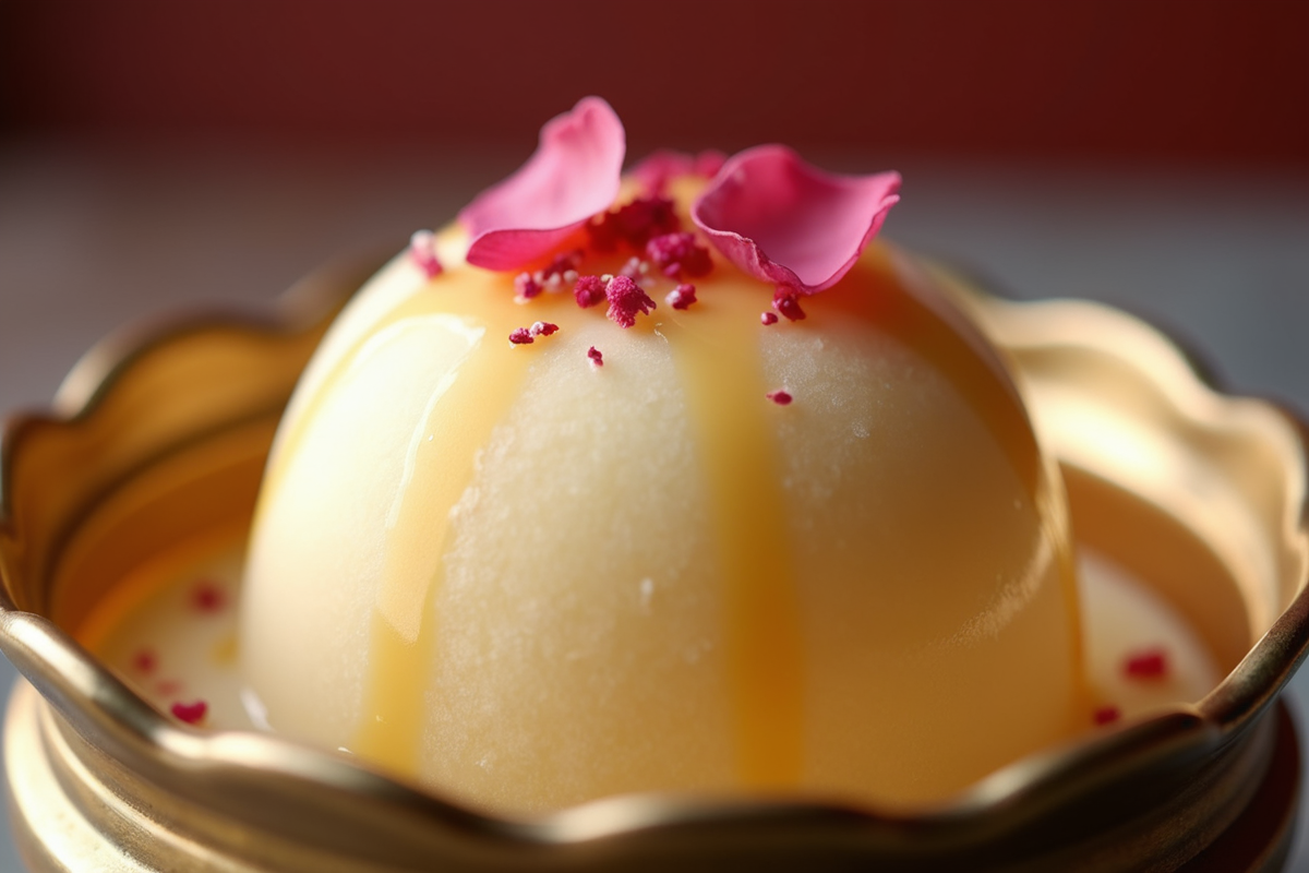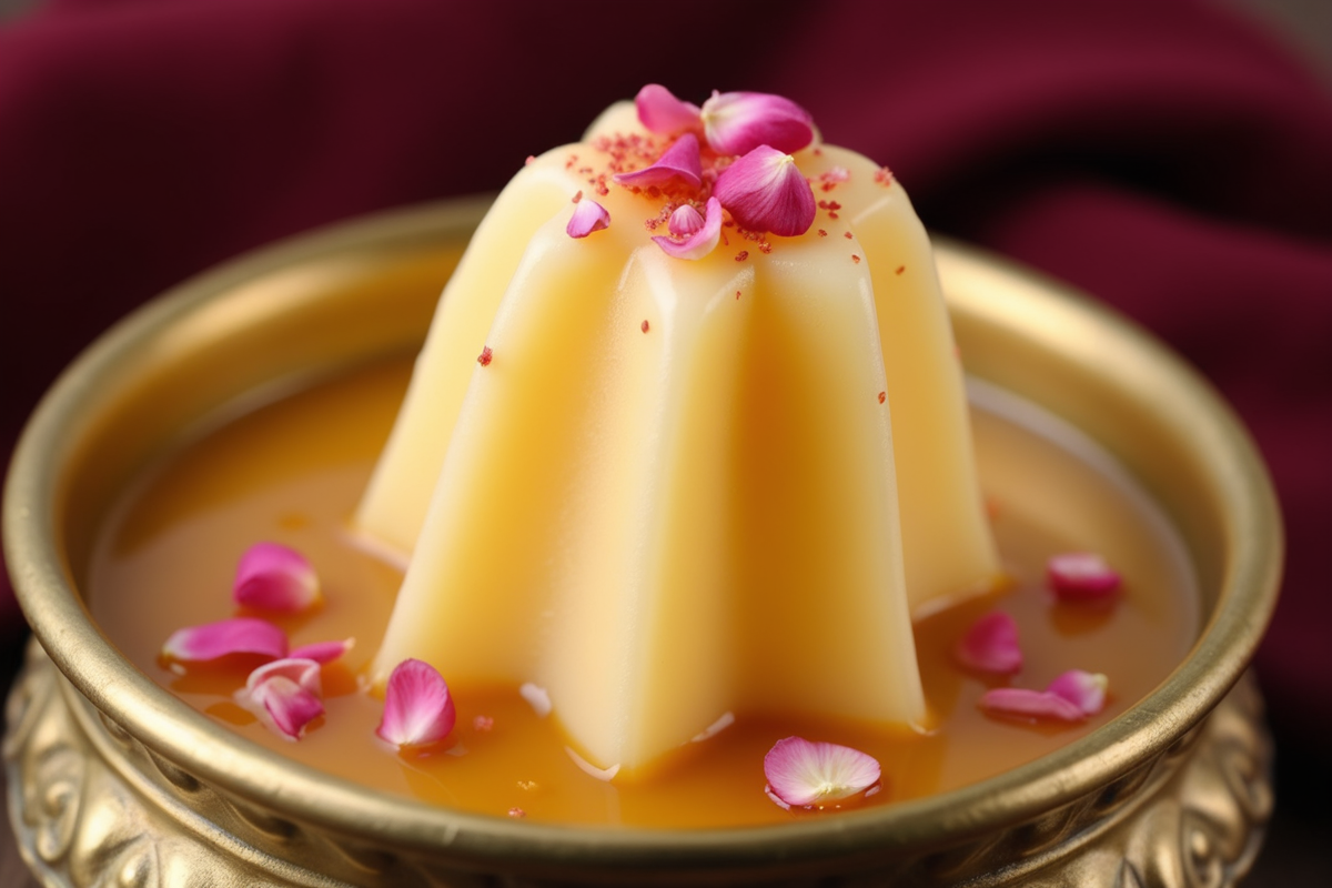close-up dessert velvety texture Kulfi Indian dessert rose petals condensed milk brass bowl