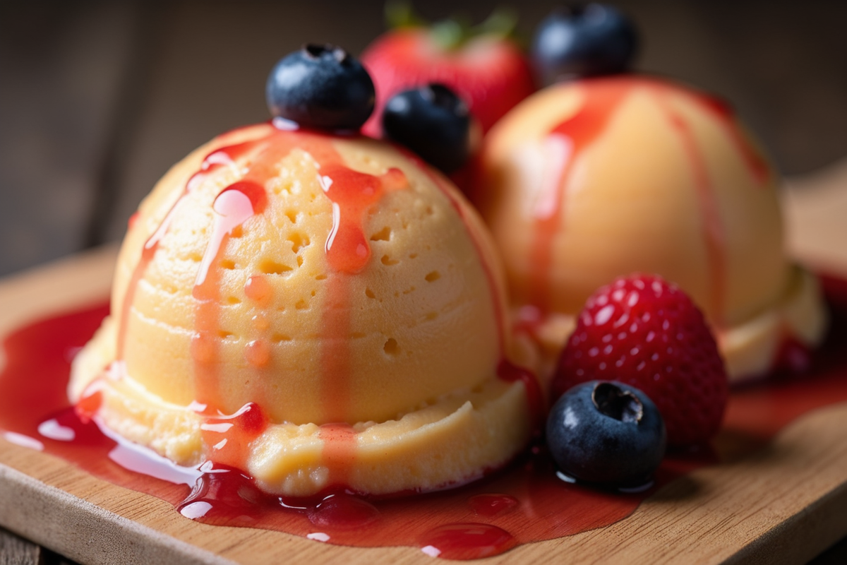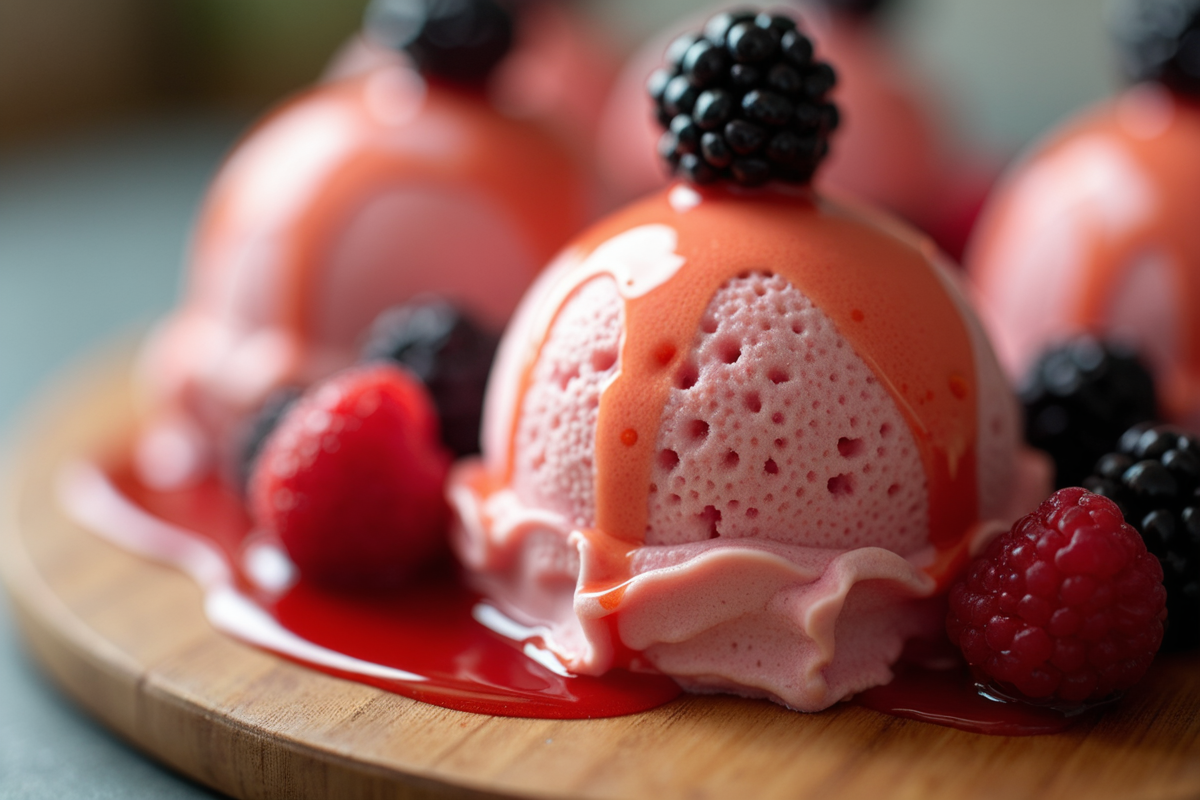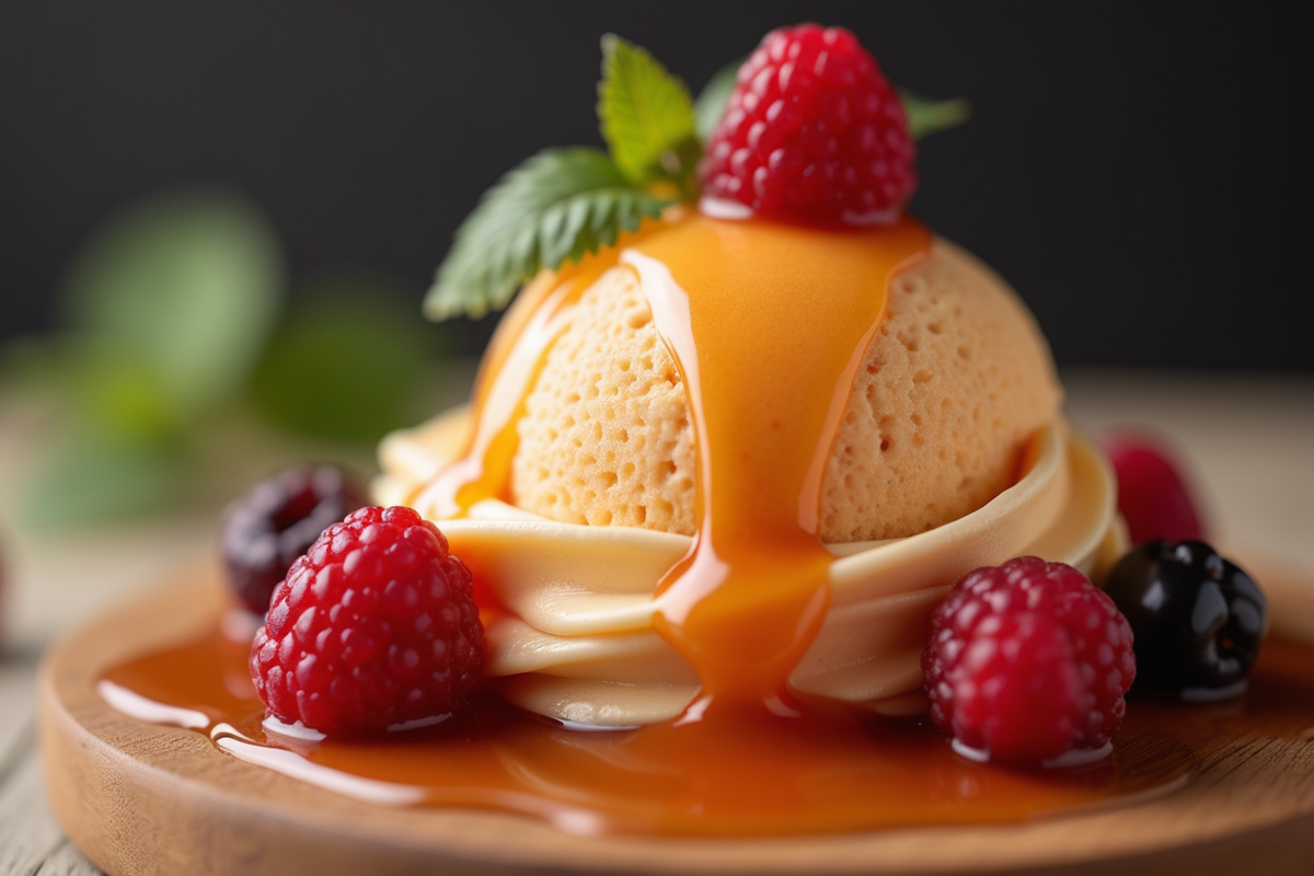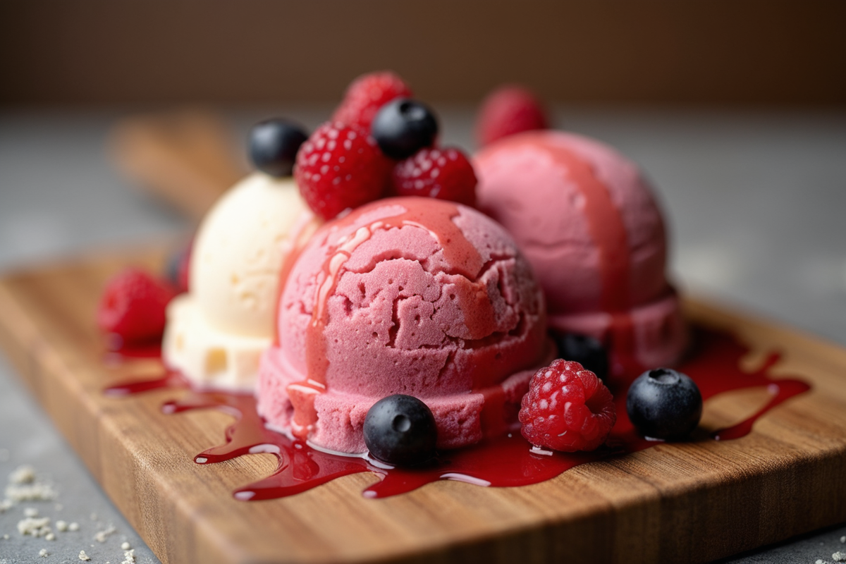 dessert wooden board creamy texture styled global dessert fresh berries fruit syrup Gelato