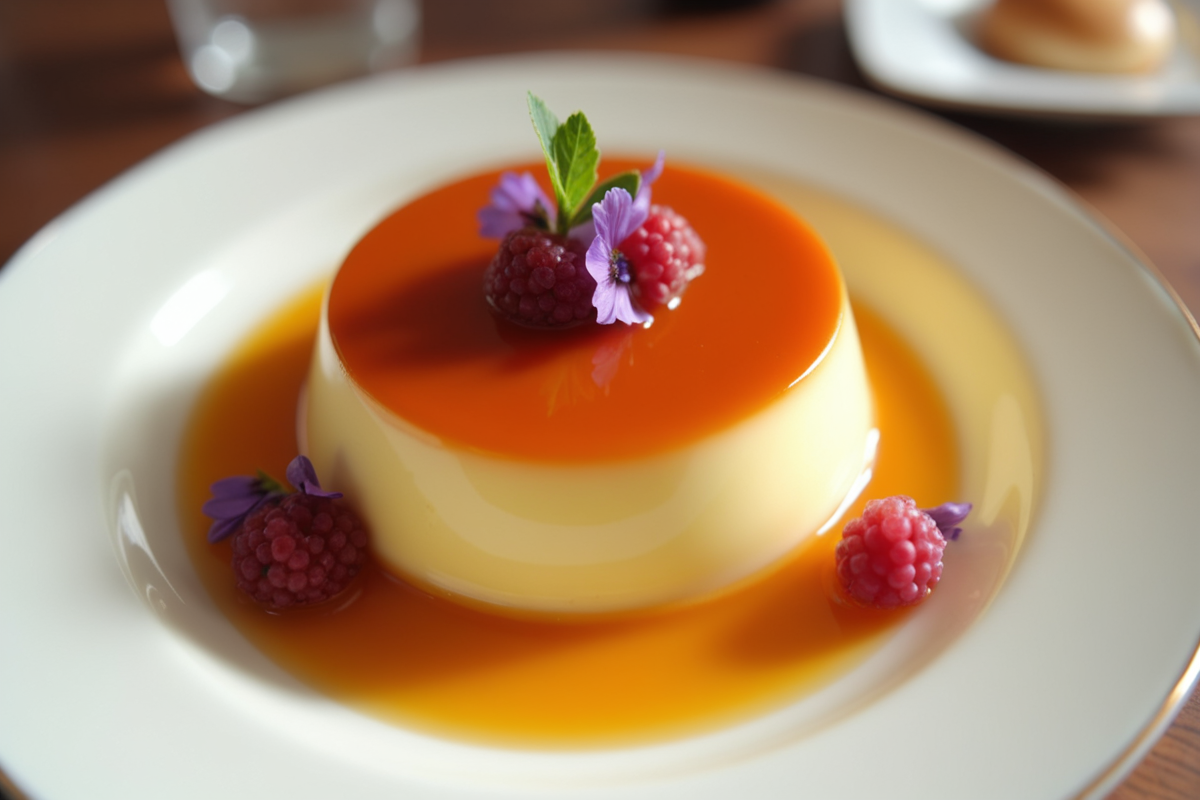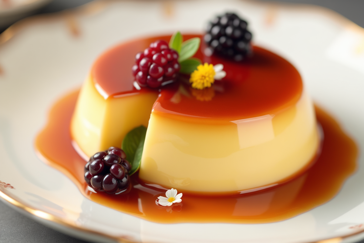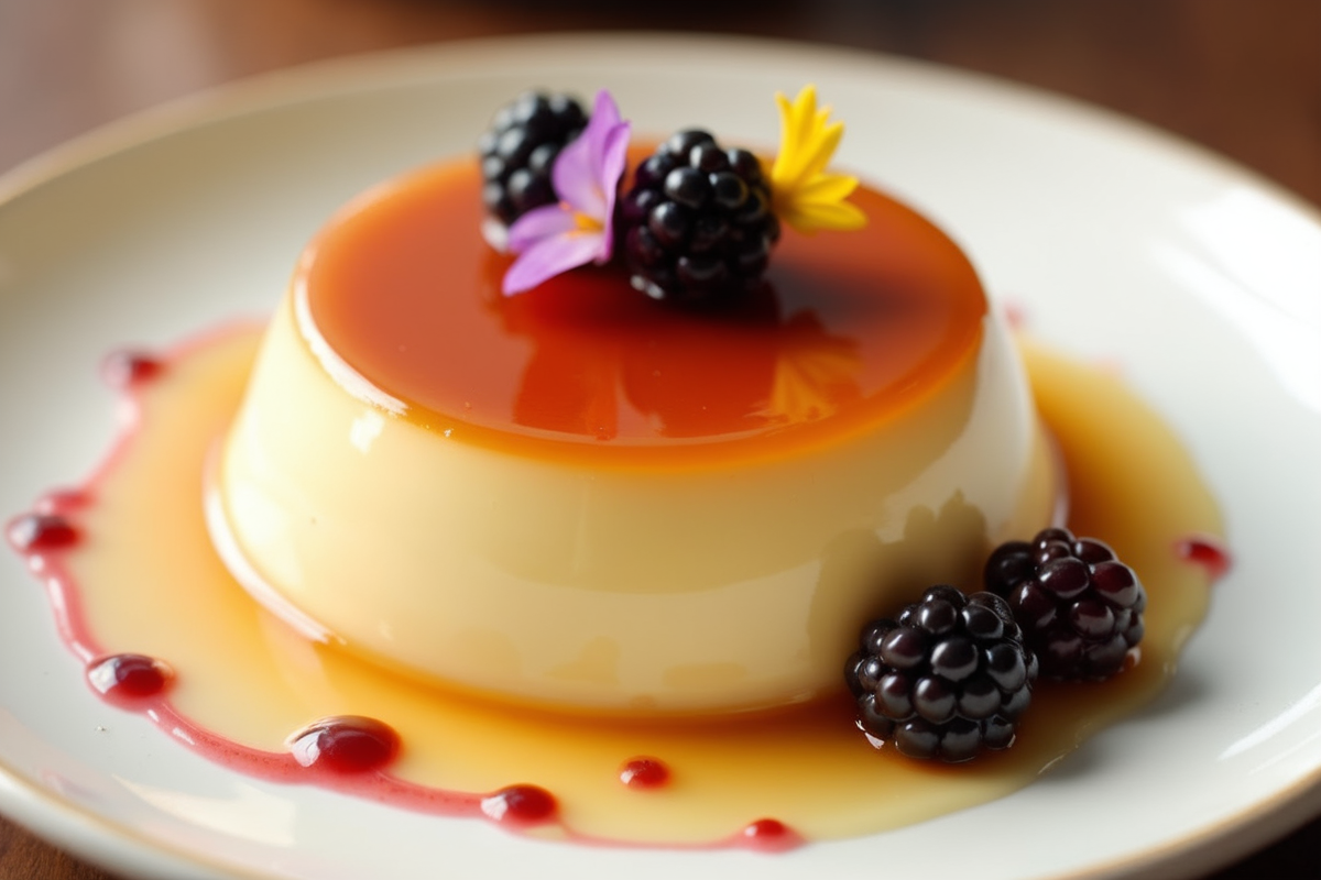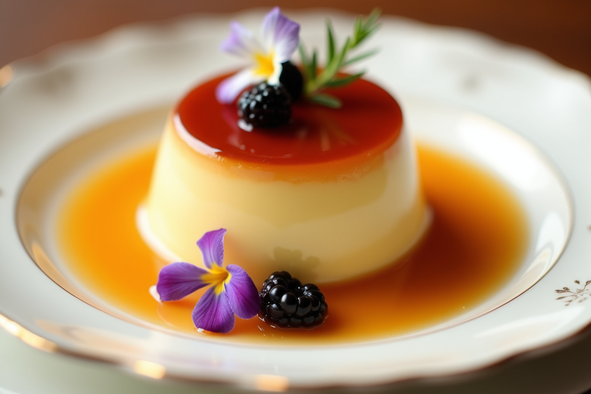 elegant dessert creamy texture edible flowers fine china plate berry sauce global dessert Flan glossy caramel