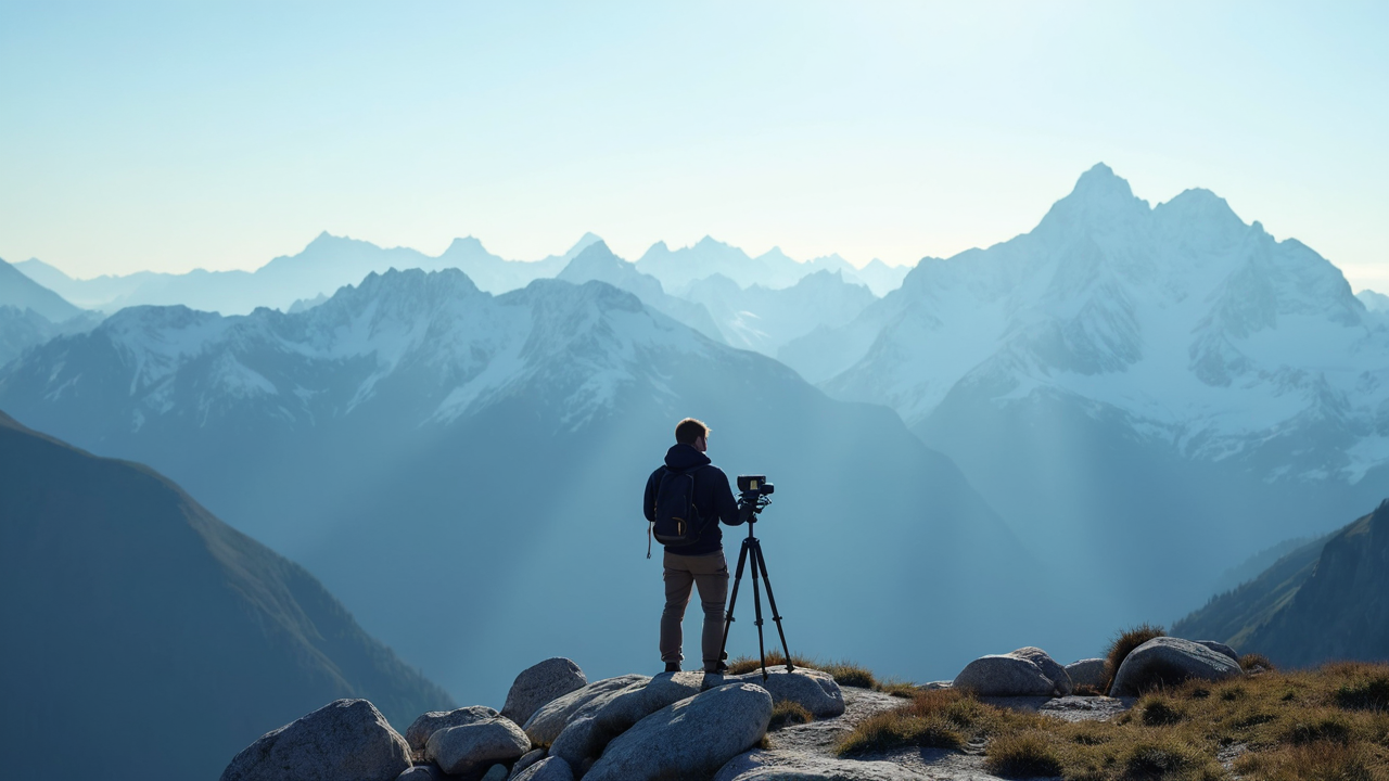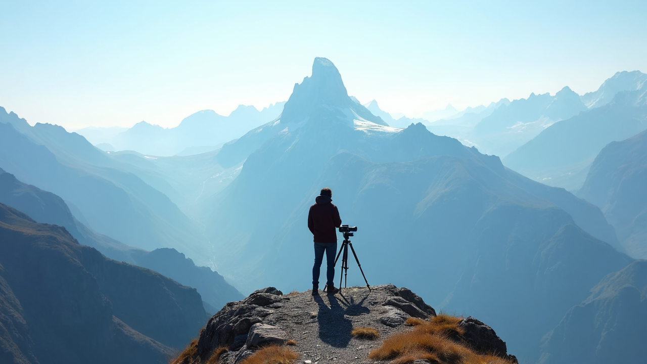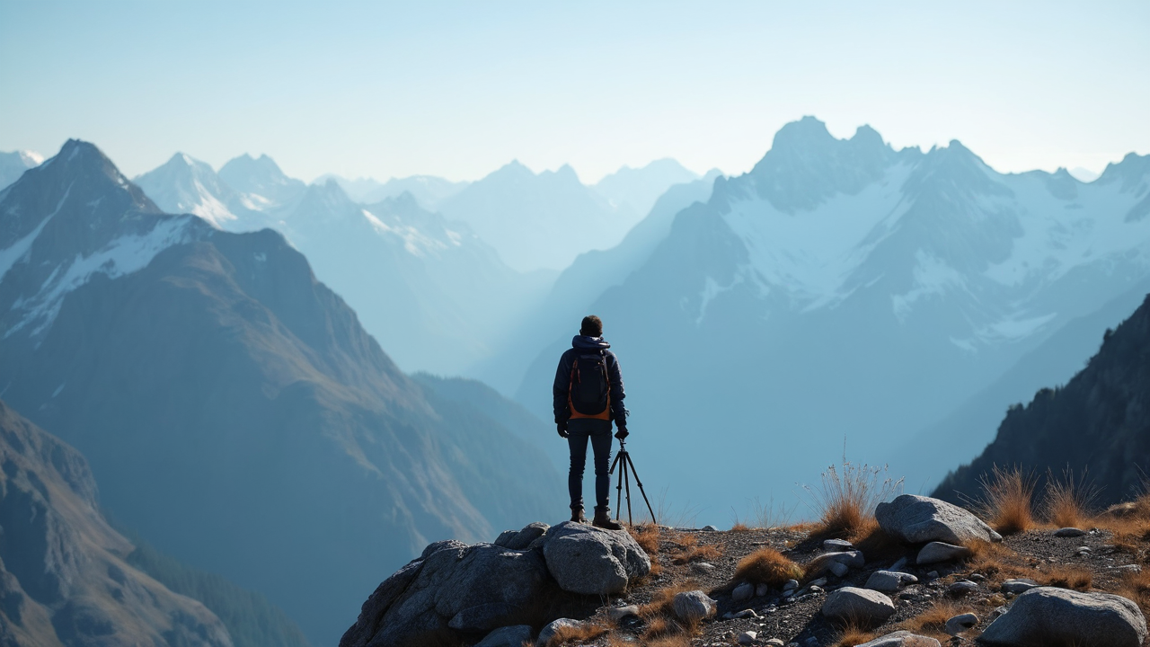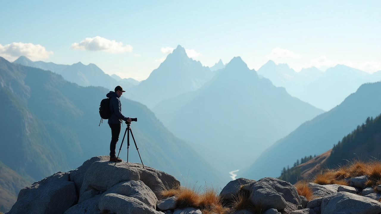 mountains hill peak hills mountain mountain range African American tripod rocky outcrop wide shot Photographer in action