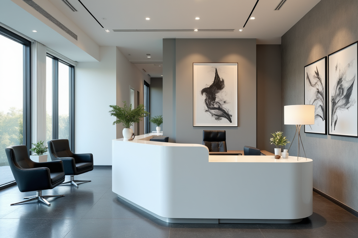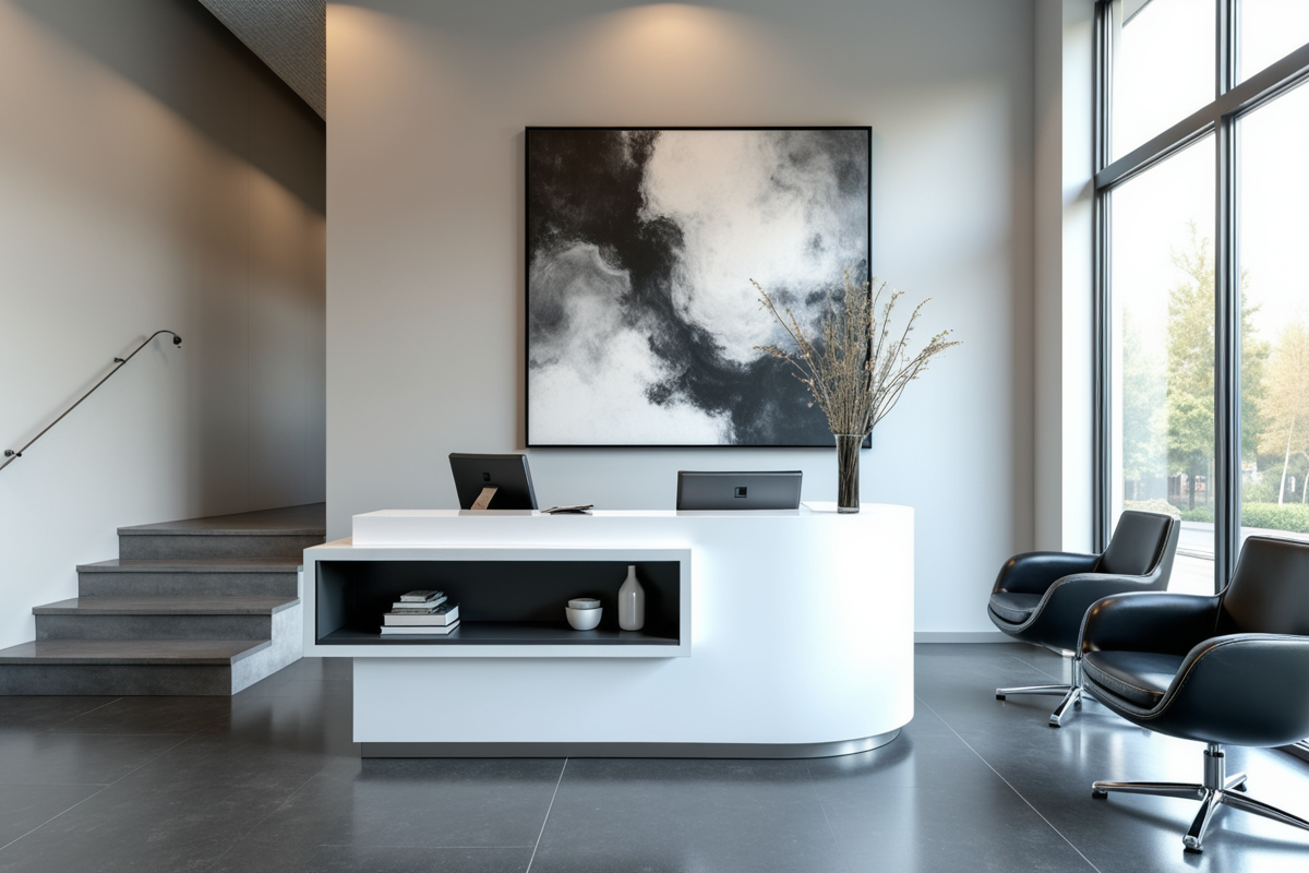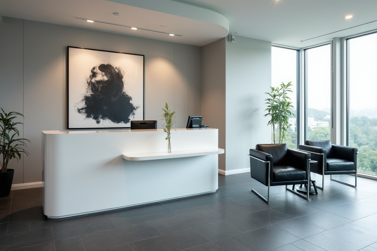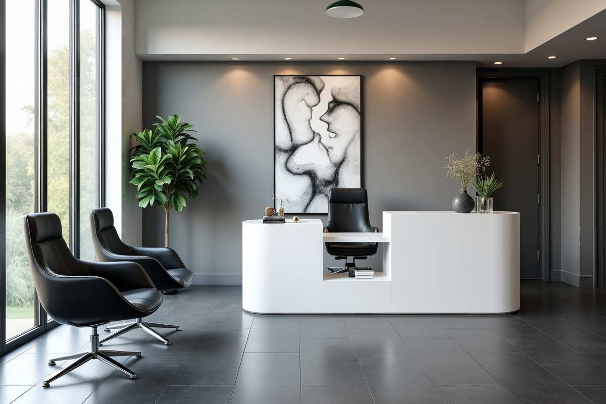 office office interior reception area office reception white desk gray art dark tiles black chairs