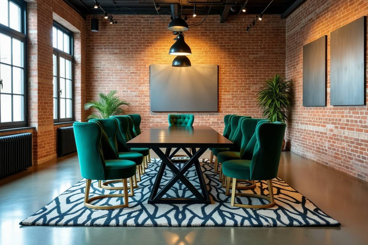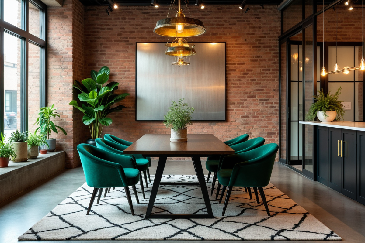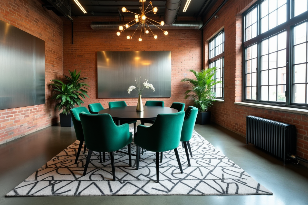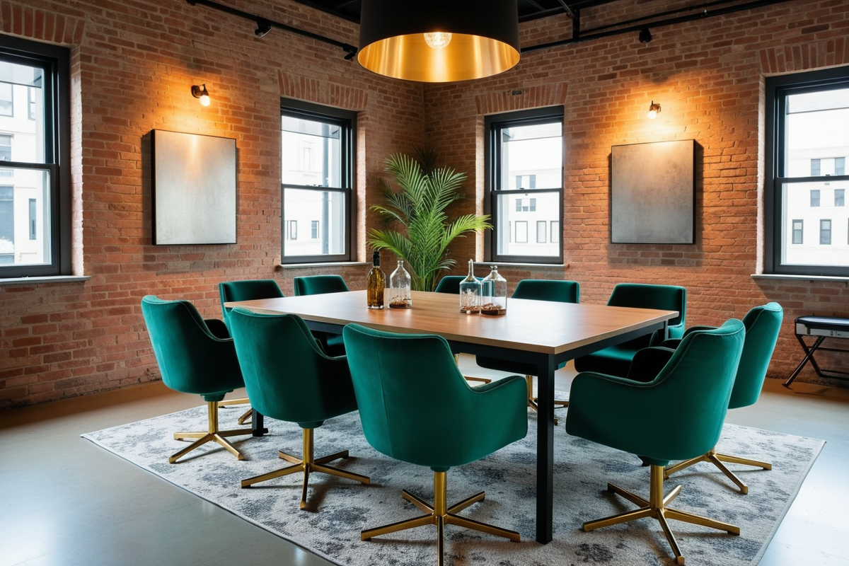 office interior velvet chairs office breakout room breakout room industrial glam metallic artwork concrete flooring