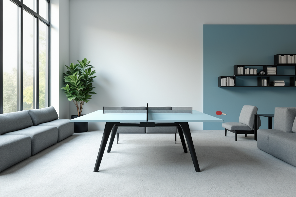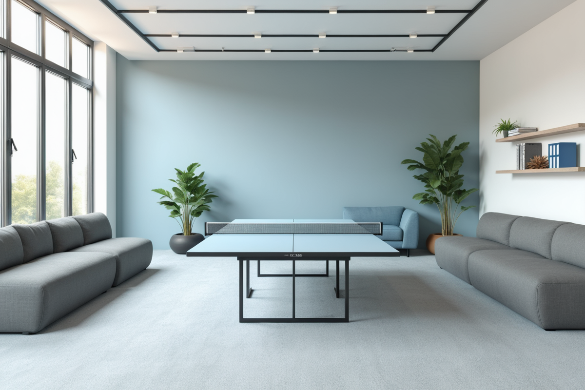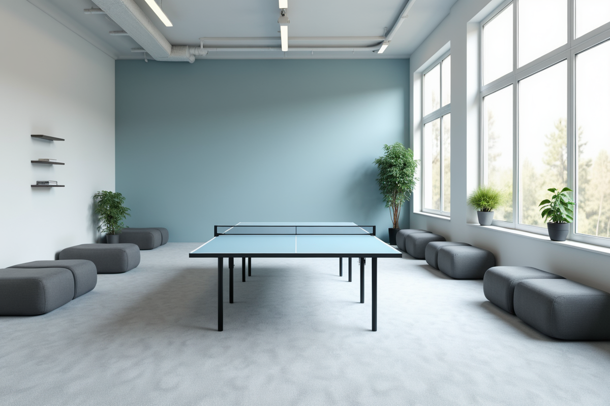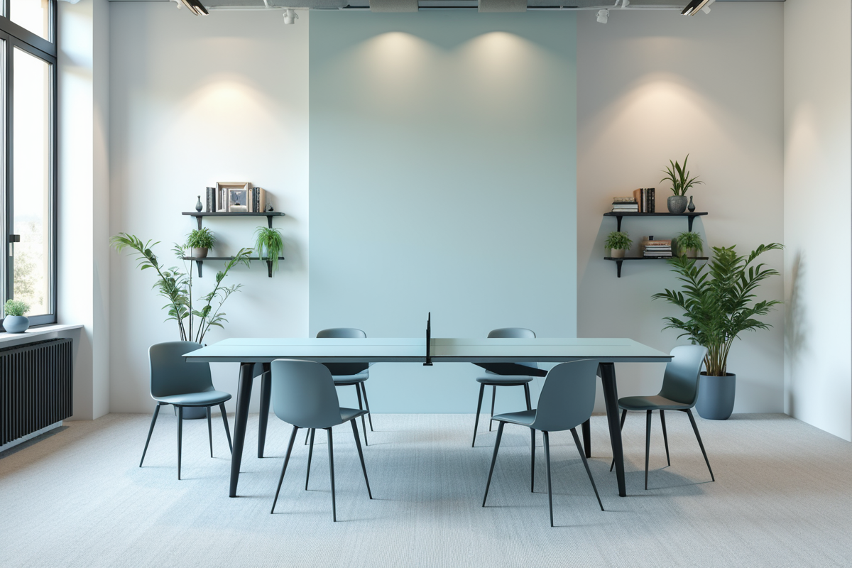 office interior play area ping pong table minimalist office play area pale blue charcoal grey floating shelves