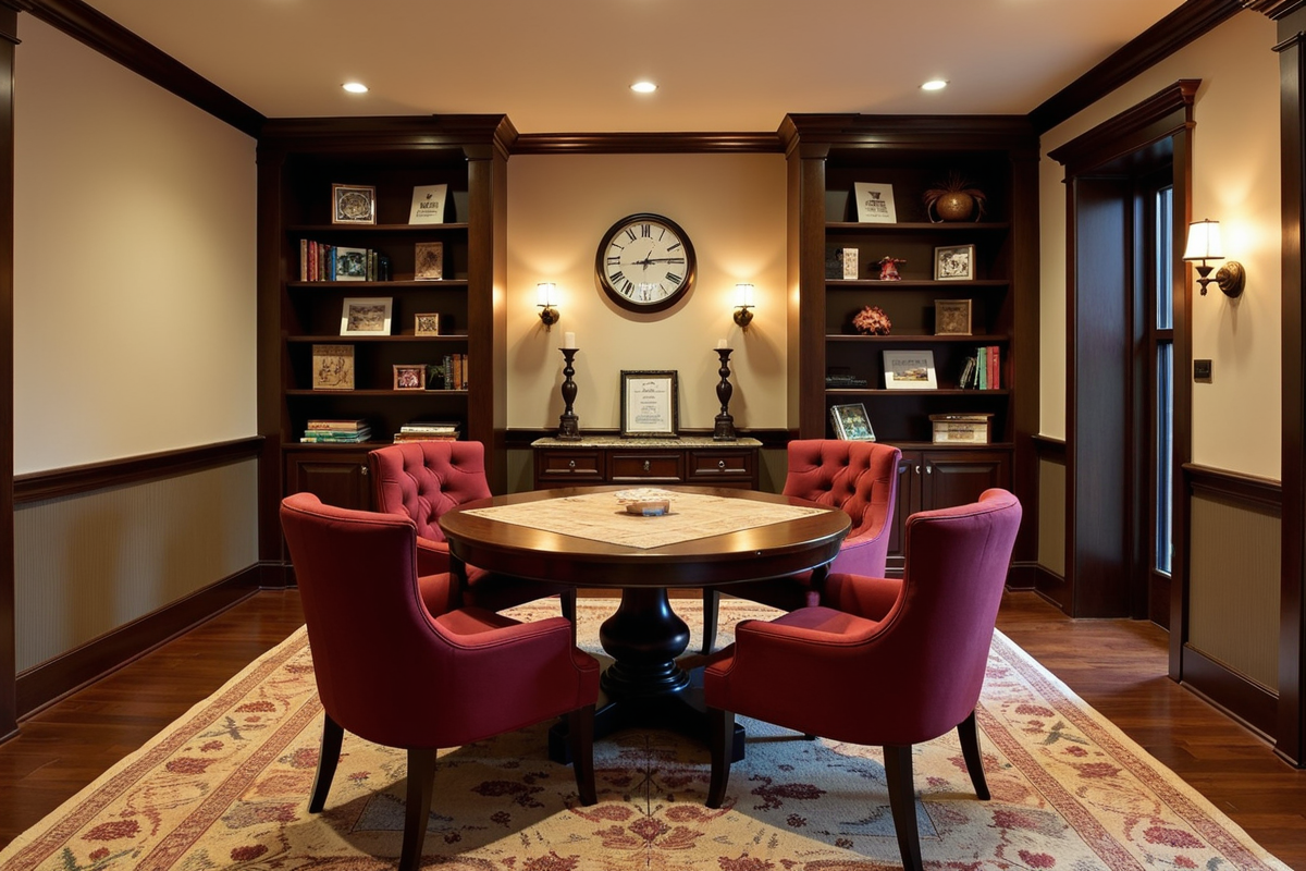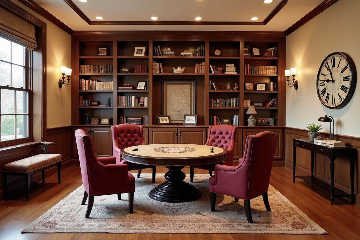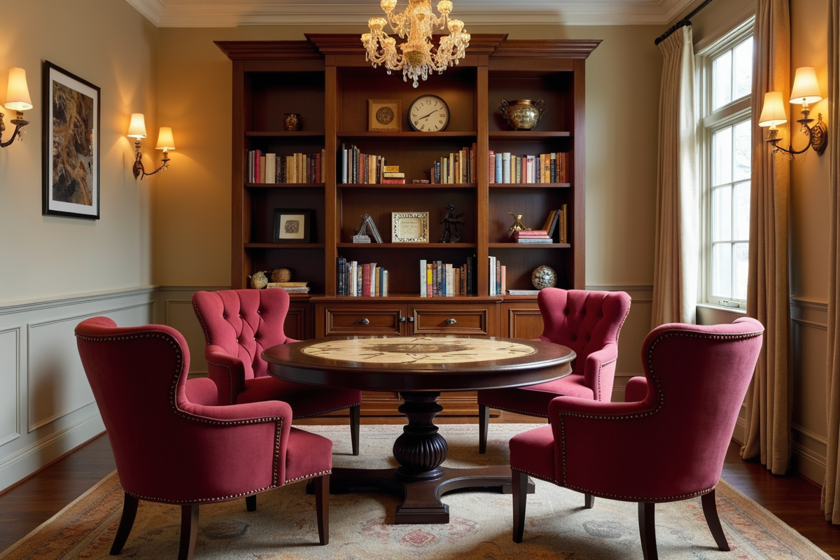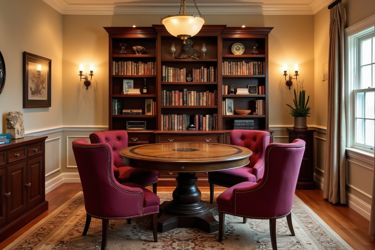 warm lighting office interior burgundy accents play area vintage office play area round game table bookshelf