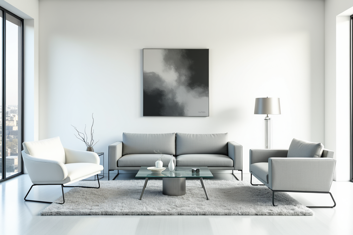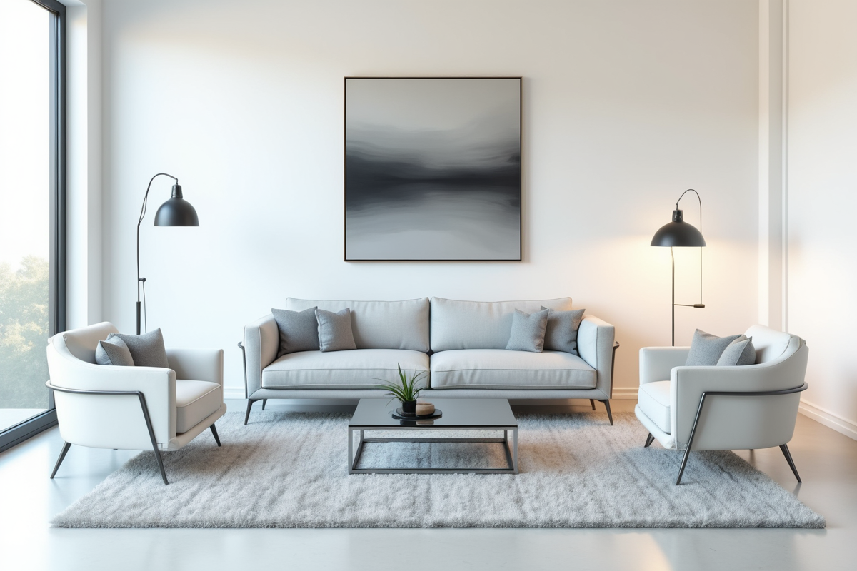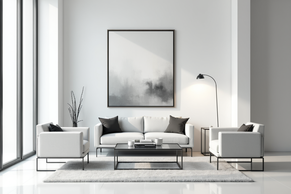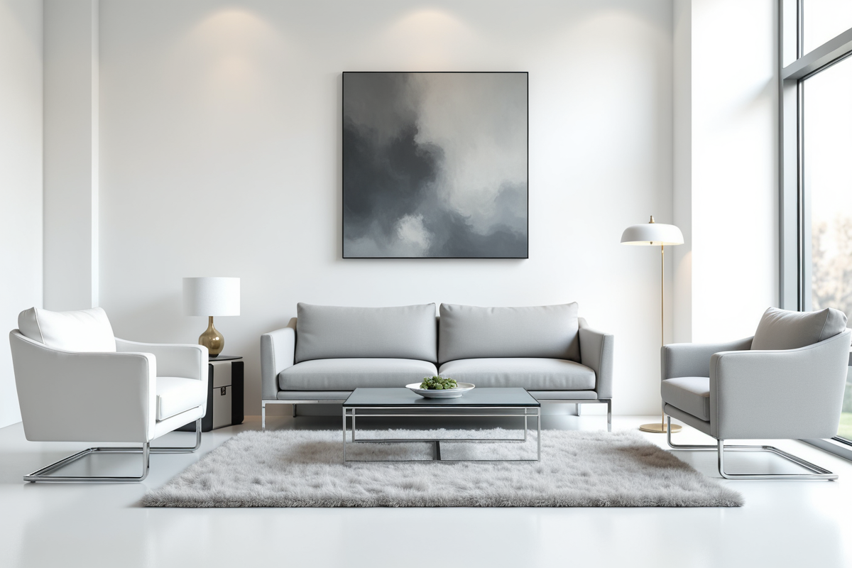 Minimalistic Design lounge area office interior floor-to-ceiling windows modern office lounge light gray sofa chrome coffee table