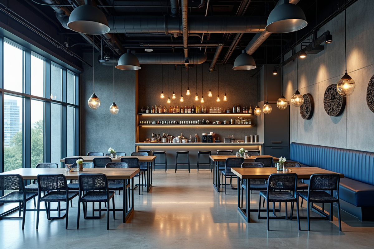 office interior polished concrete cafetaria industrial office cafeteria steel blue accents metal furniture artistic metal decor