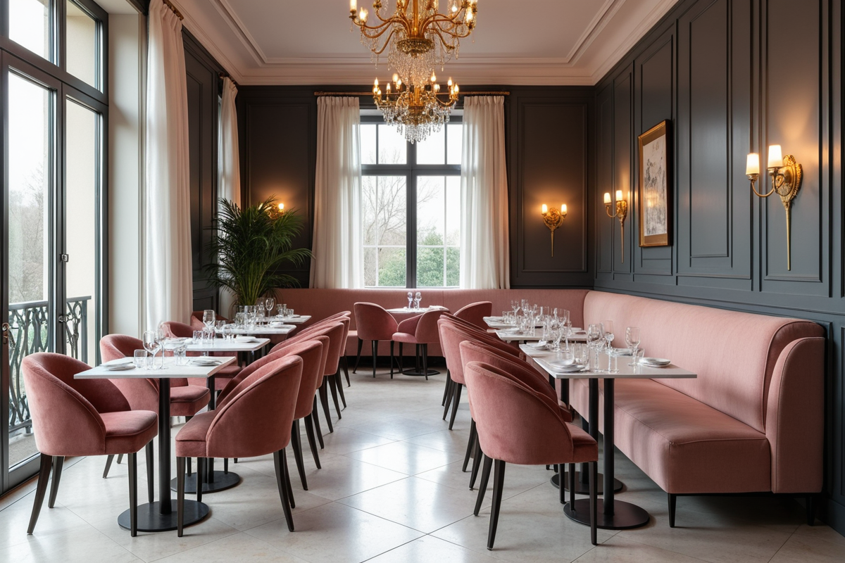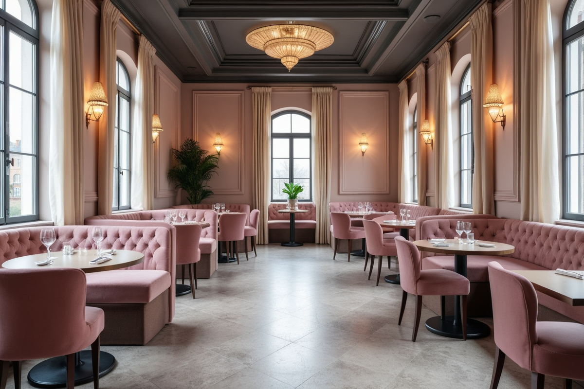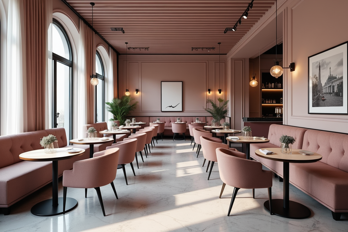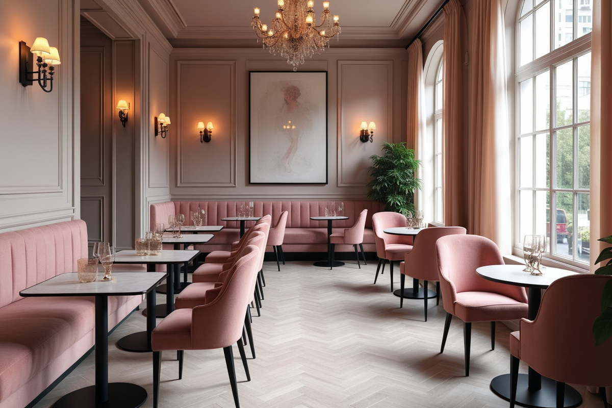 office interior velvet chairs cafetaria Parisian theme cafeteria blush pink and grey bistro tables French decor